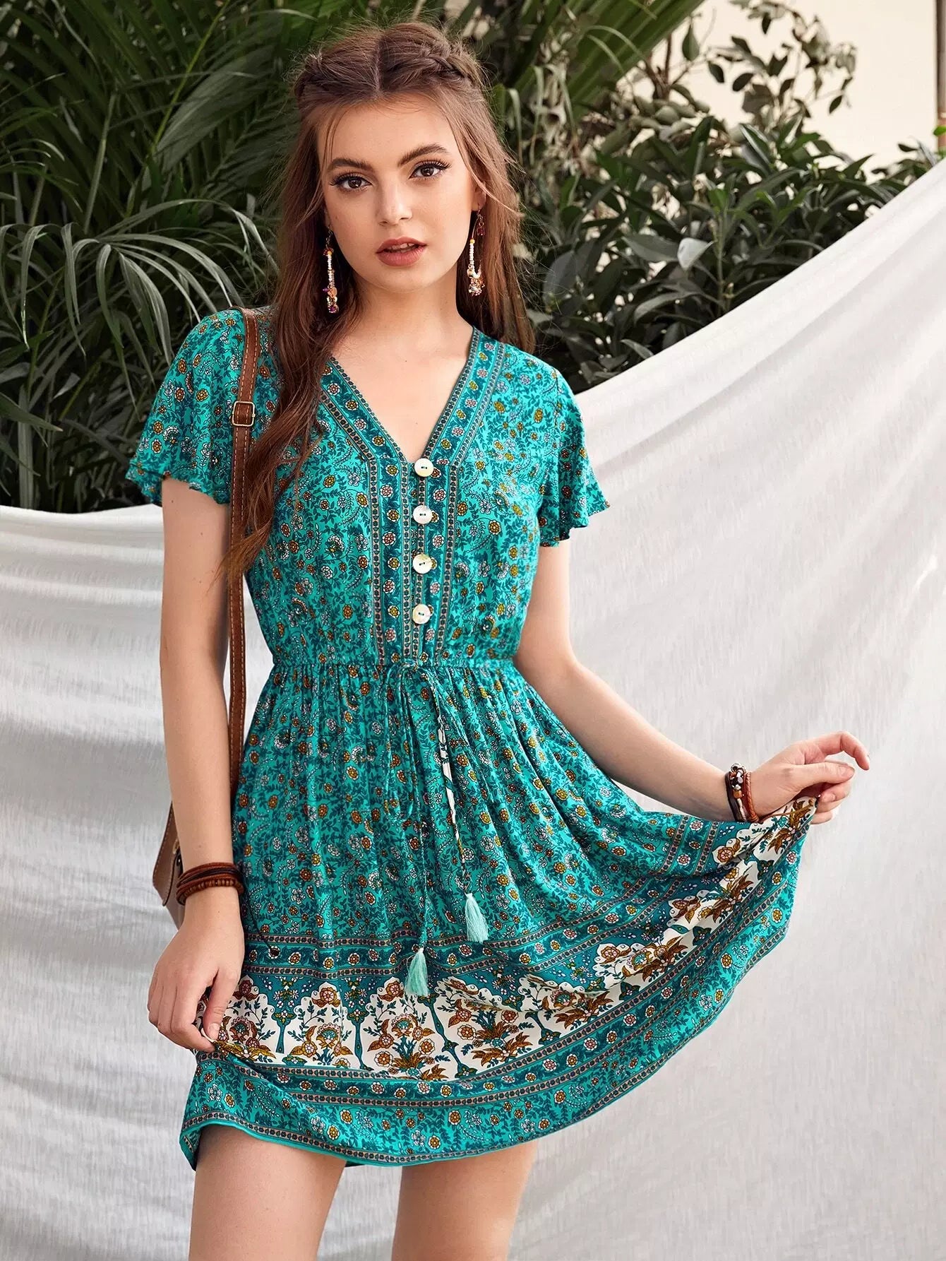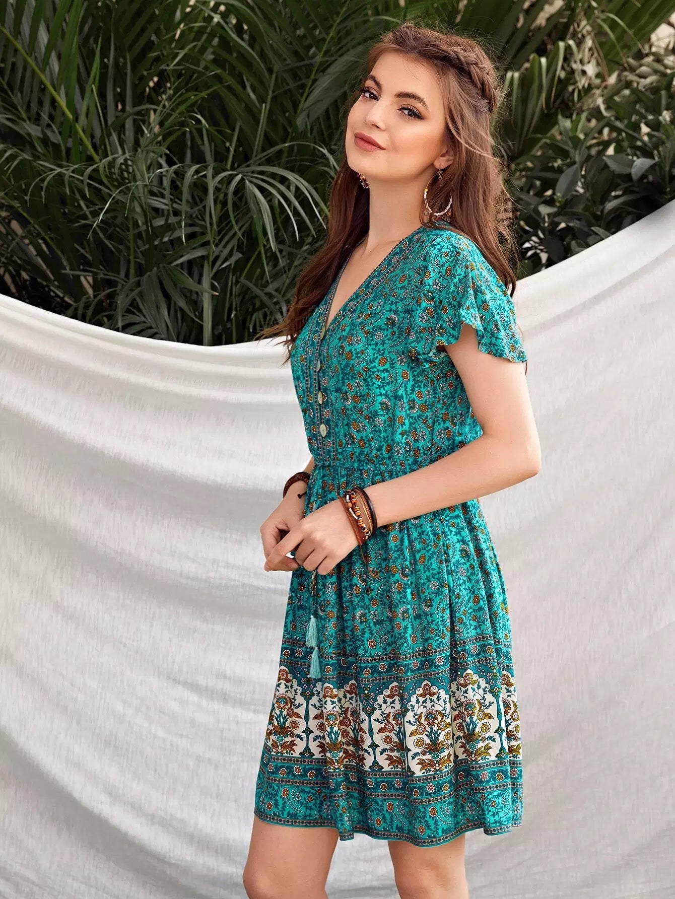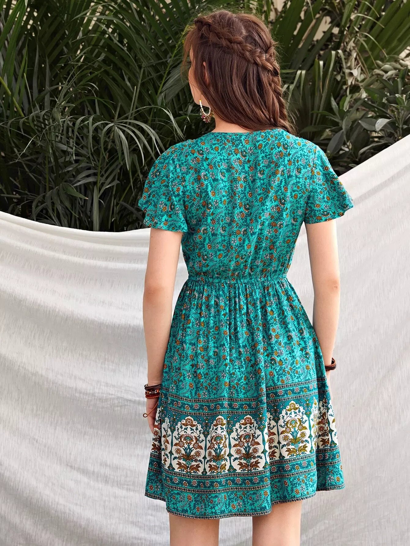 فستان بأكمام على شكل فراشة بياقة على شكل فراشة وعقدة خصر زهرية