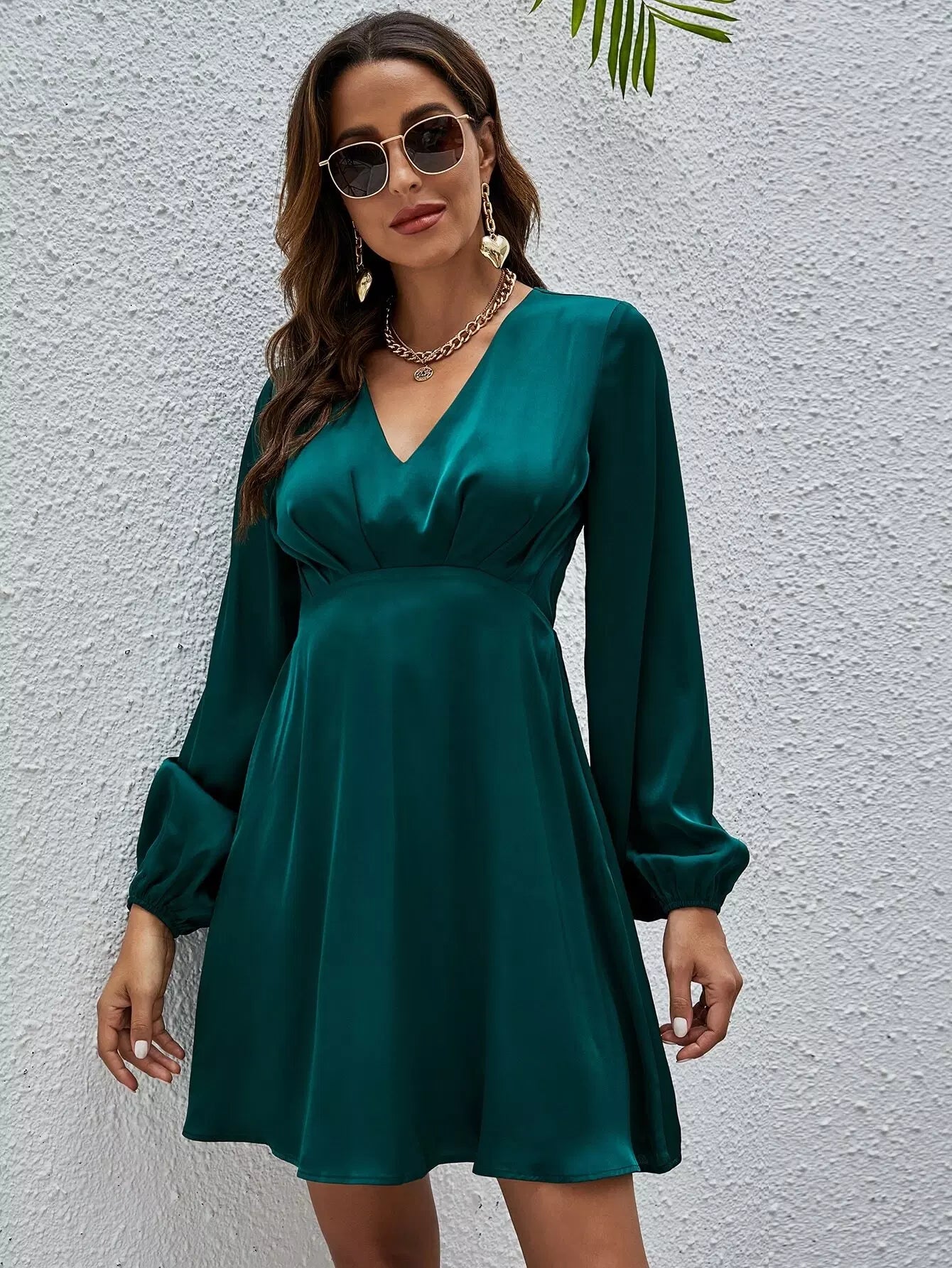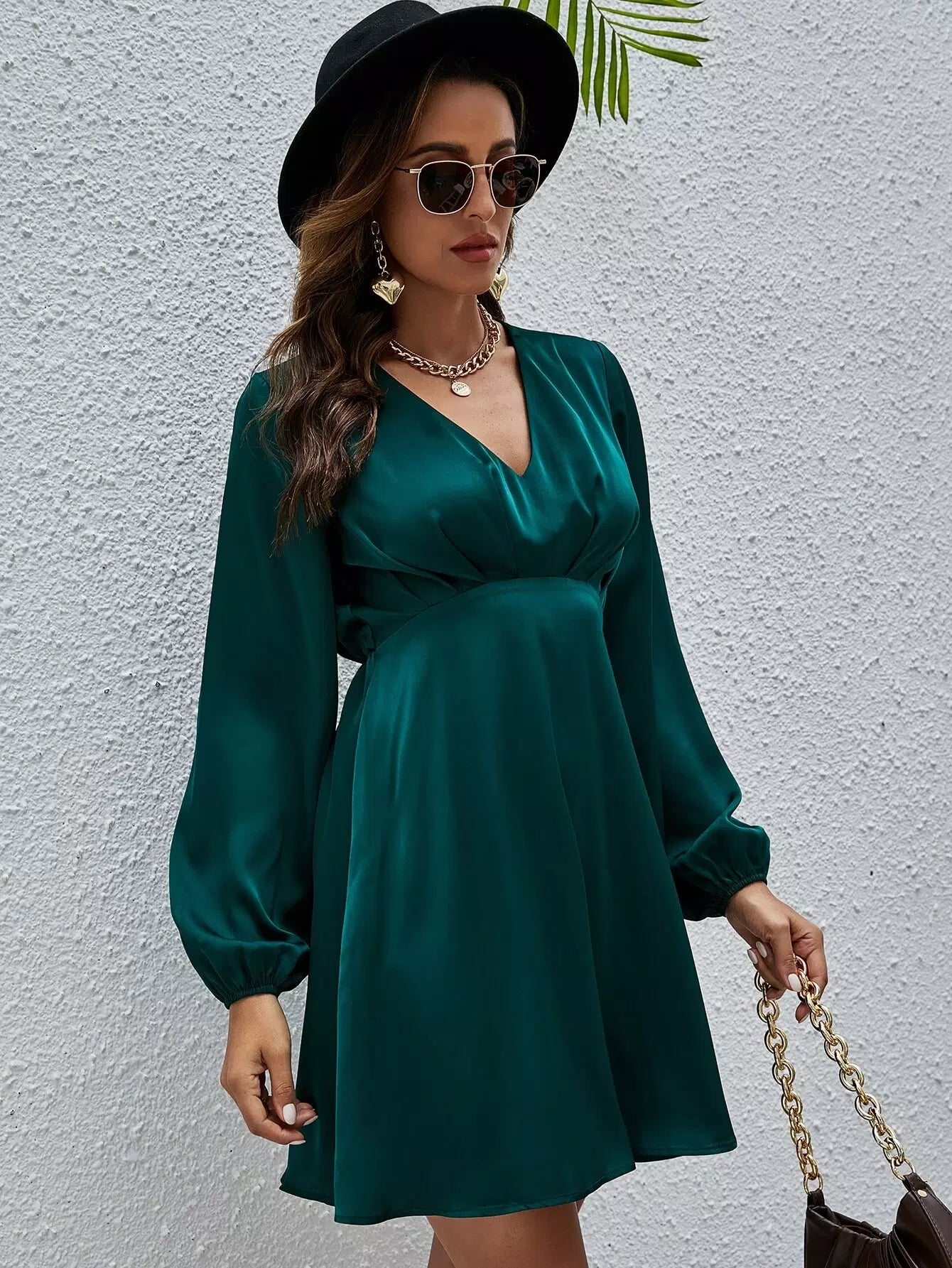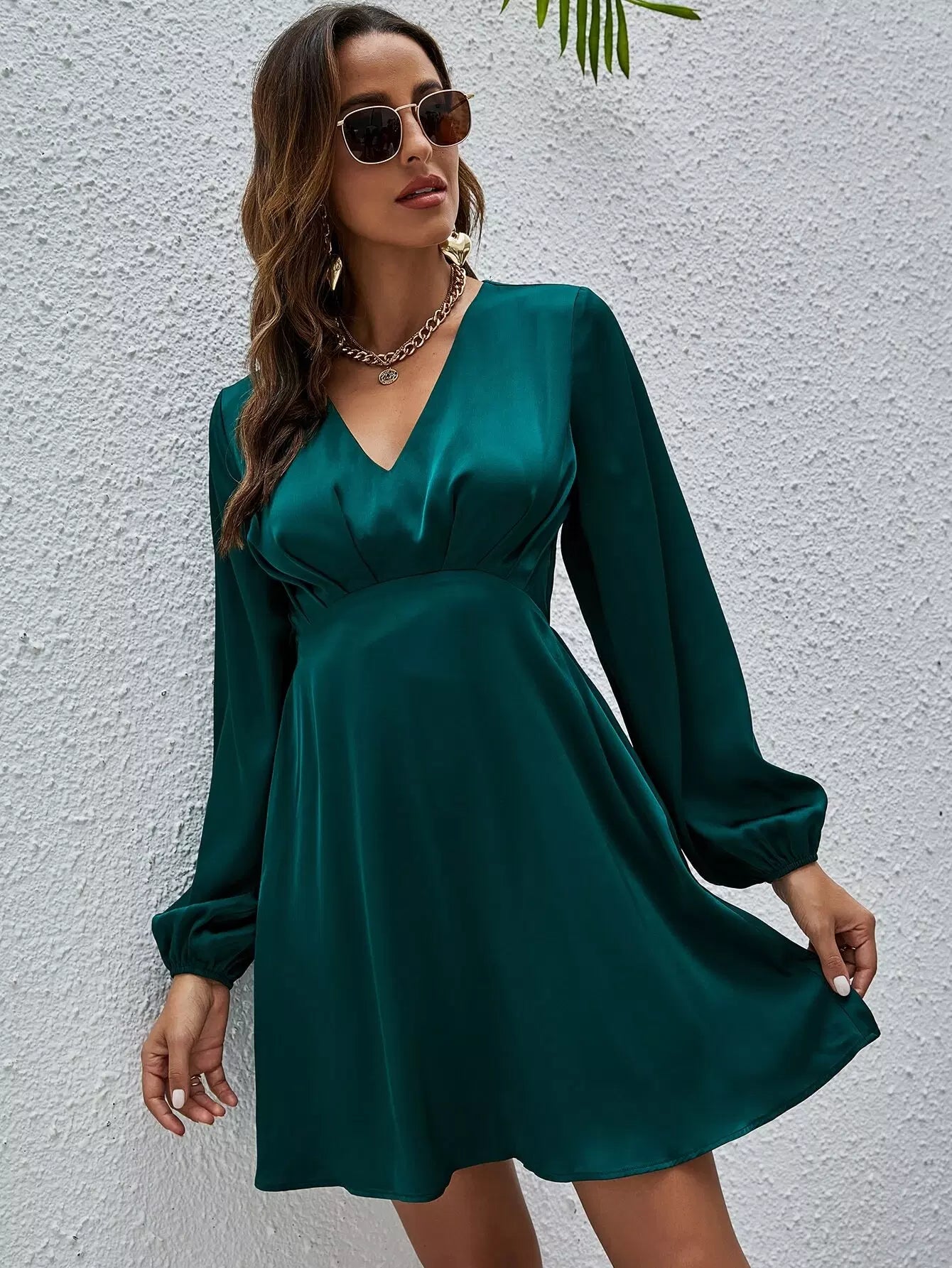 فستان ساتان بأكمام من الساتان برقبة على شكل V
