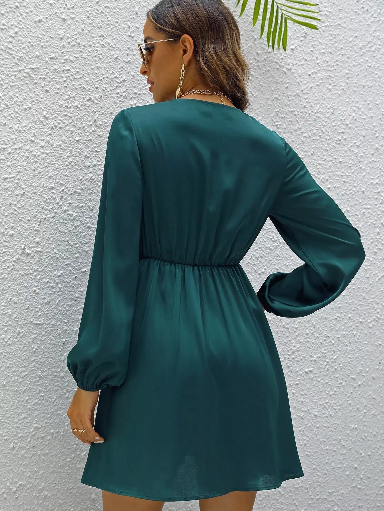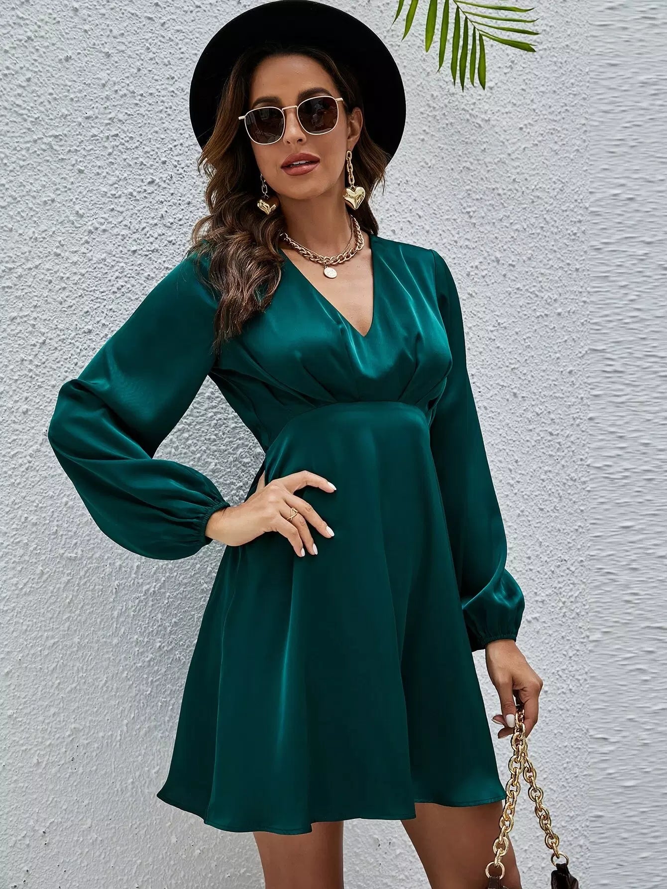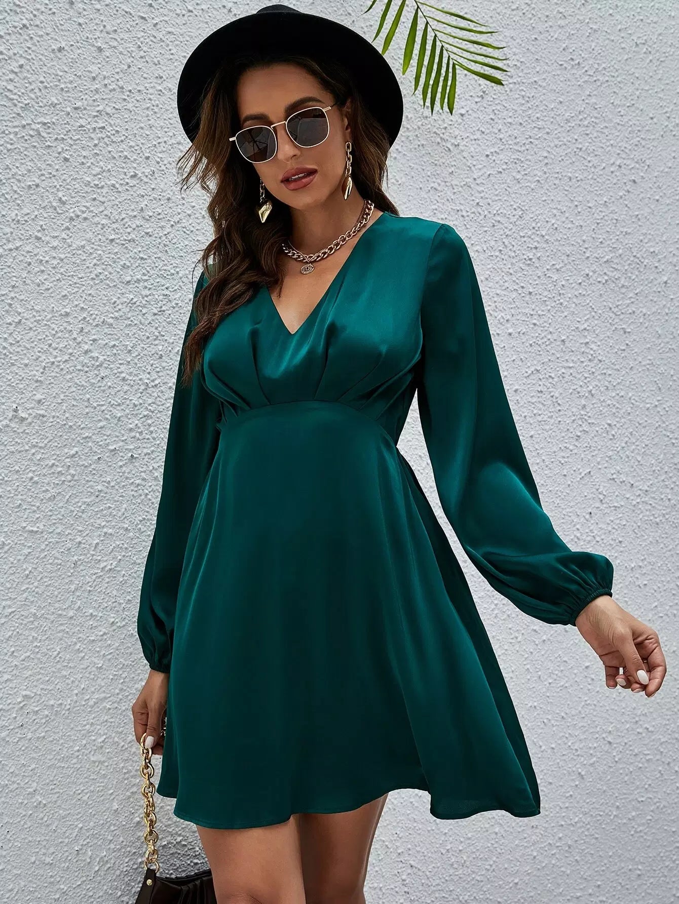 فستان ساتان بأكمام من الساتان برقبة على شكل V