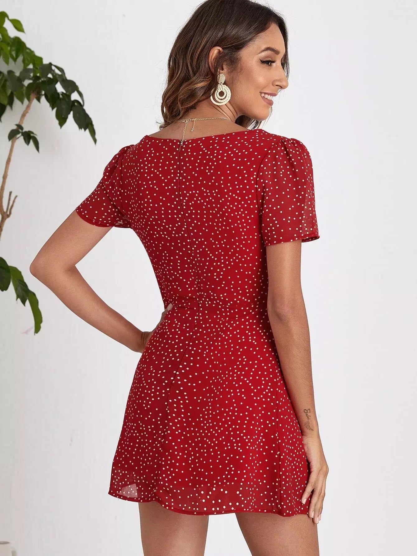 فستان قصير منقّط على شكل V بياقة على شكل حرف A