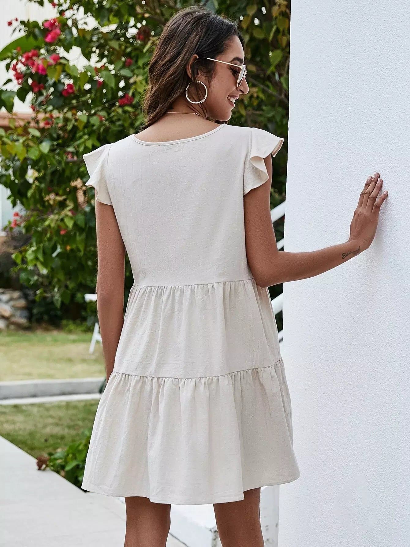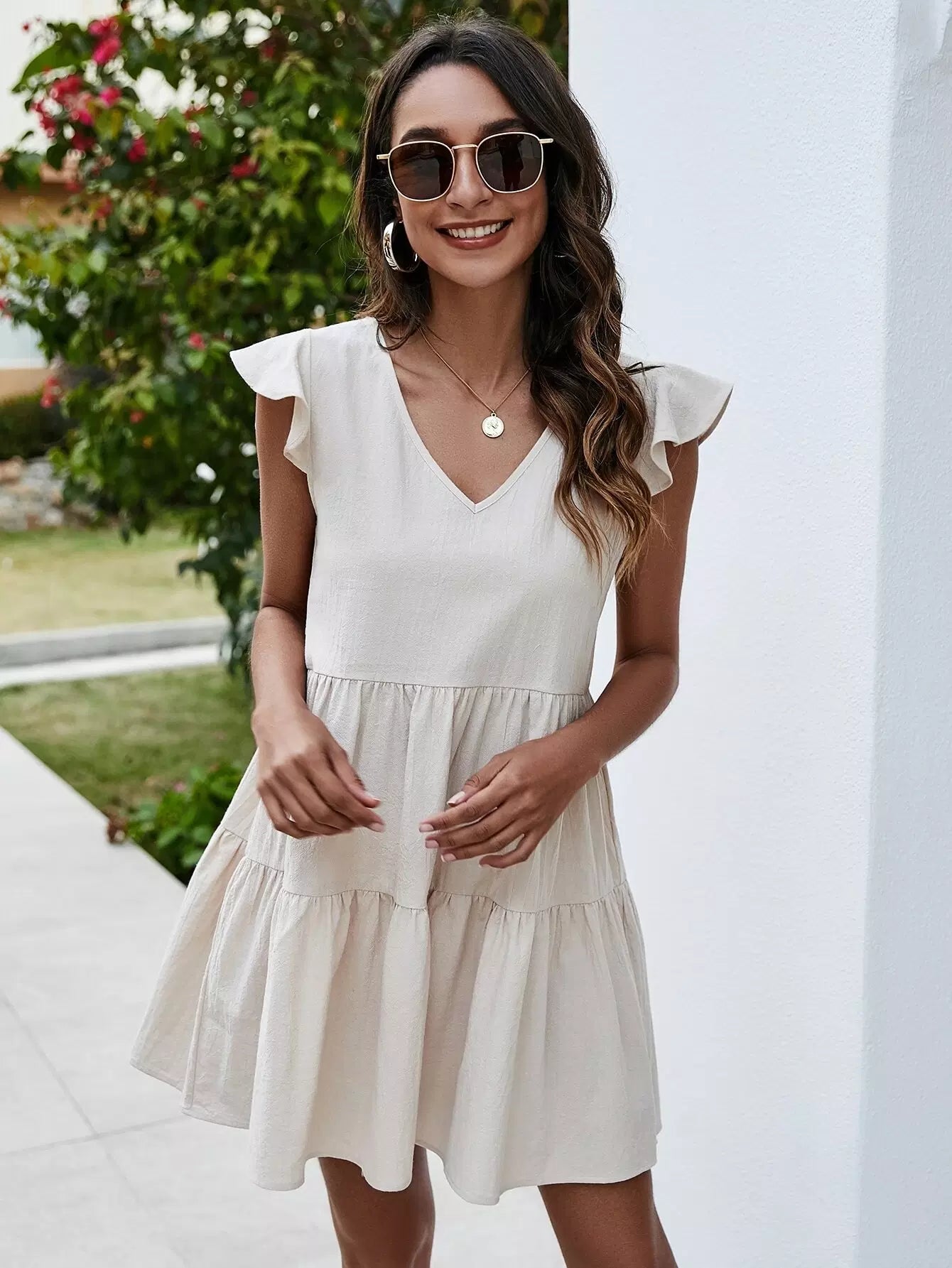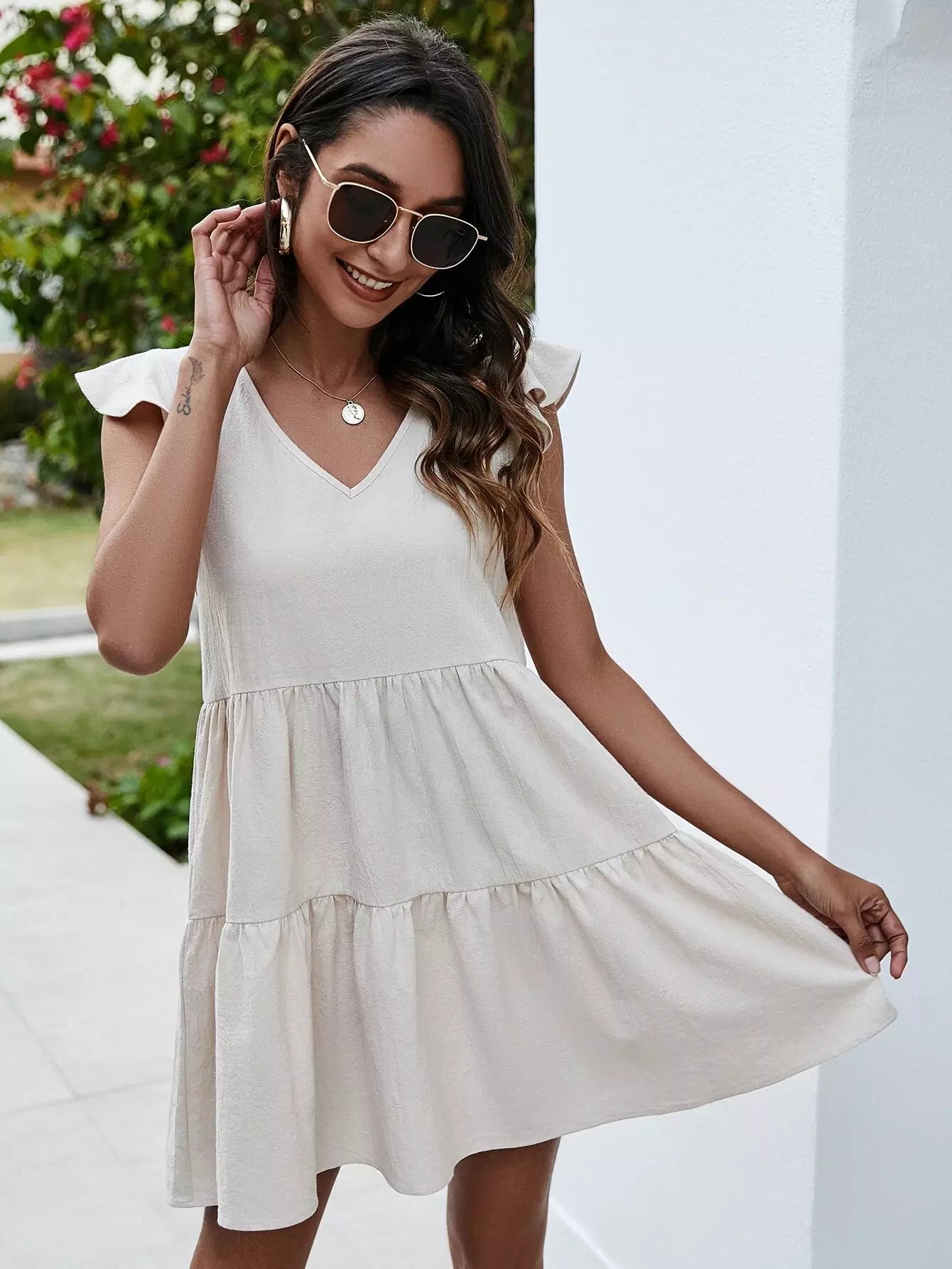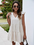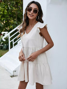 فستان بياقة على شكل حرف V مزين بكشكش على شكل حرف V