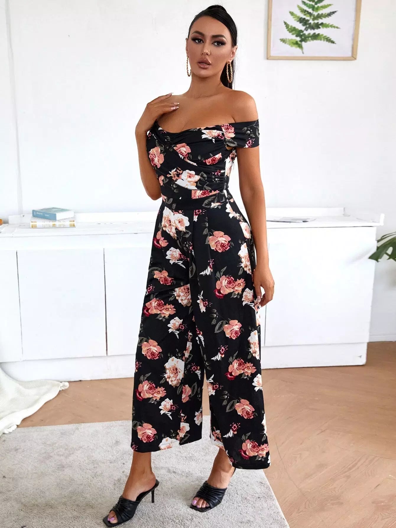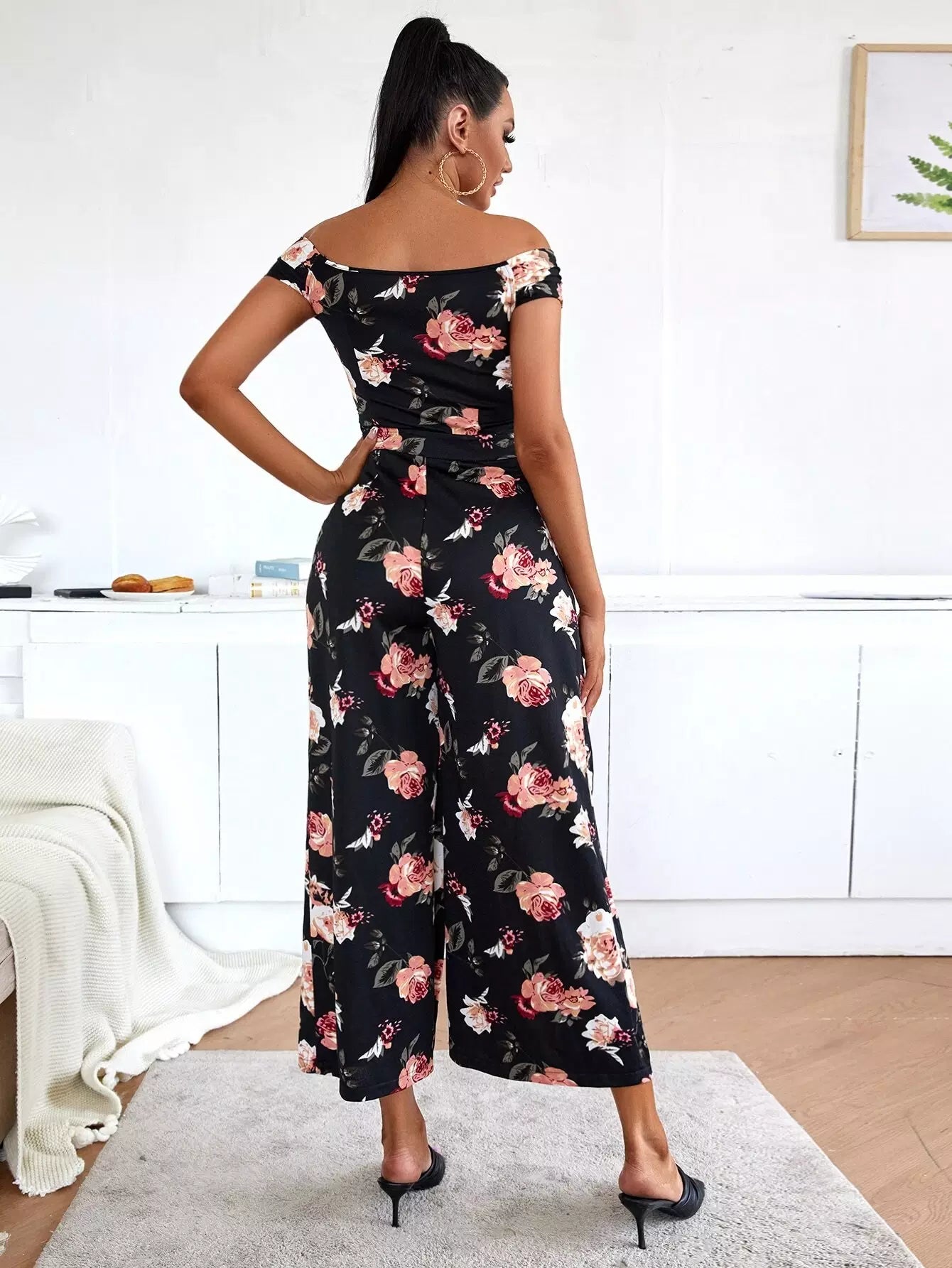 جمبسوت برقبة عريضة الساقين مزينة بالورود بالكامل