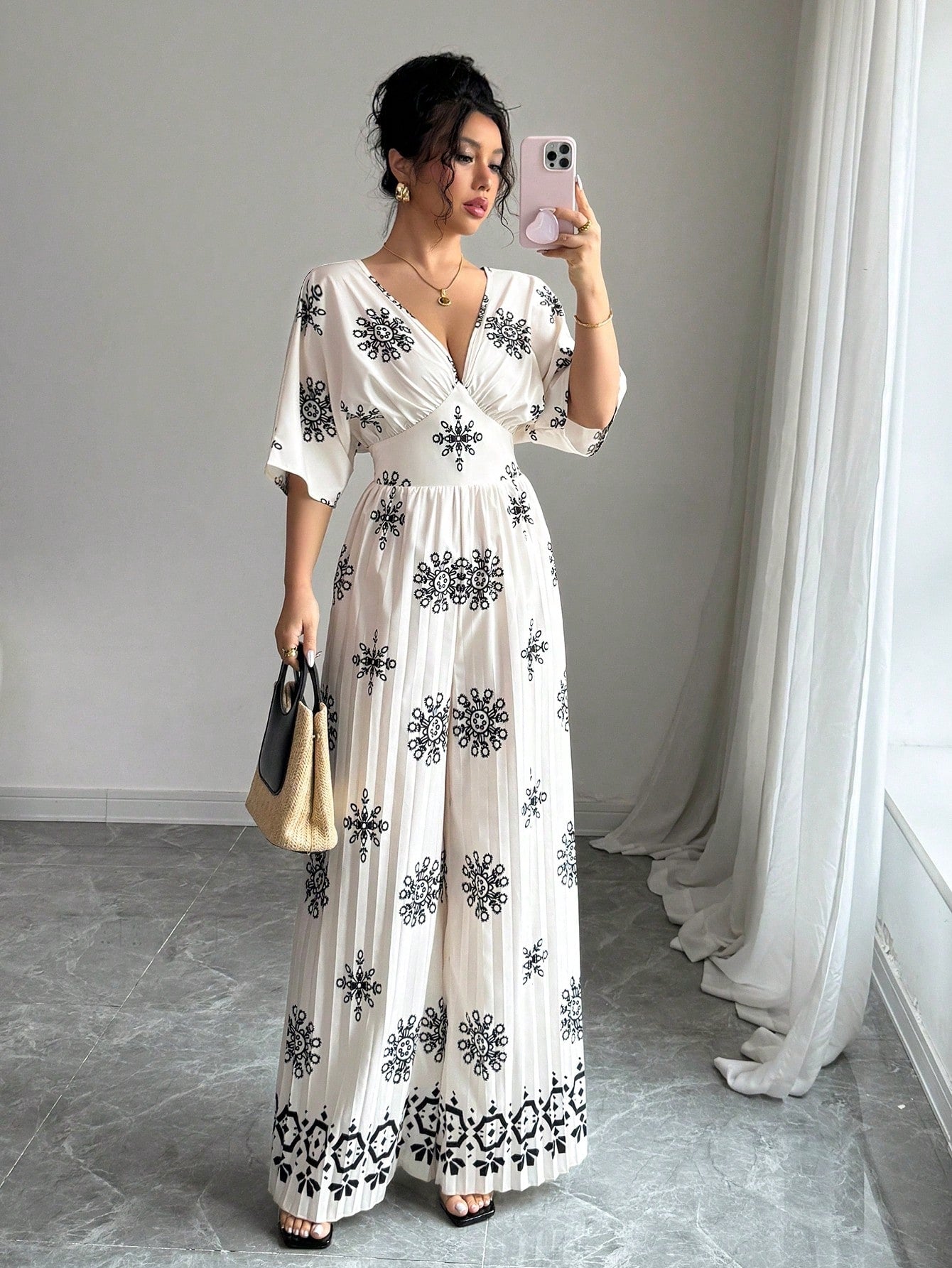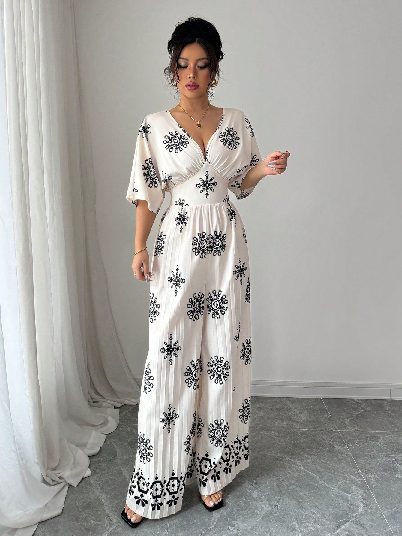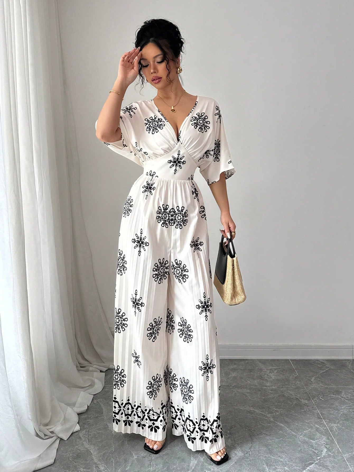 Chiquease Women's Printed Pleated V-Neck Jumpsuit (Specific Floral Print)