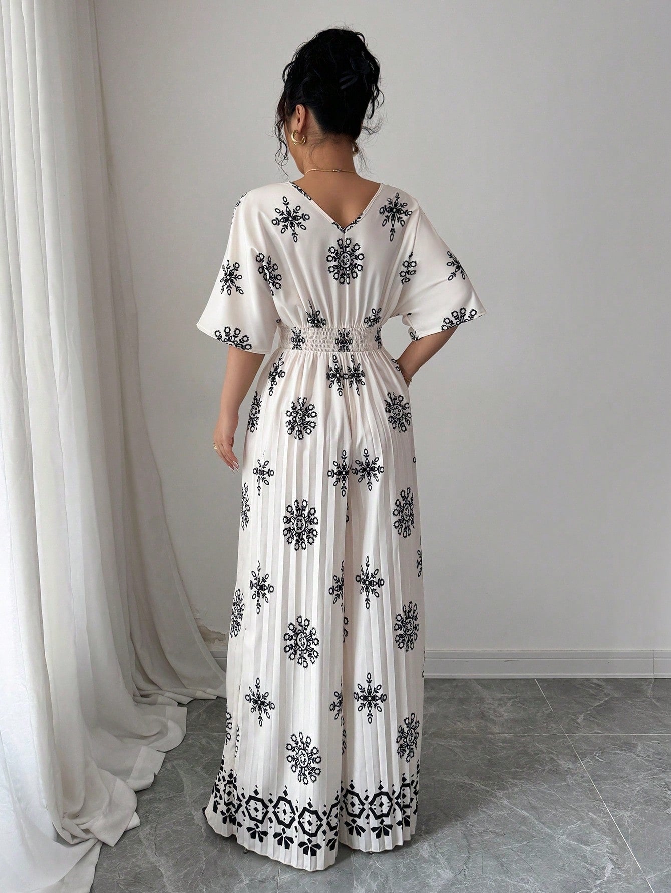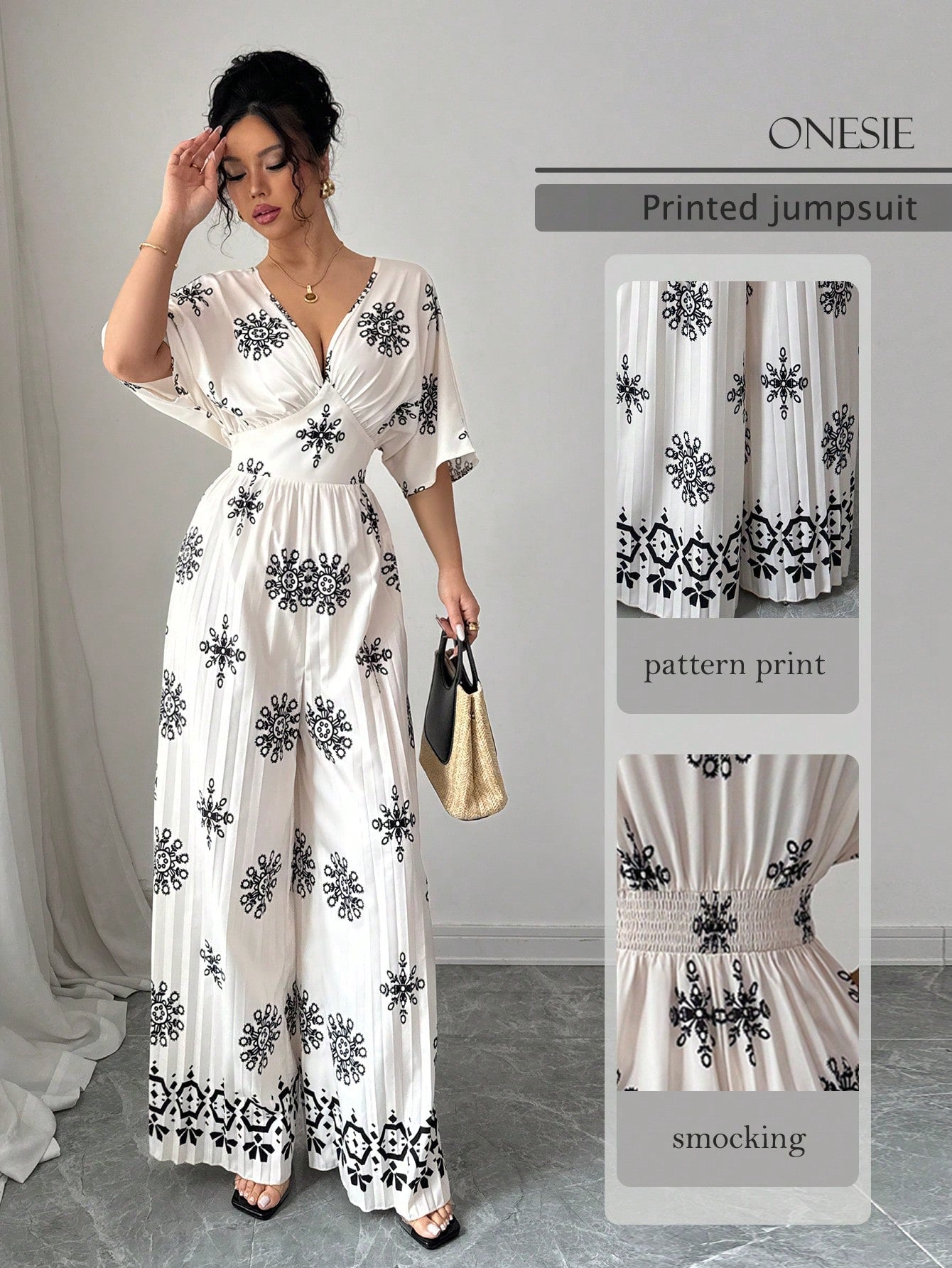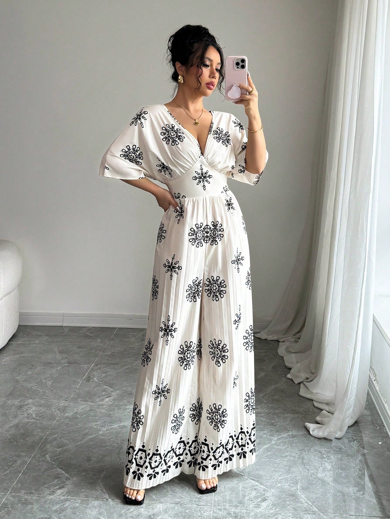 Chiquease Women's Printed Pleated V-Neck Jumpsuit (Specific Floral Print)