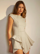 COSMINA Khaki Women's Round Neck Puff Sleeve Ruffle Hem Romper