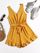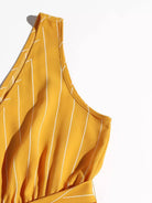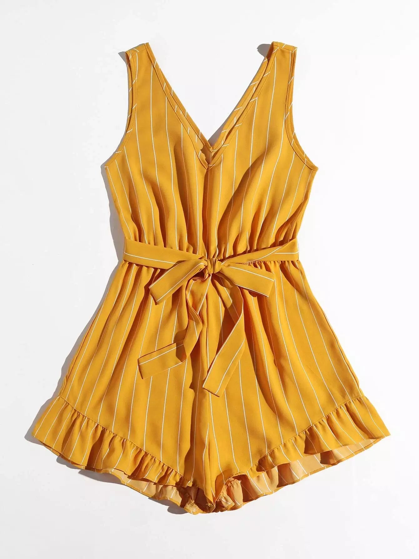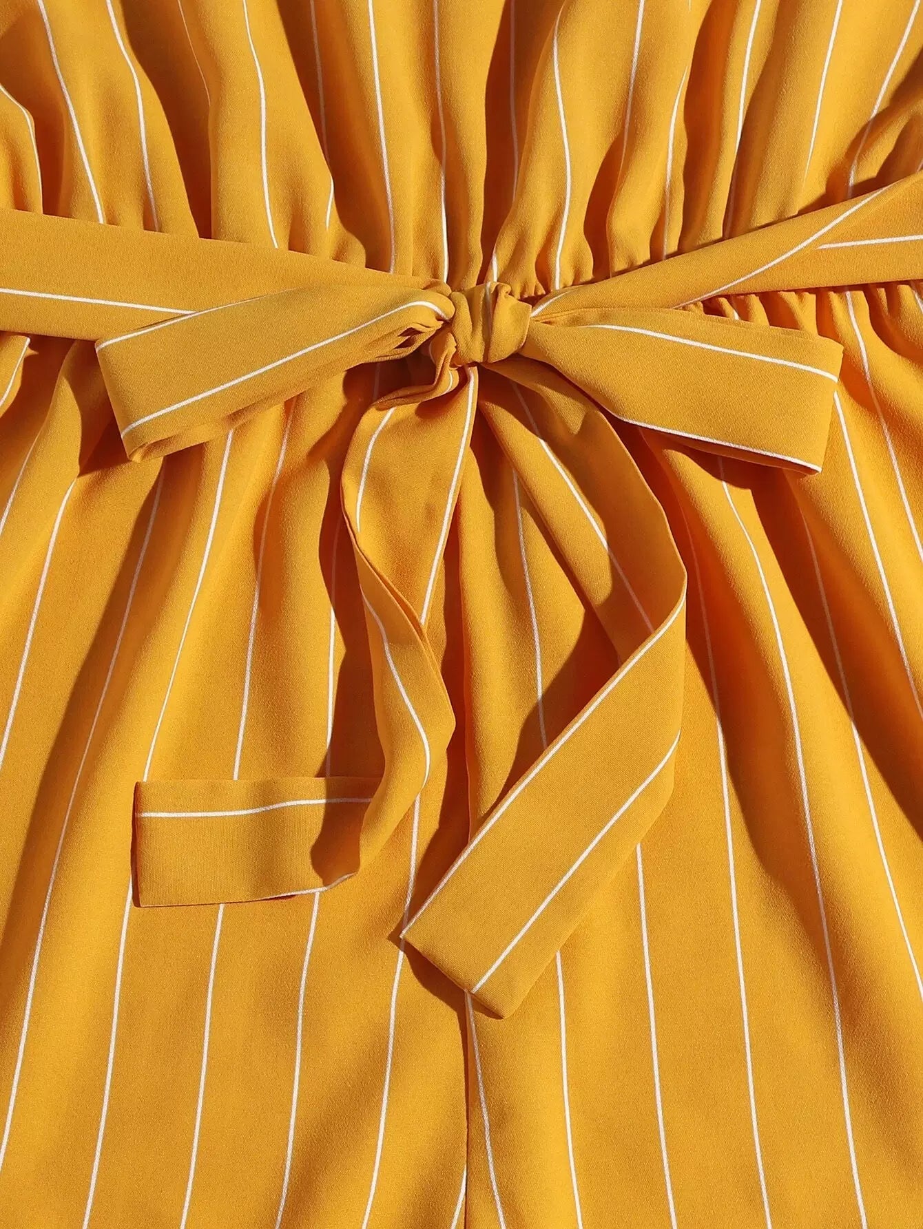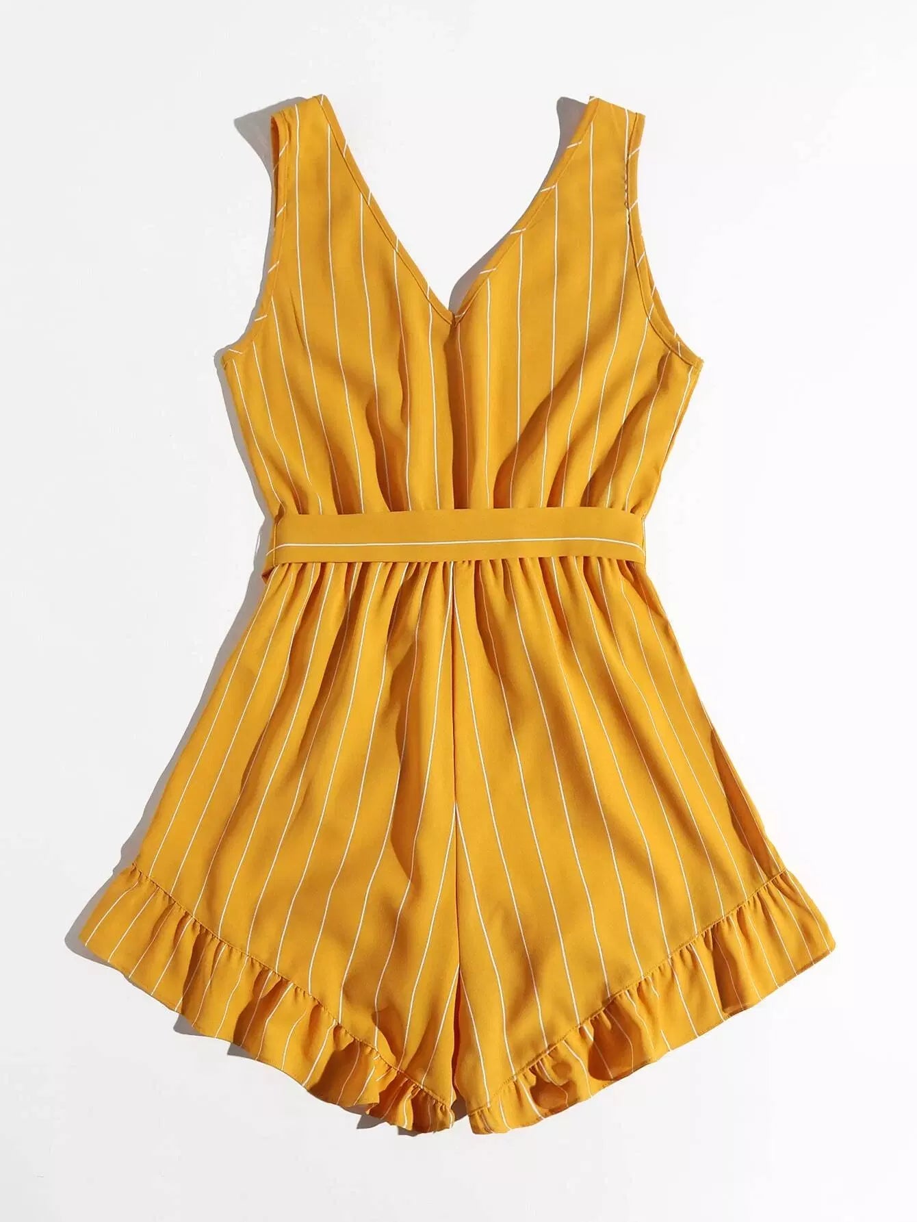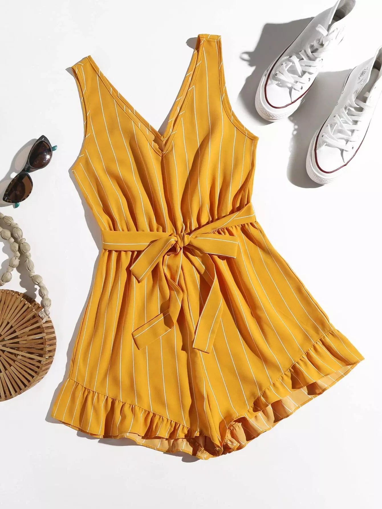 رومبير مخطط بحاشية مكشكشة ورقبة على شكل حرف V مزدوج بدون حزام