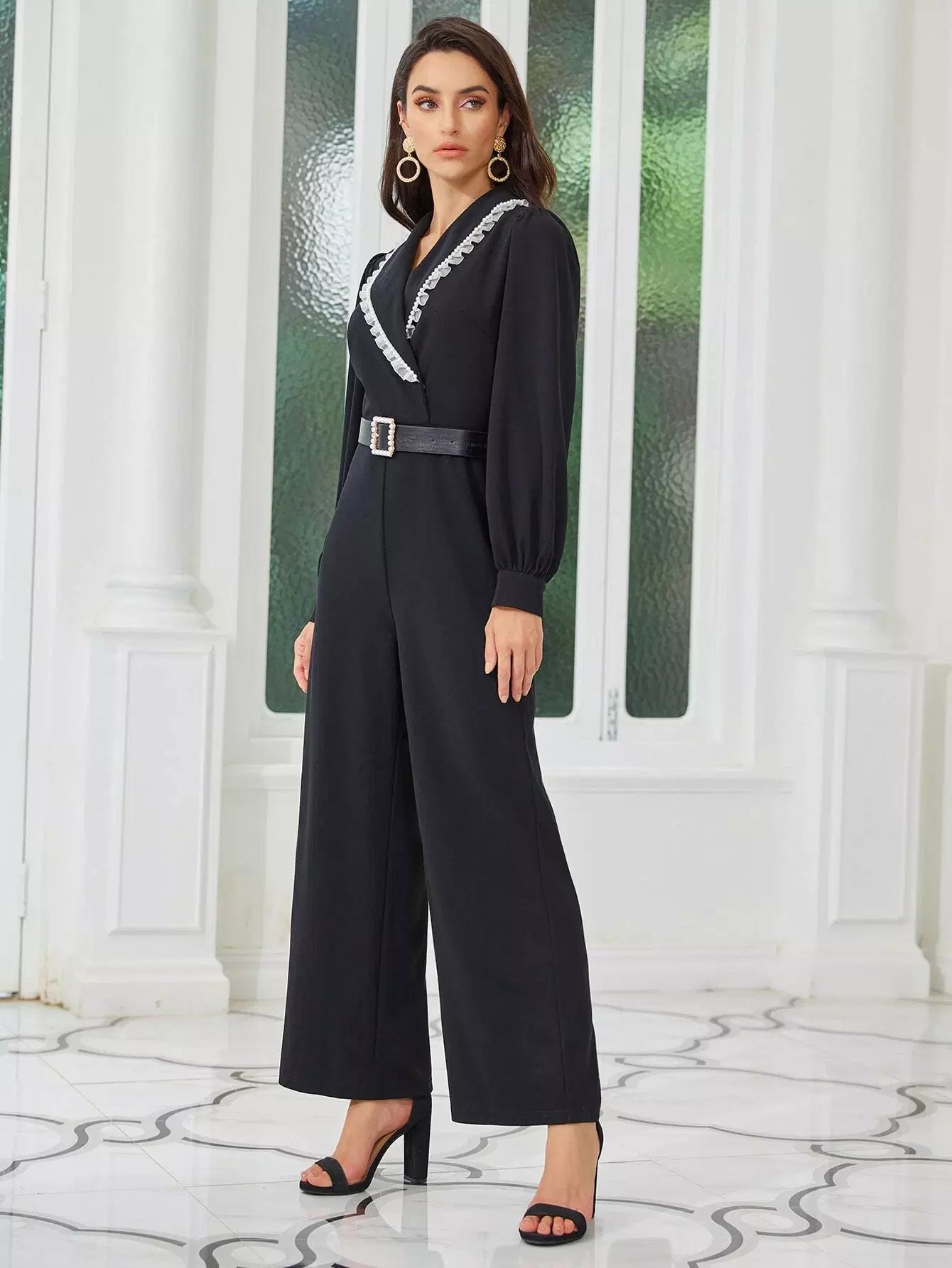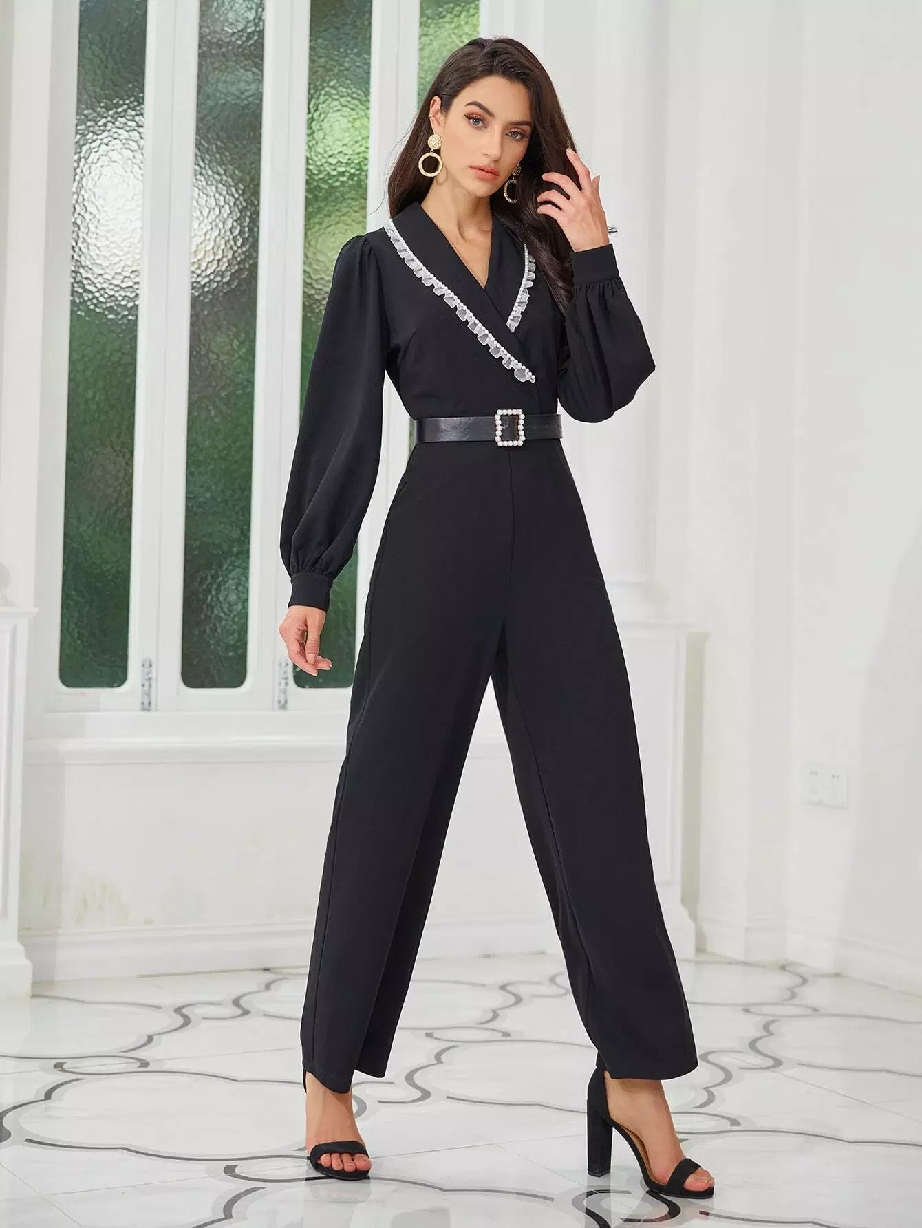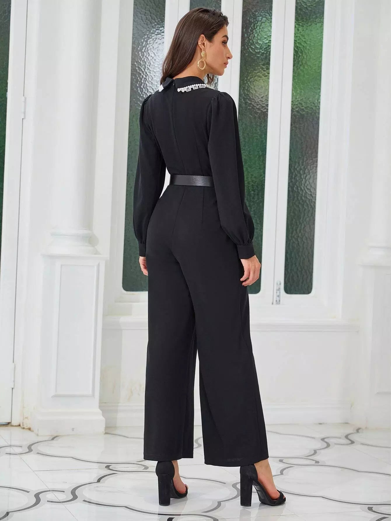 بذلة قميص من جلد البولي يوريثان مطرز باللؤلؤ ومطرز بشكل متباين بدون حزام