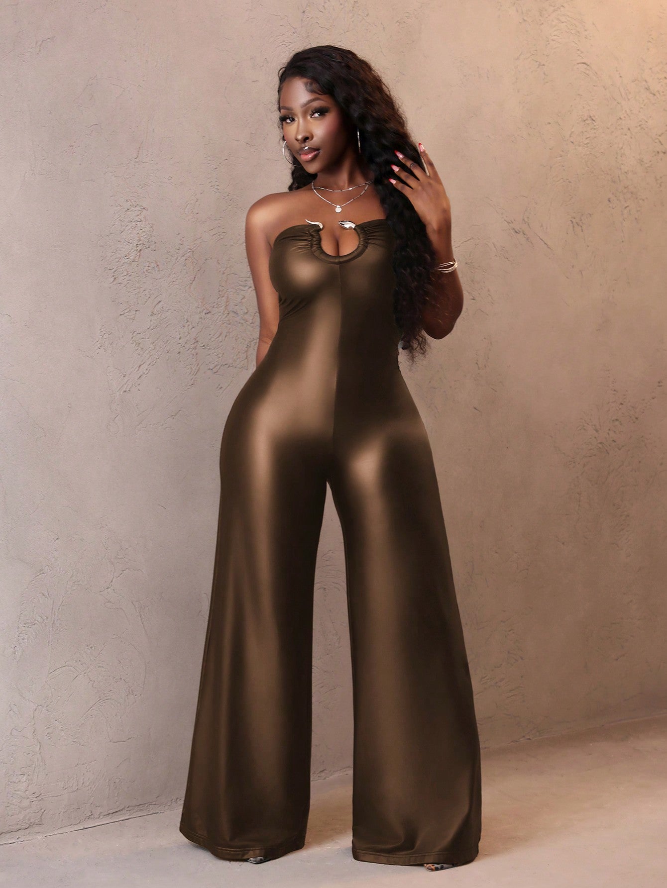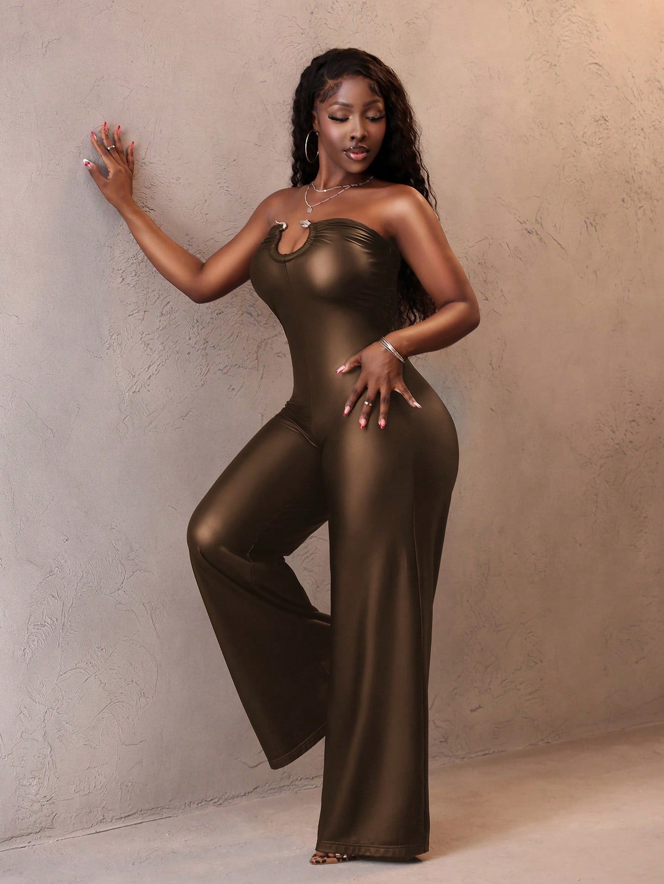 Slaydiva Elegant Sexy Streetwear Party Metallic Decor PU Elastic Skinny Jumpsuit With Cutout Waist And