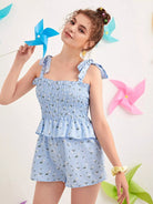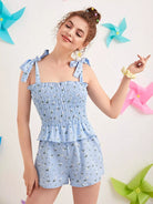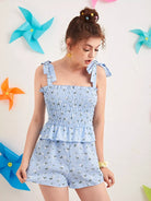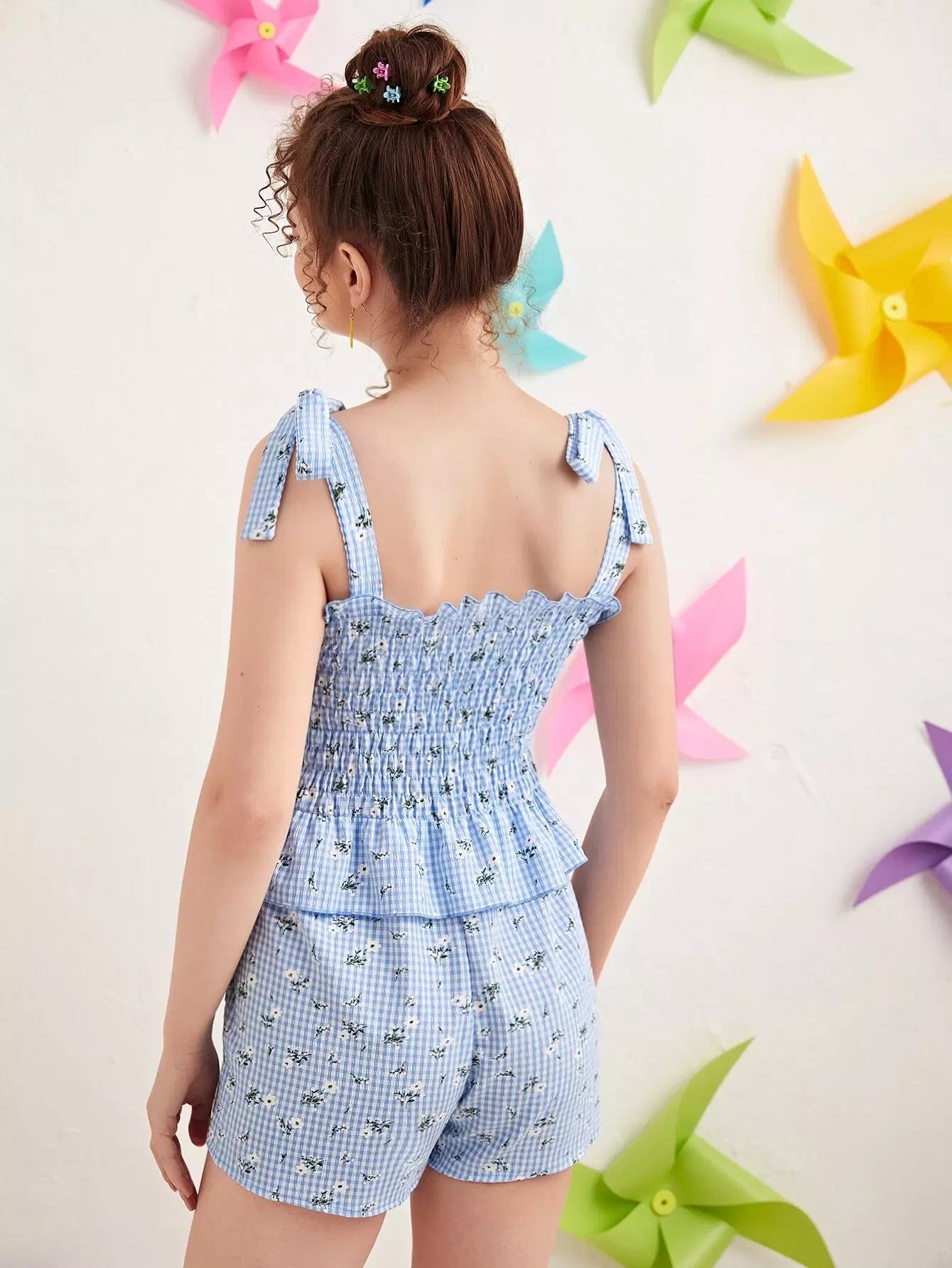 للنساء - رومبر كامي مكشكش بأكتاف مربوطة مزين بالزهور والجنجهام