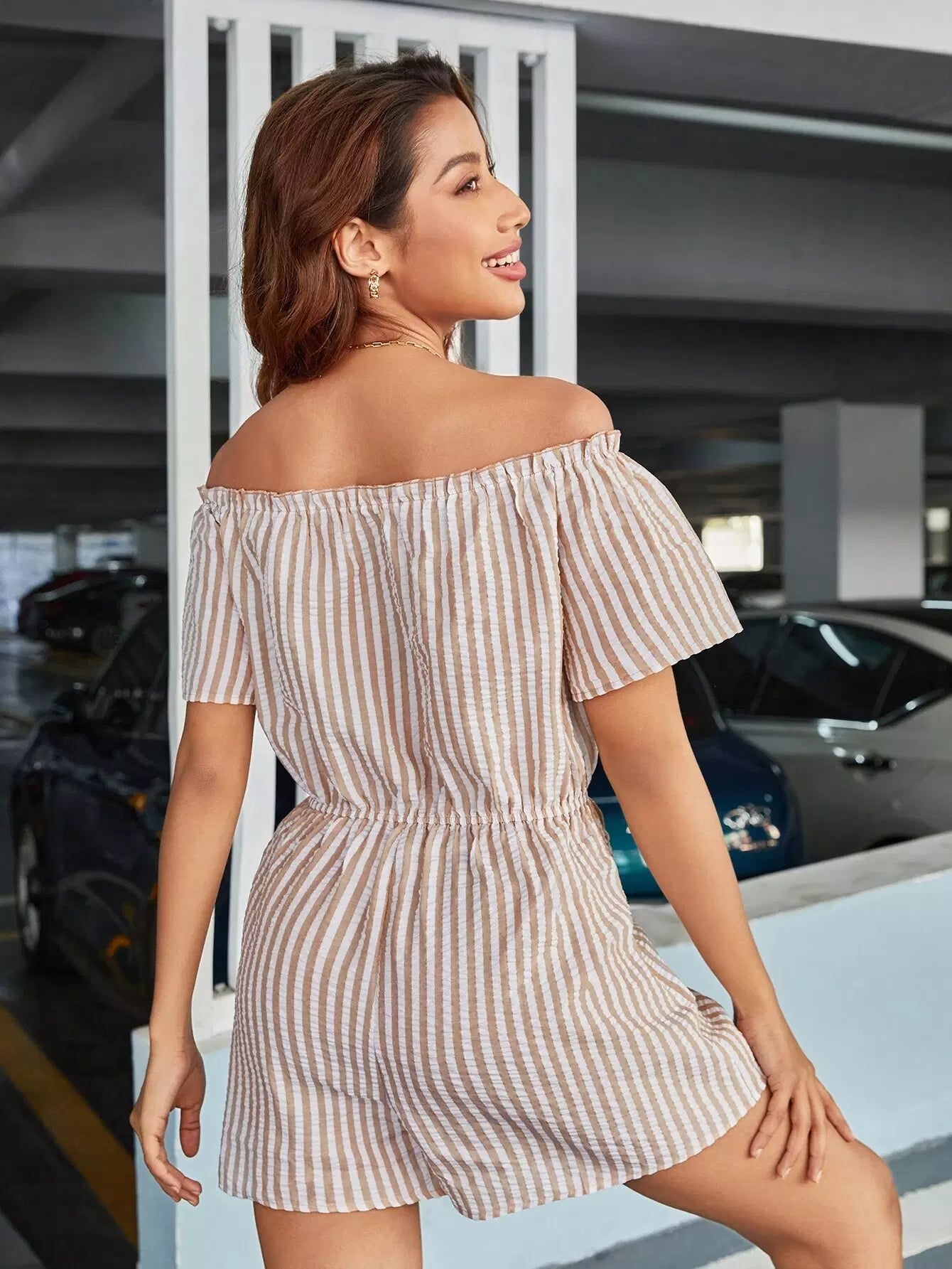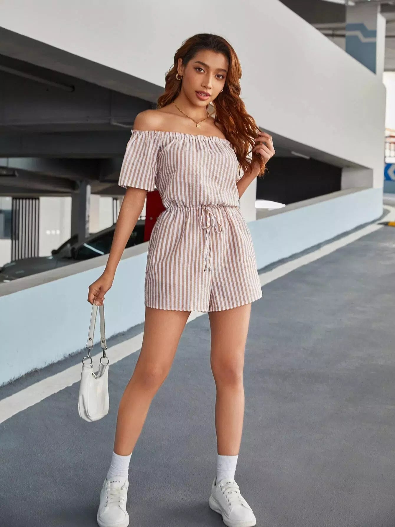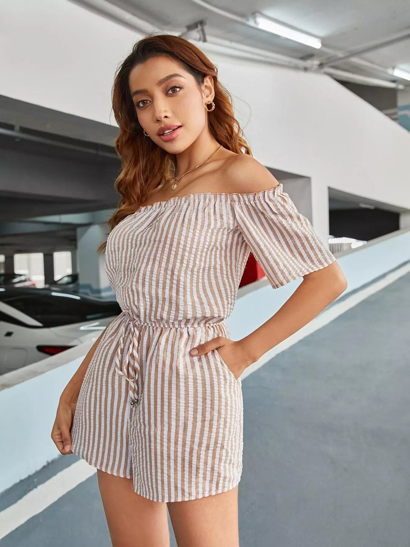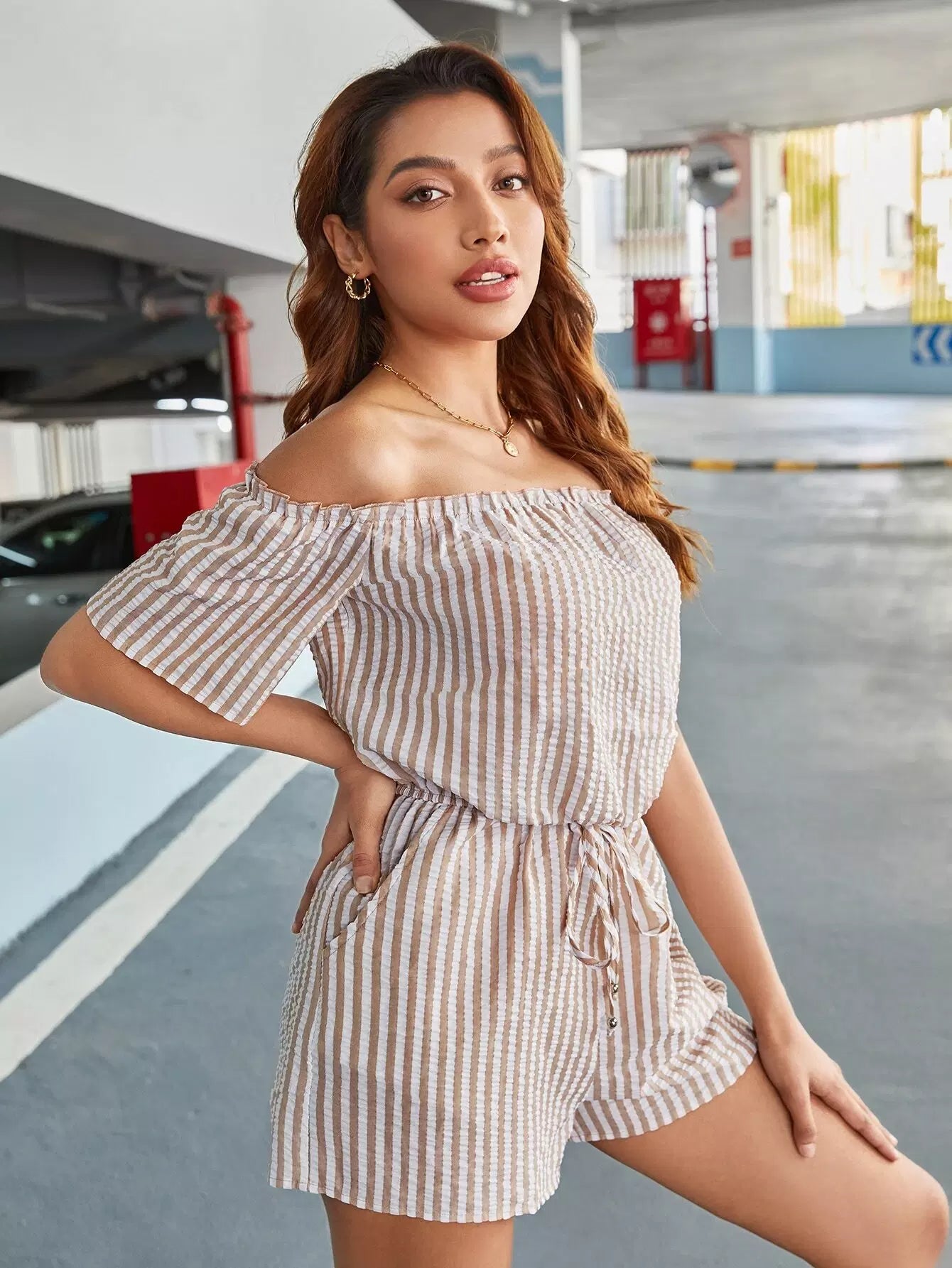 رومبر مخطط عمودي مع أكتاف مكشوفة وحواف كشكش وعقدة أمامية