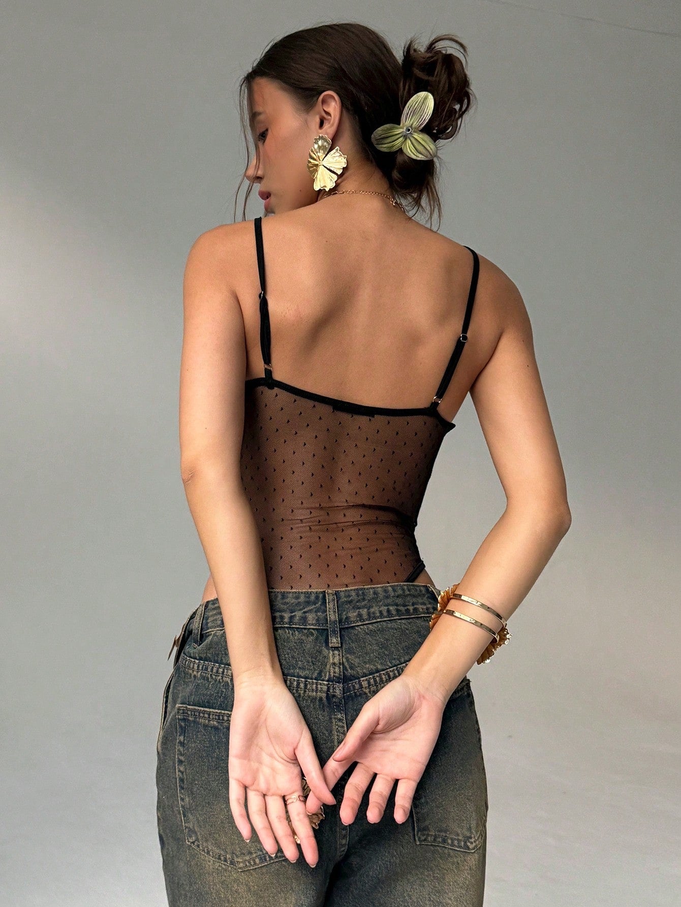 بدلة جسم نسائية مثيرة من الدانتيل الشبكي المرقع من ألوروه، بحمالات رفيعة