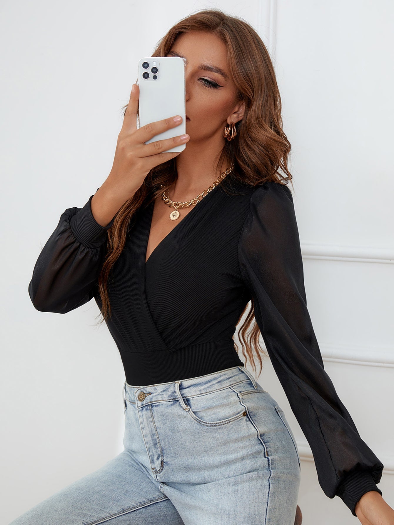 بدلة نسائية أنيقة بأكمام منفوخة من قماش شبكي متباين الألوان، مناسبة لفصل الخريف