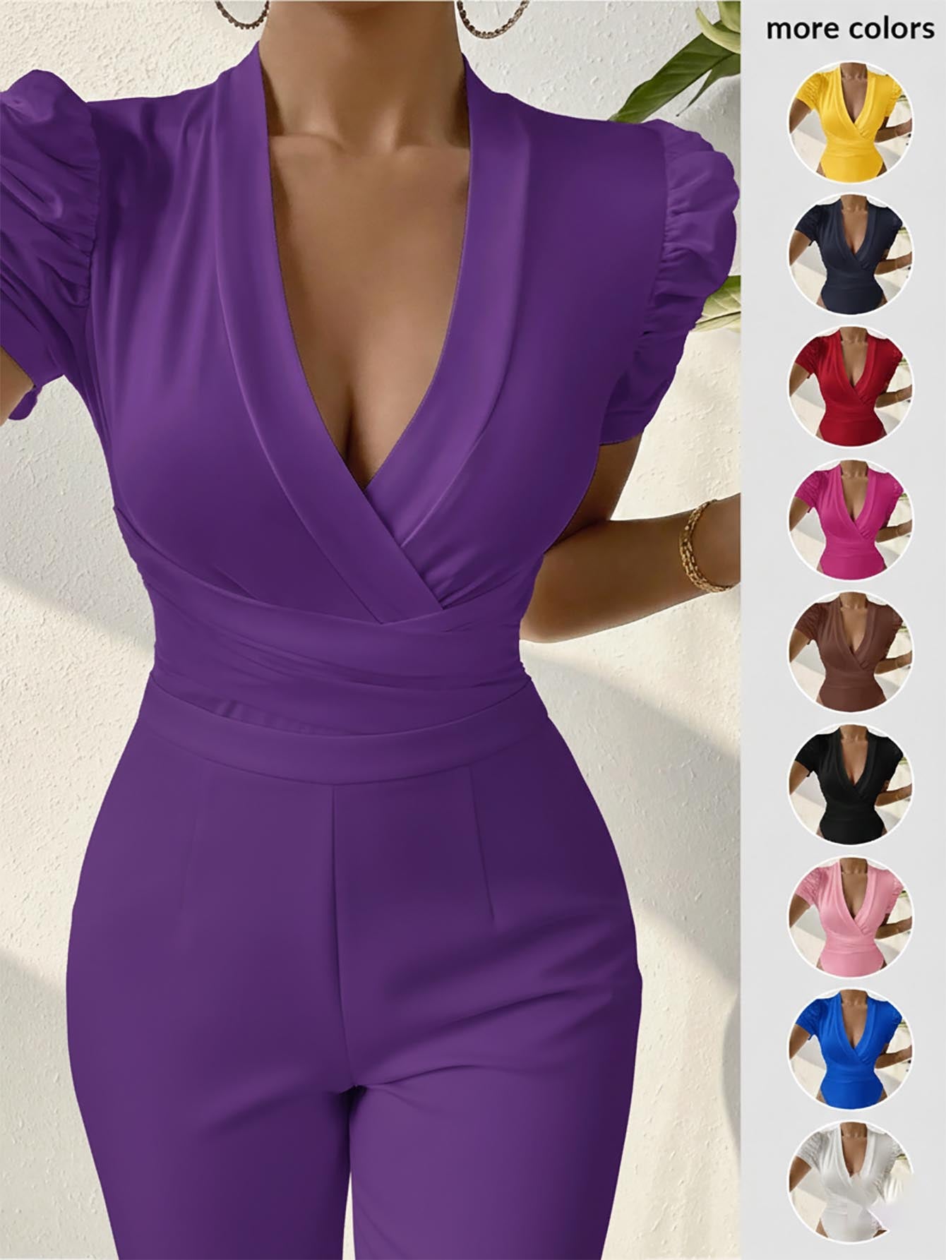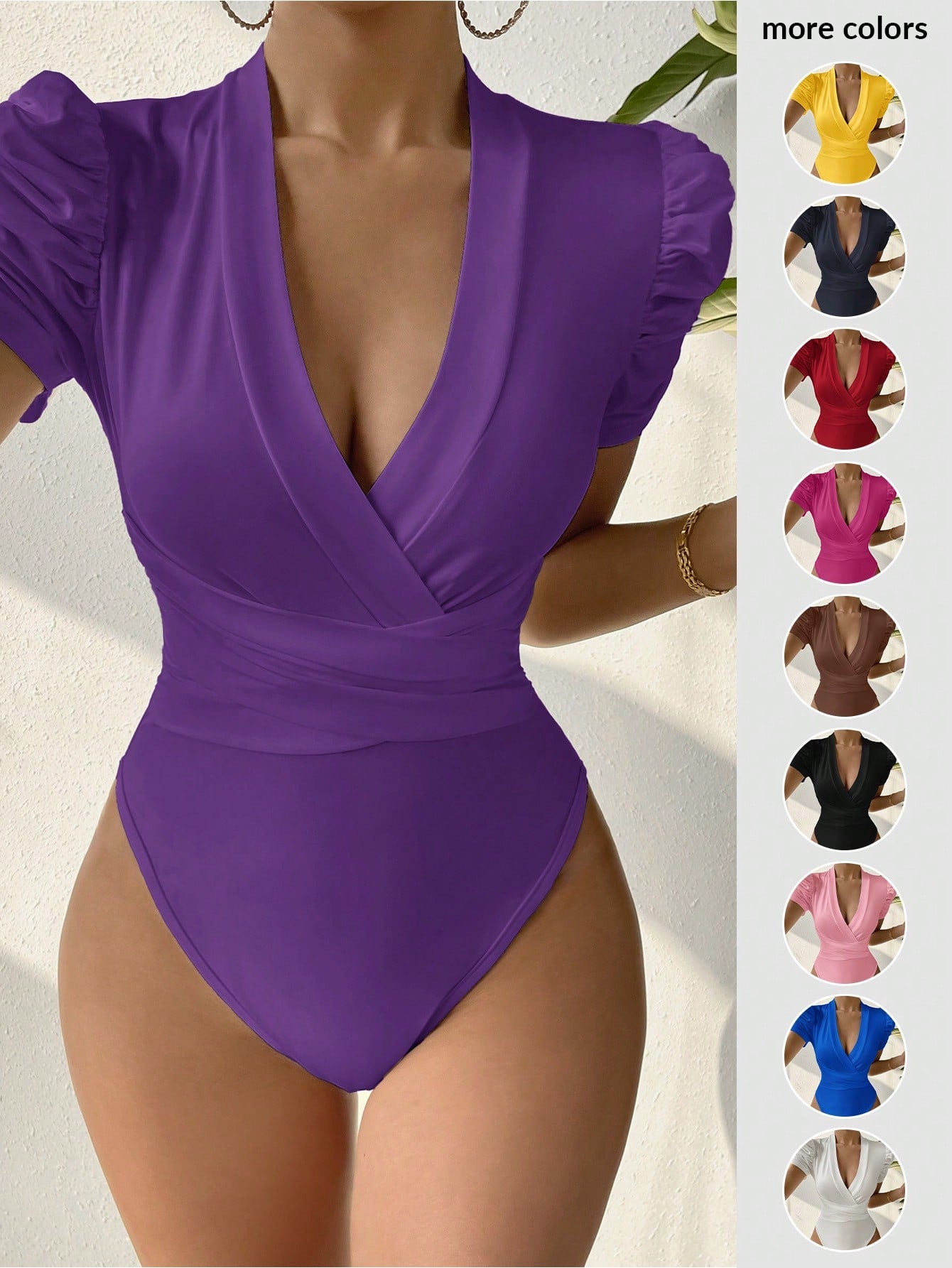 بدلة جسم صيفية من SXY بأكمام منفوخة وفتحة رقبة عميقة بتصميم ملفوف متقاطع