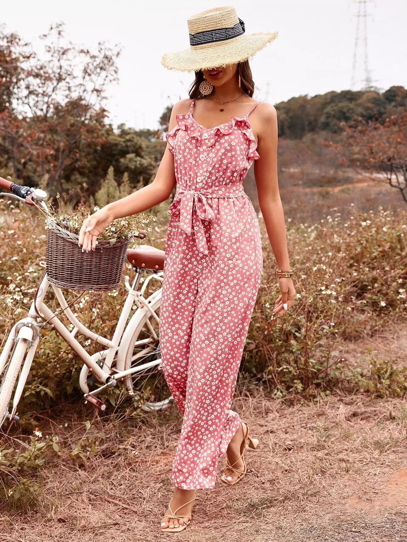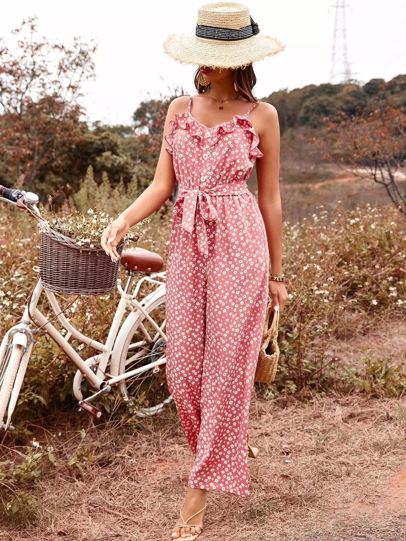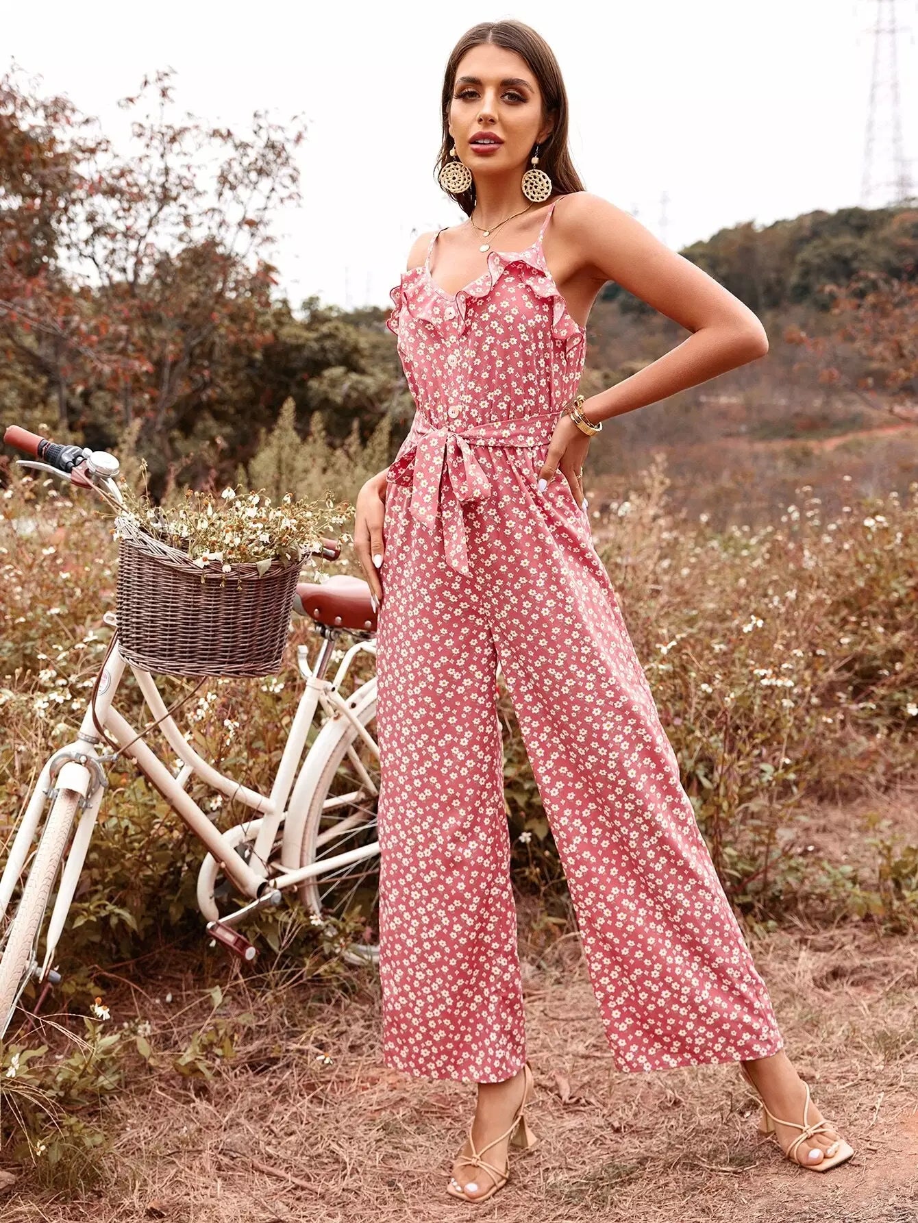Ditsy الأزهار كشكش تقليم بذلة كامي بدون حزام