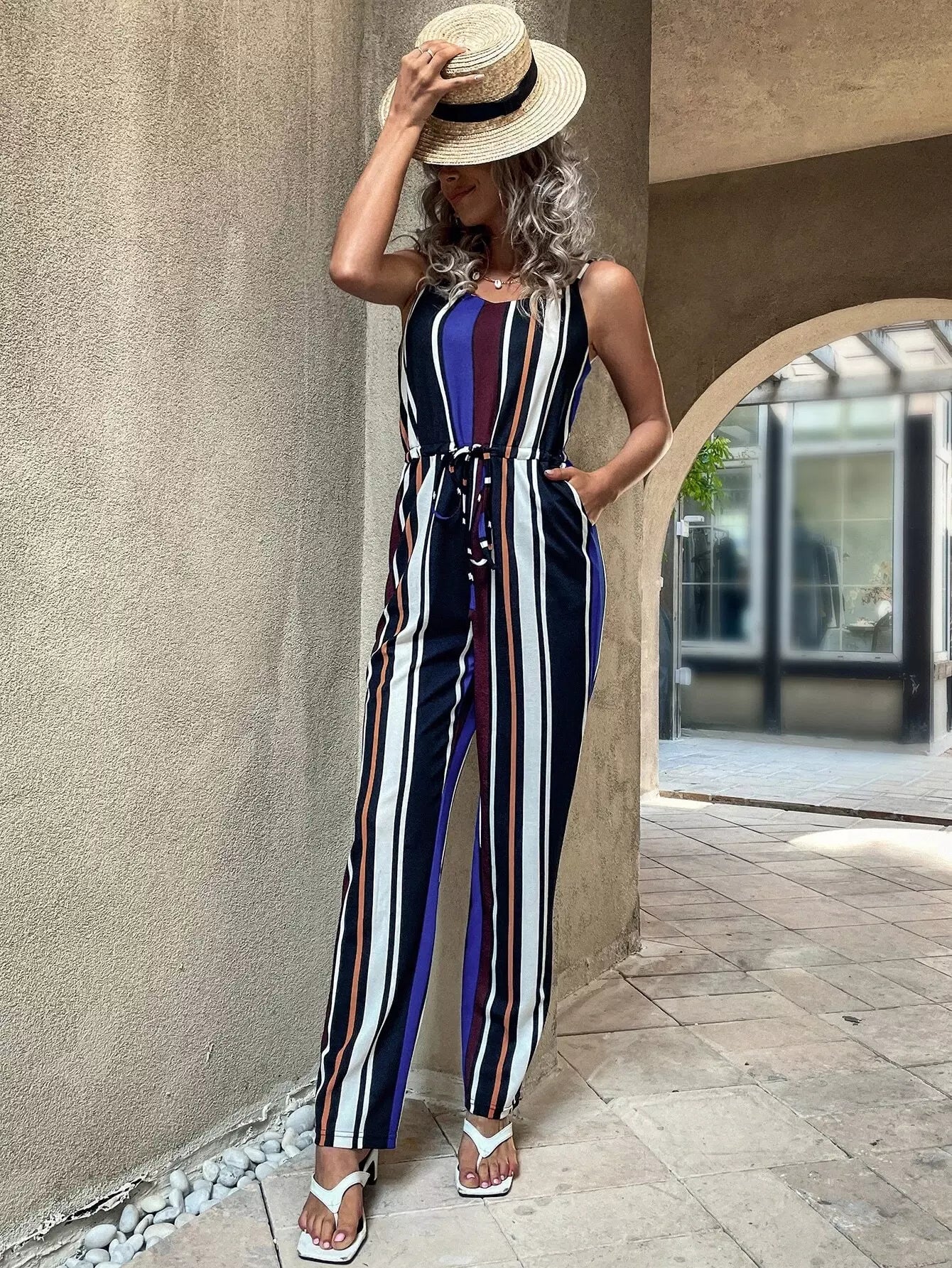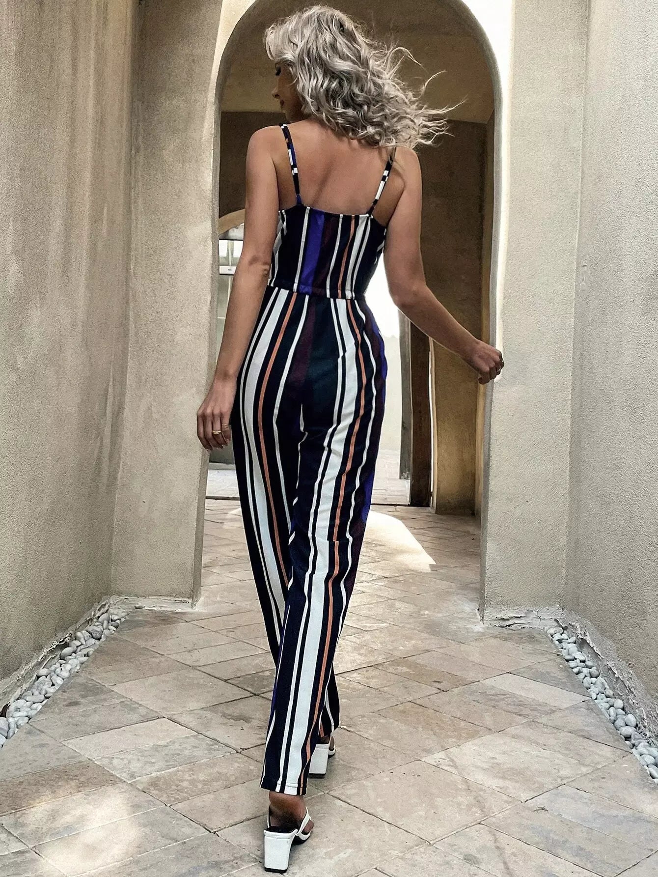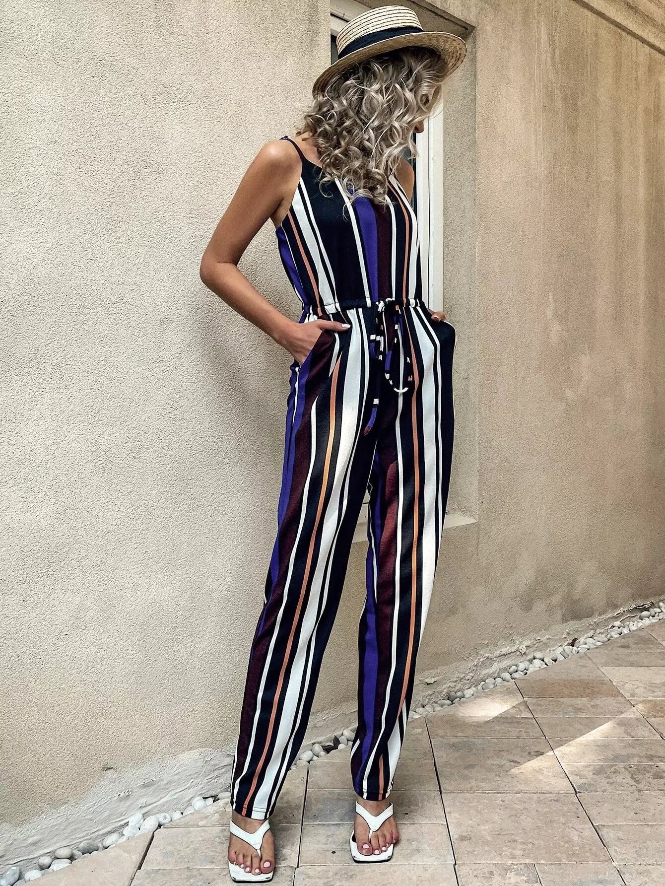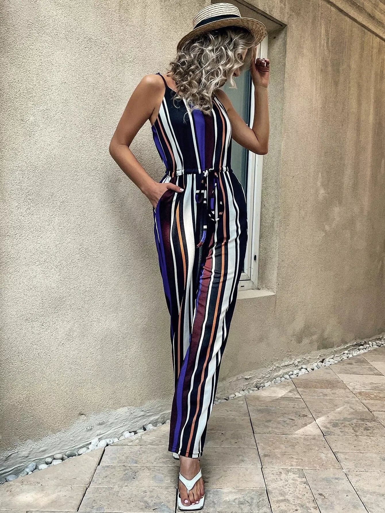 جمبسوت قصير مخطط عمودي برباط على الخصر مخططة عمودياً