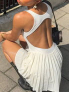 جمبسوت نسائي أبيض كاجوال من EZwear برقبة مربعة بدون أكمام وثنيات مجوفة على شكل حرف A