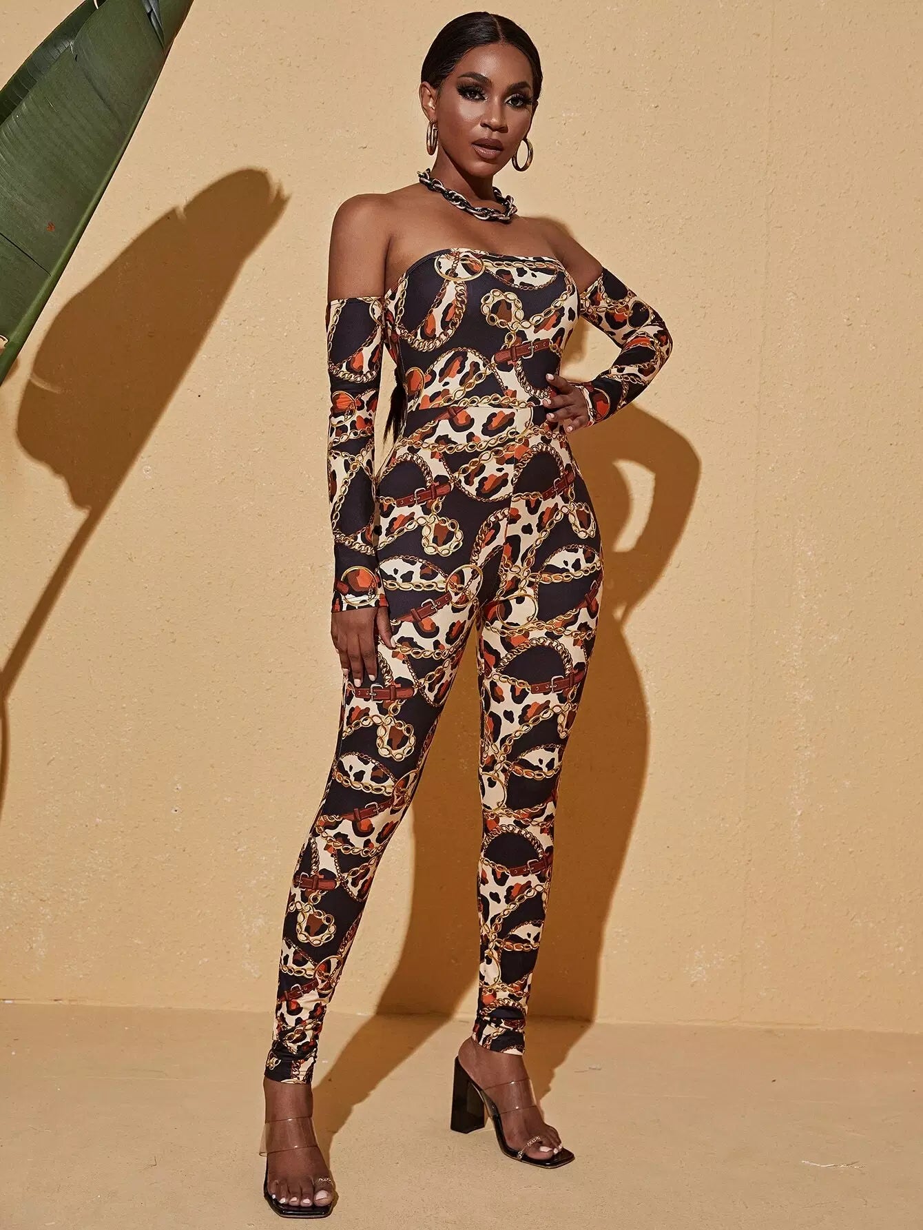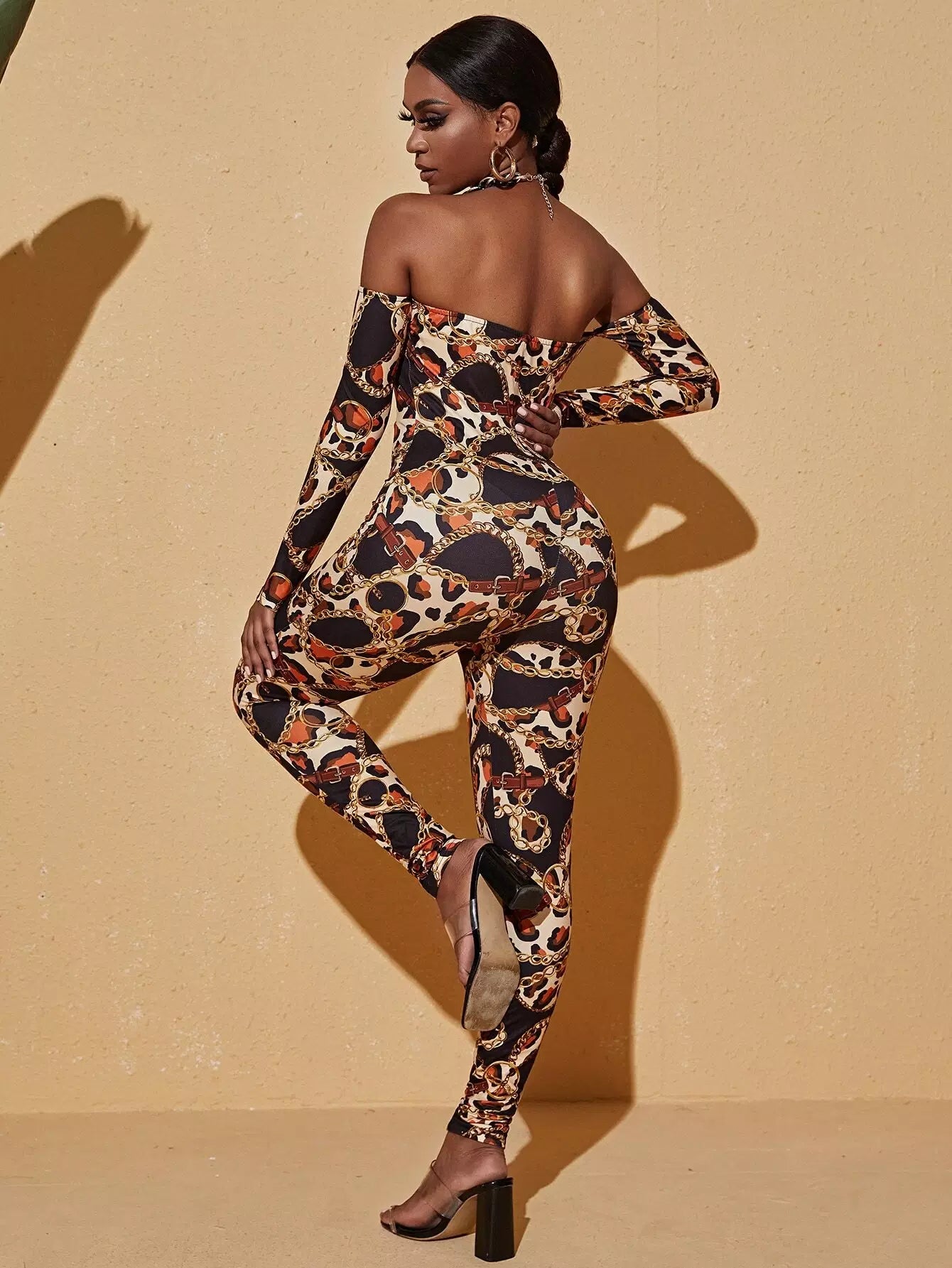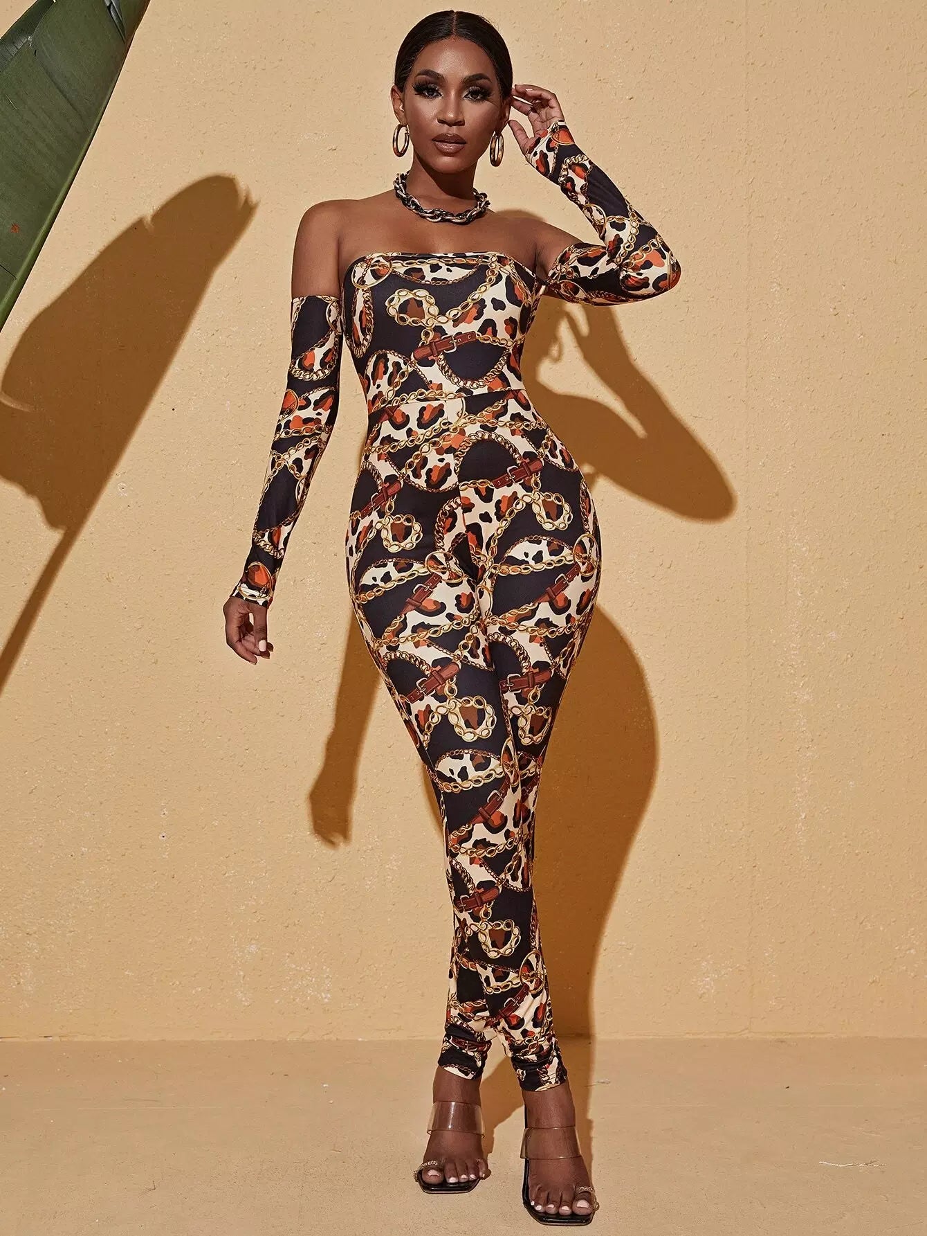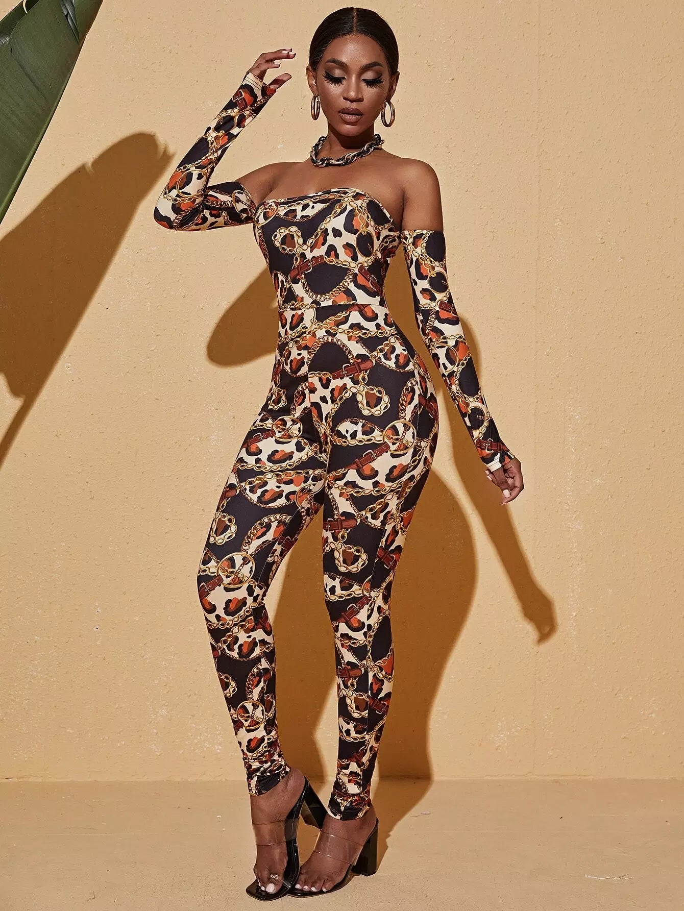 جمبسوت ضيق بنقشة جلد الفهد وسلسلة بدون أكتاف