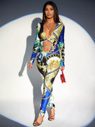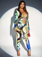 جمبسوت عشوائي بطبعة ريش وباروك برقبة مكشوفة بفتحة رقبة متقاطعة على شكل عقدة