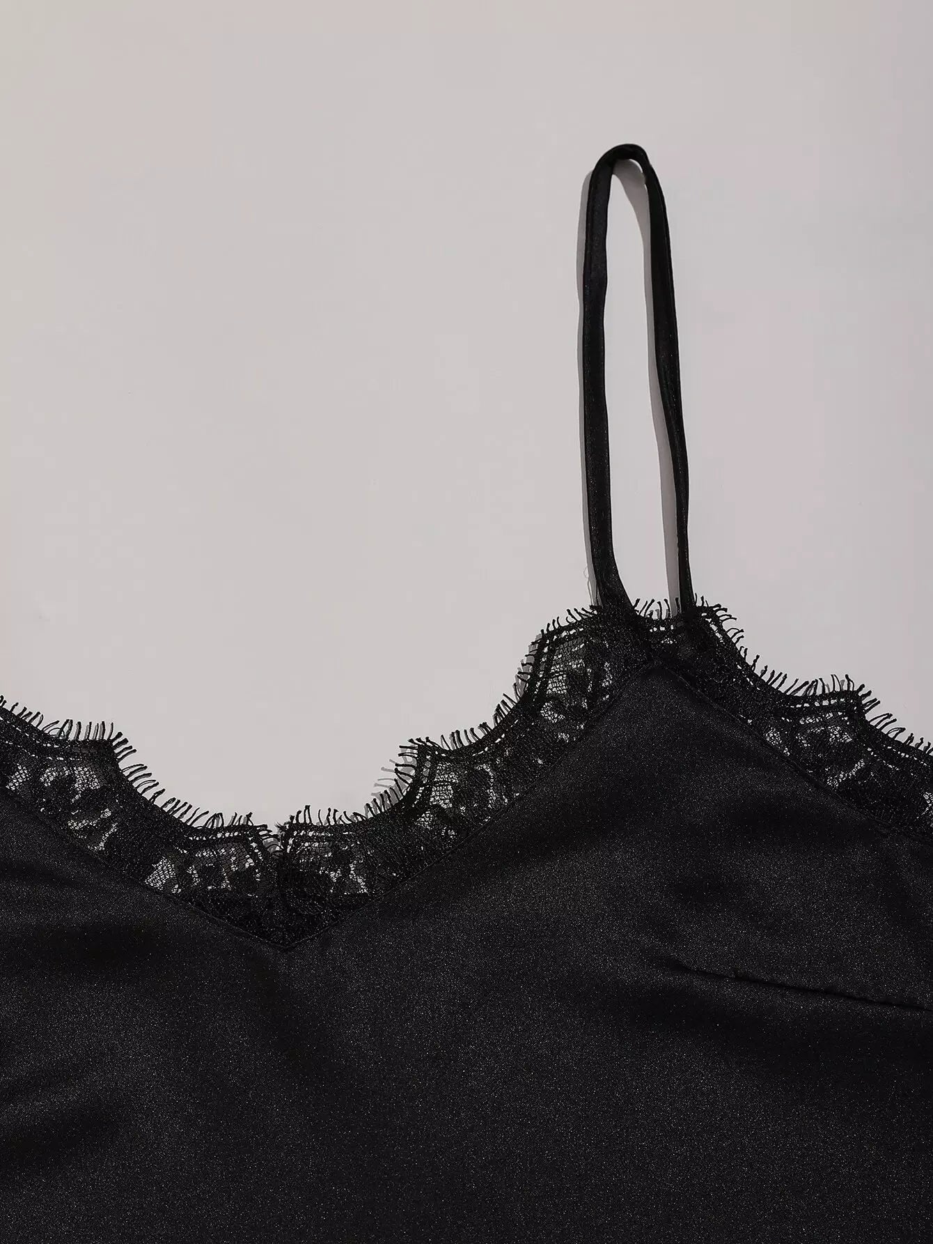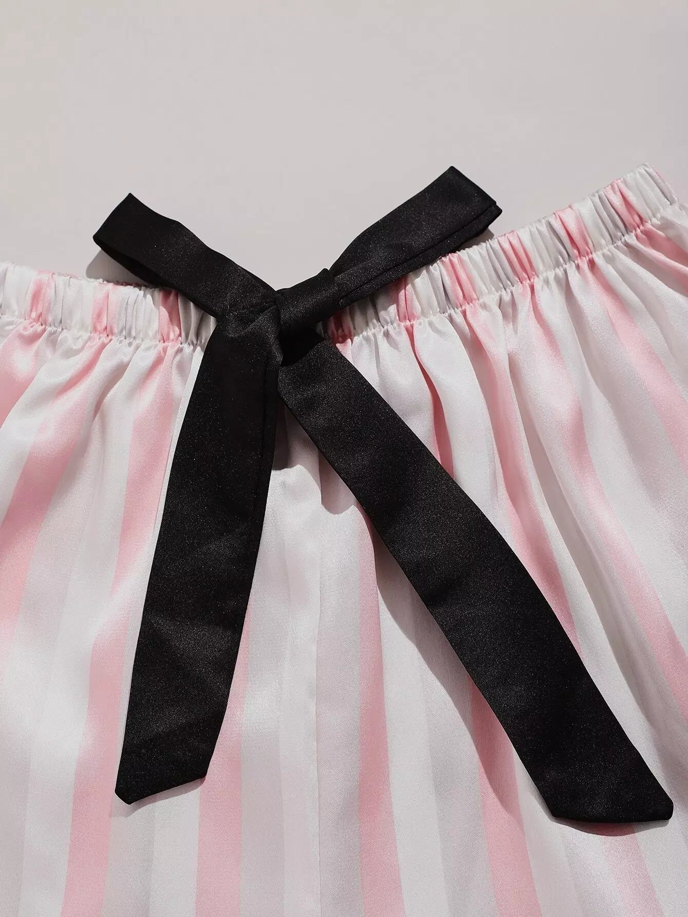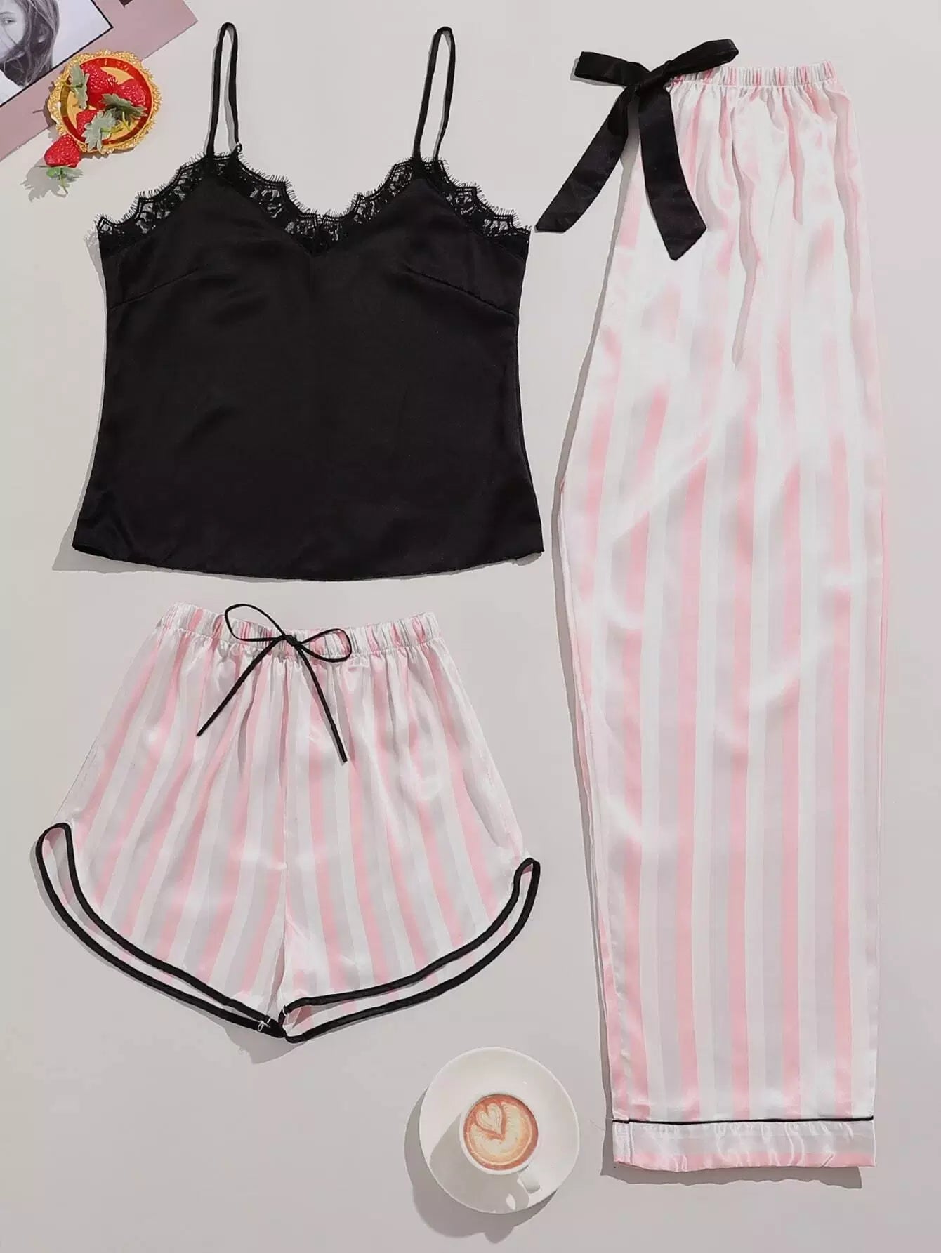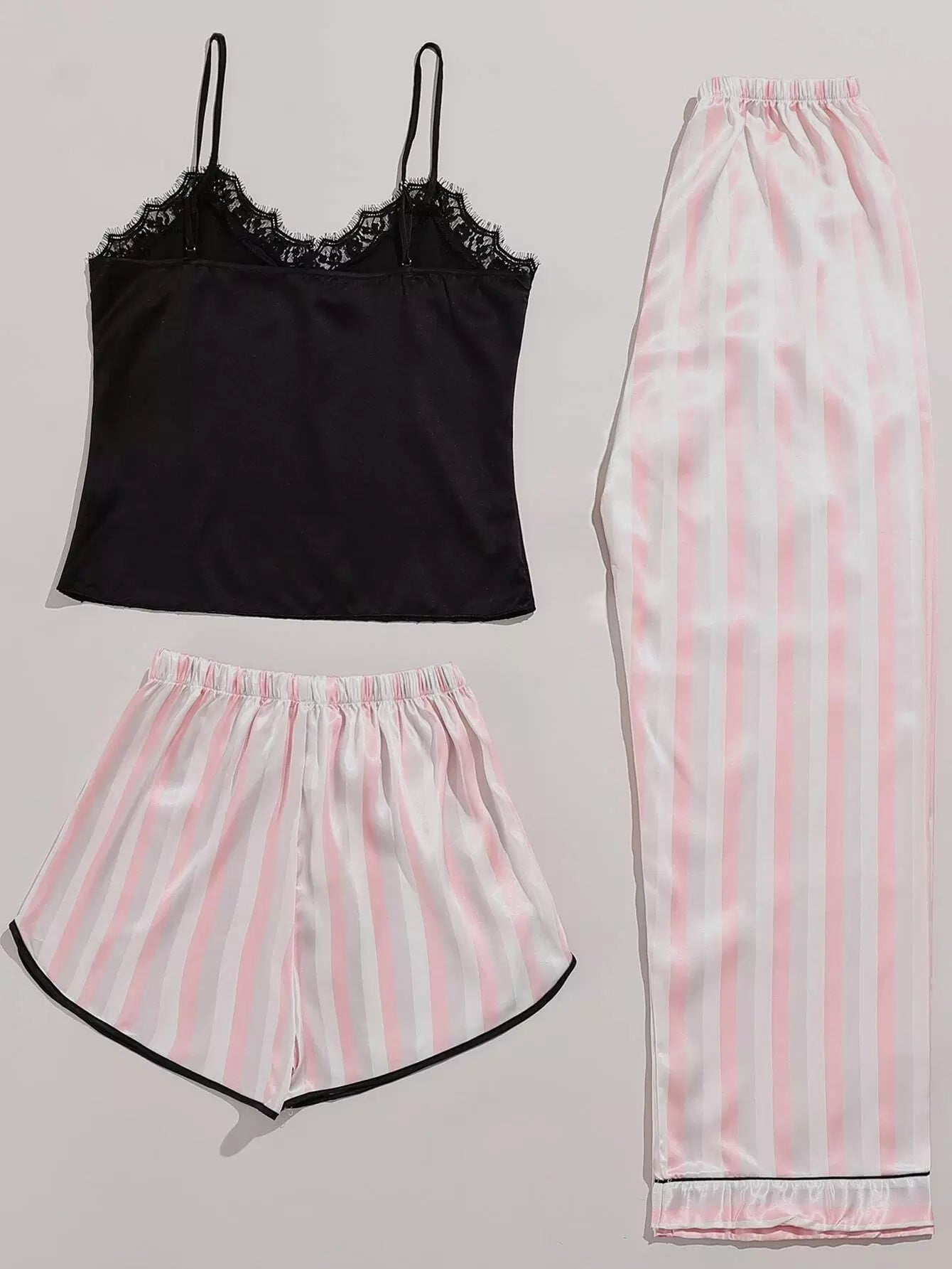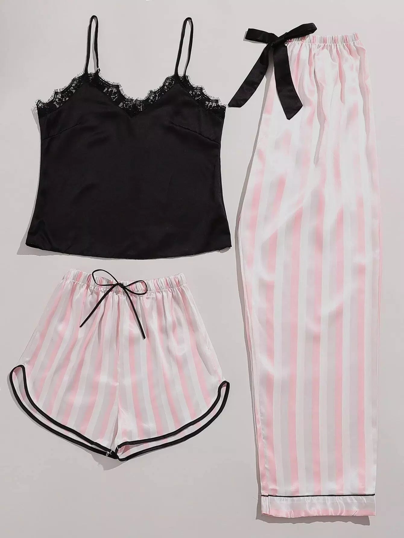 طقم ليلي مكون من 3 قطع بلوزة من الدانتيل الساتان بلون مغاير وشورت وبنطال مخططين