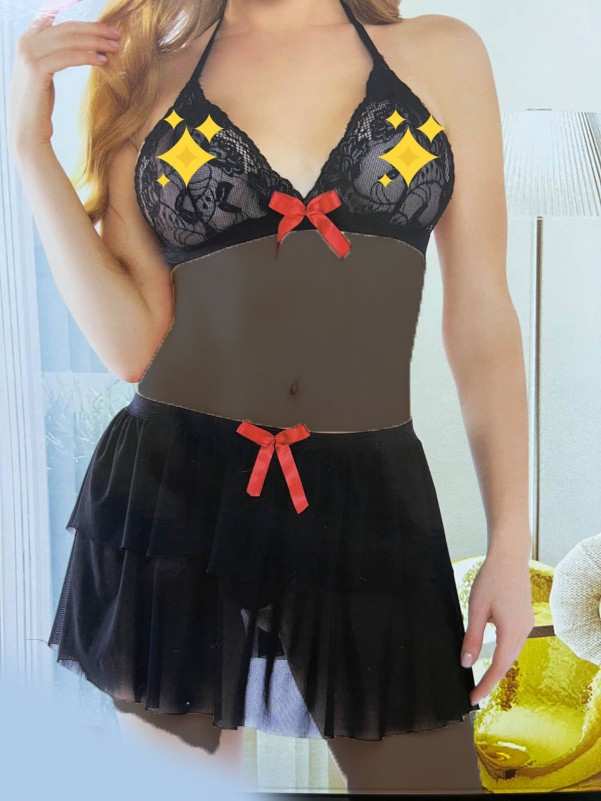 بيجامة دانتيل أسود مع ربطة عنق حمراء قطعتين