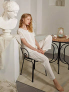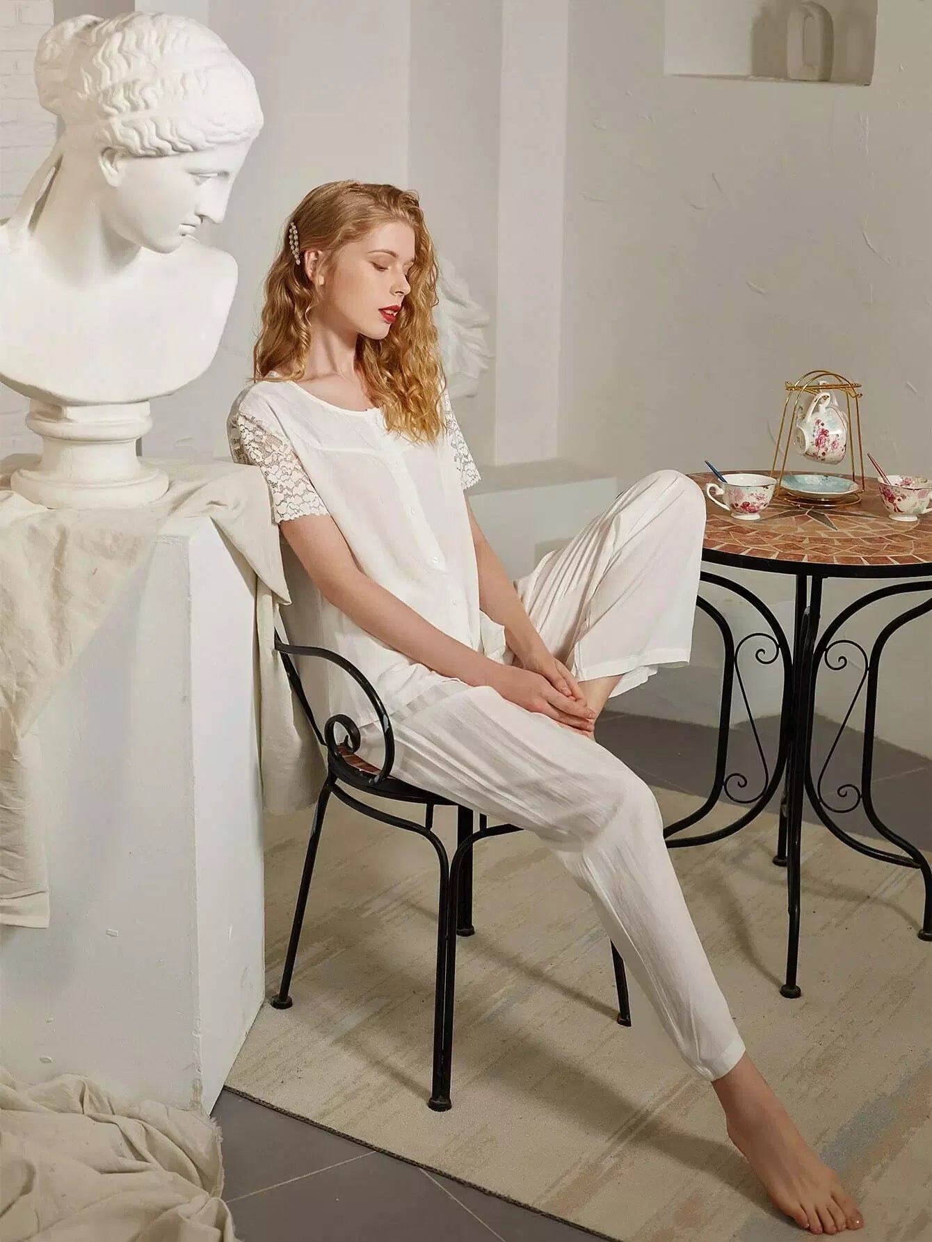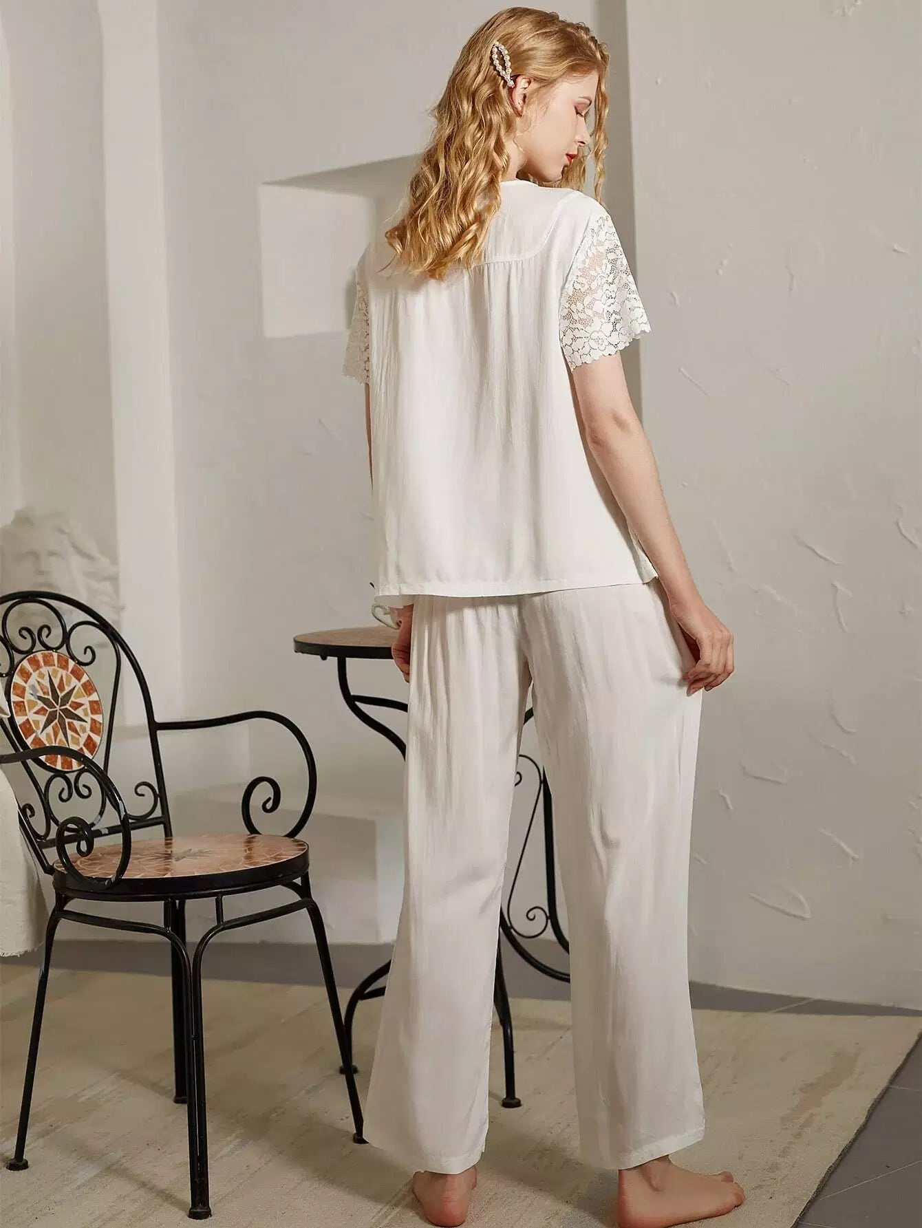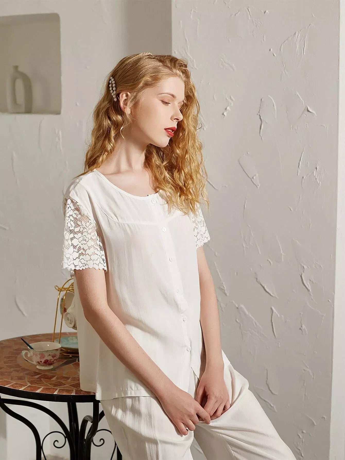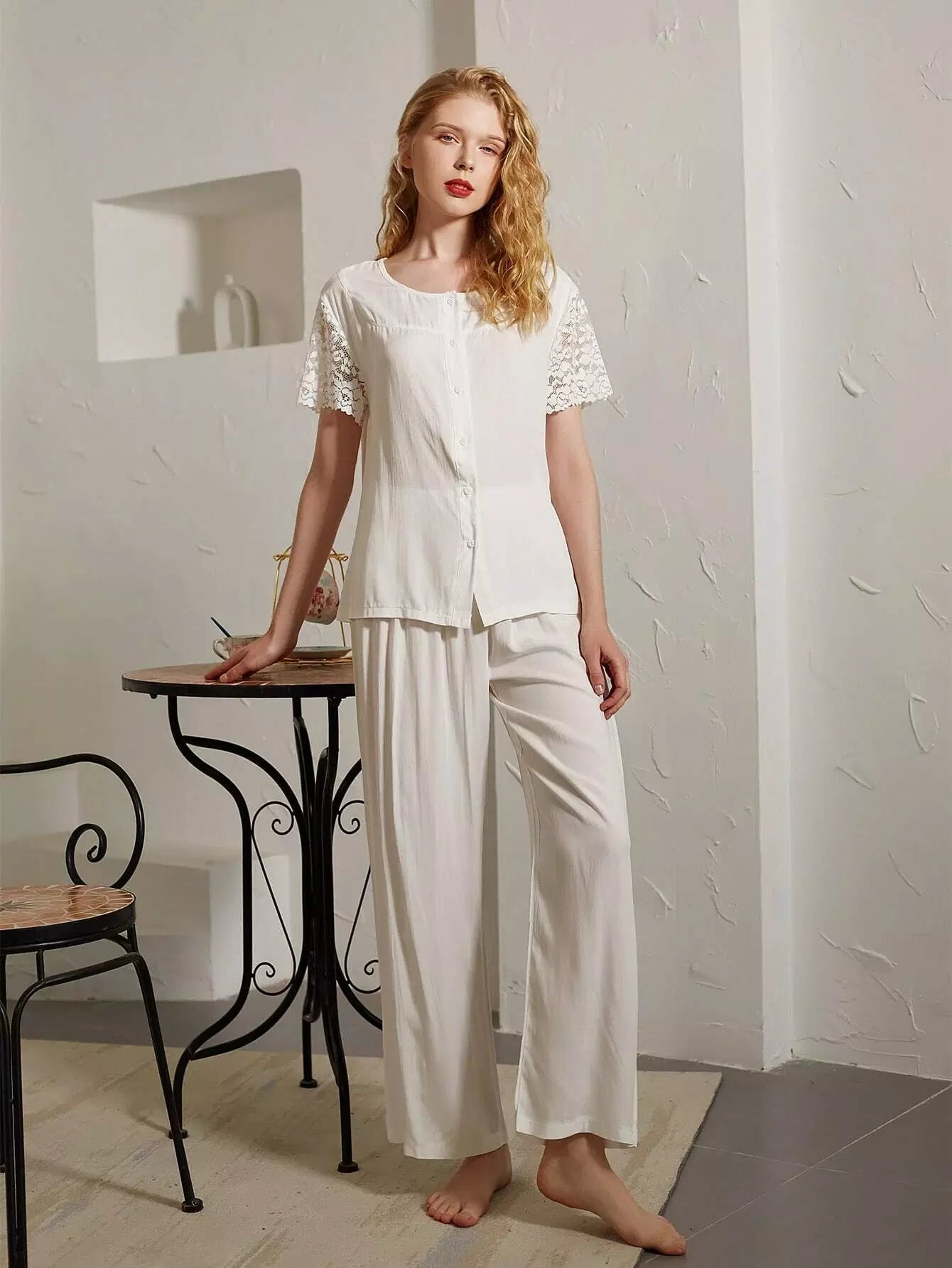طقم بيجامة بأكمام دانتيل بلون مغاير بأزرار أمامية