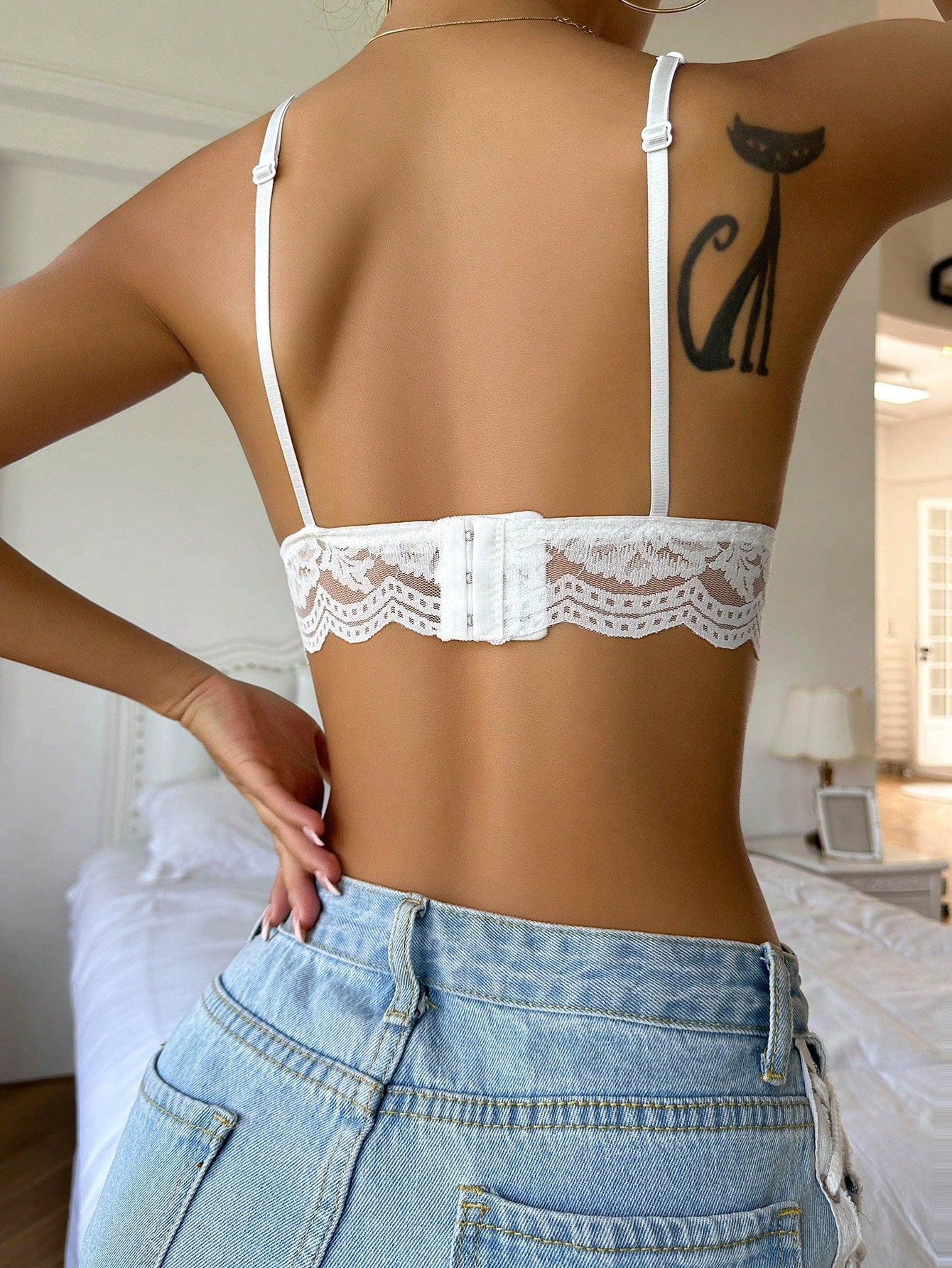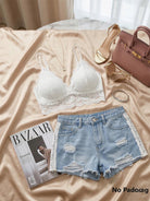 حمالة صدر بيضاء مزينة بدانتيل زهري وحواف مقوسة، بلوزة بيضاء مثيرة للبنات