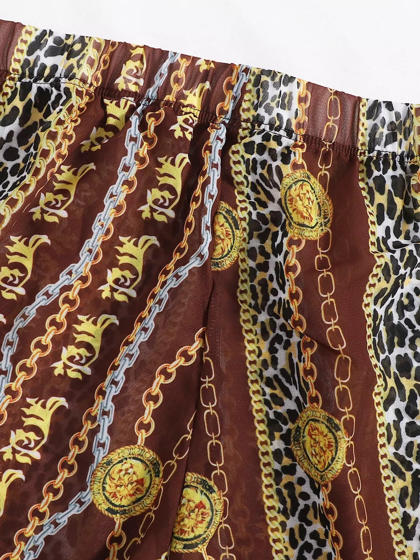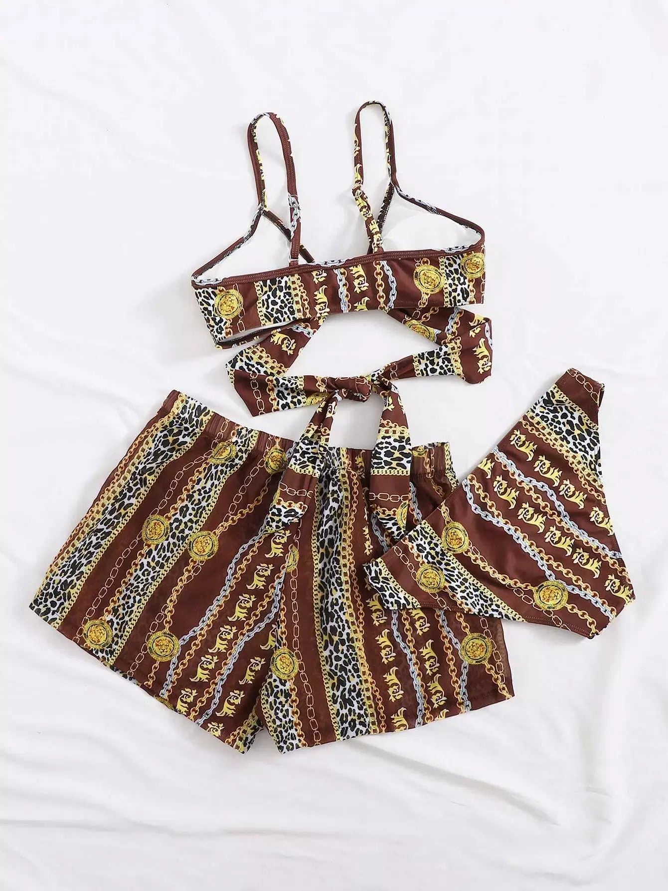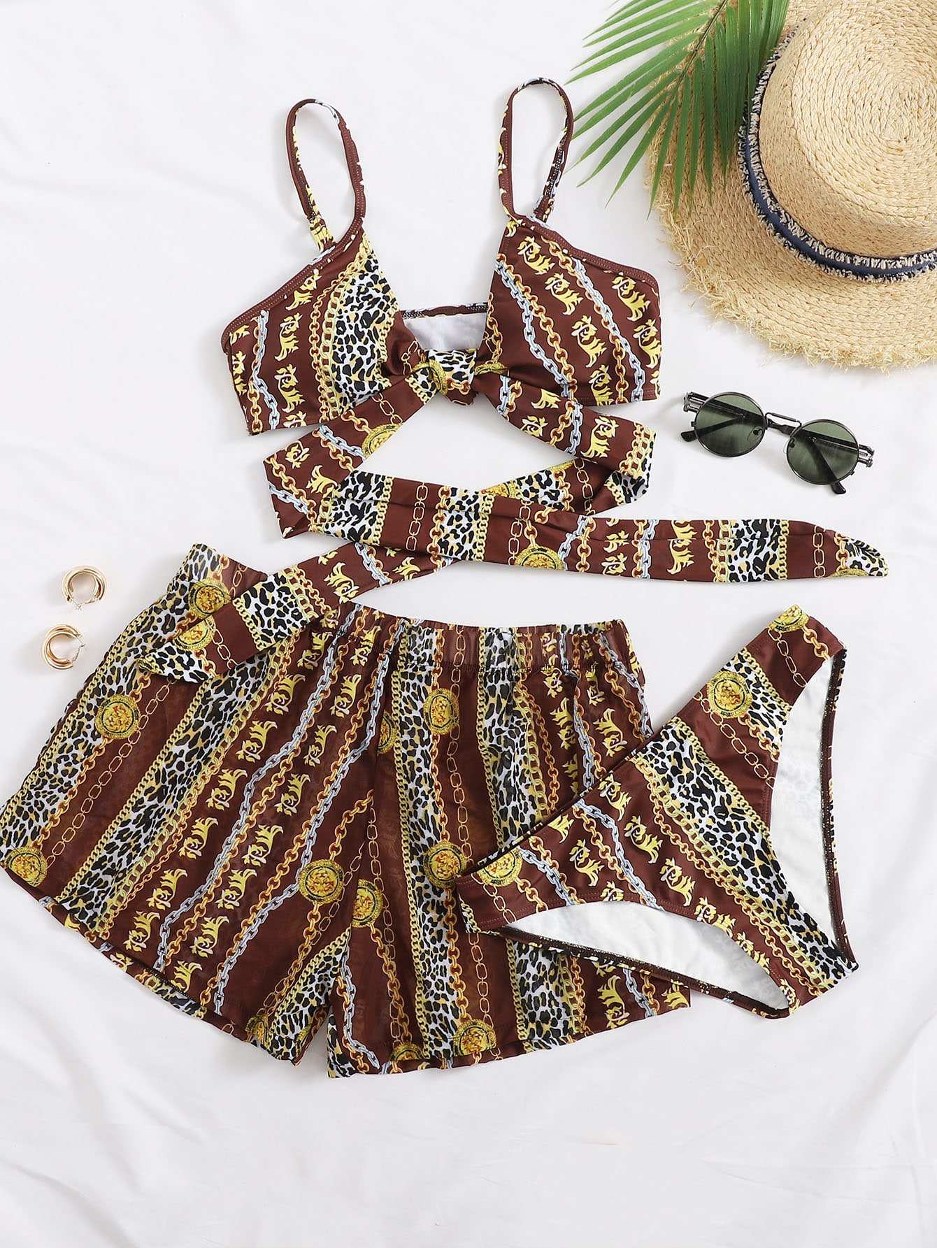 للنساء - بدلة سباحة بكيني مكونة من 3 قطع بسلسلة وعقدة أمامية على شكل جلد الفهد