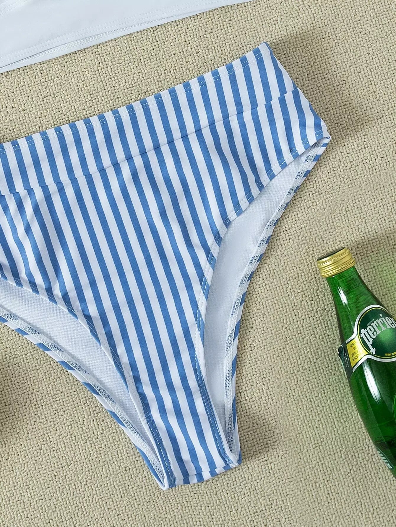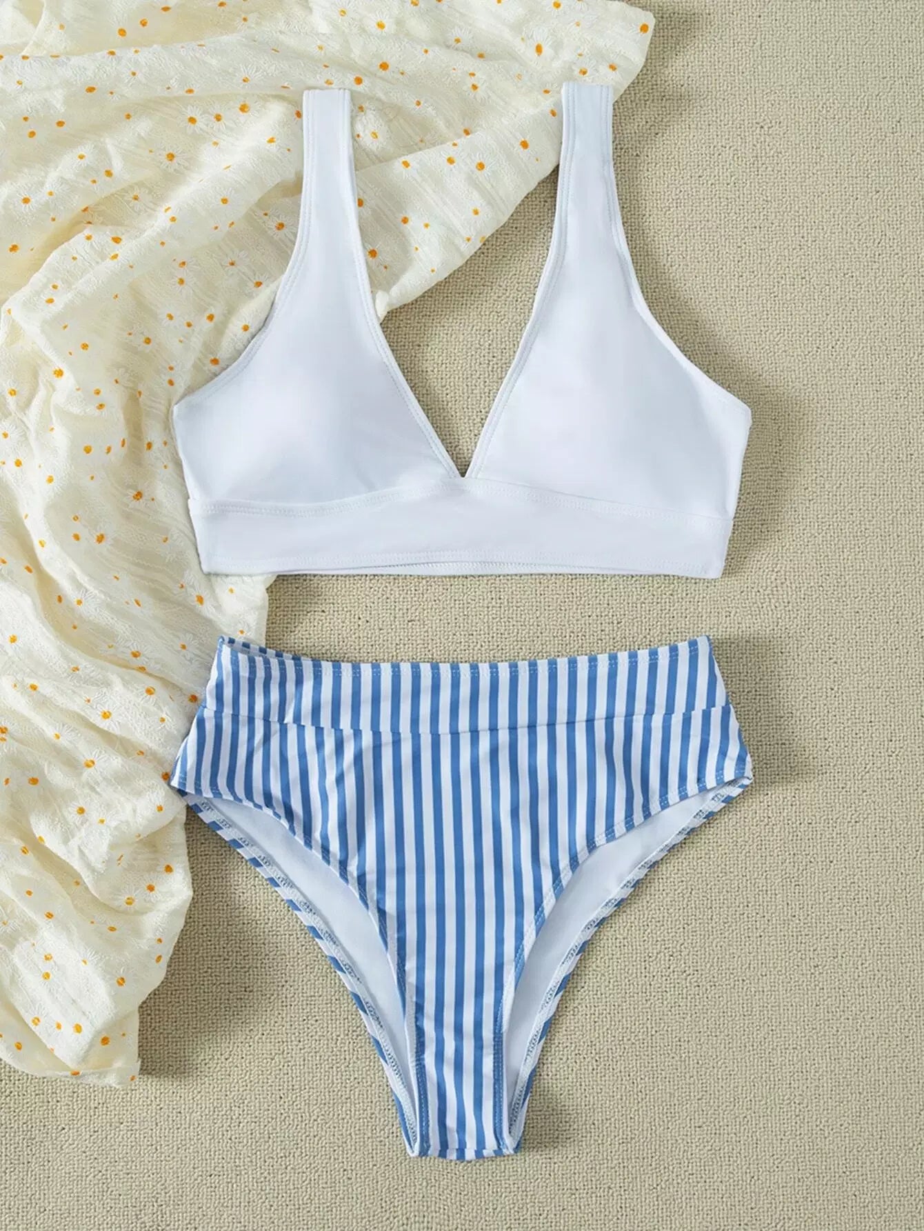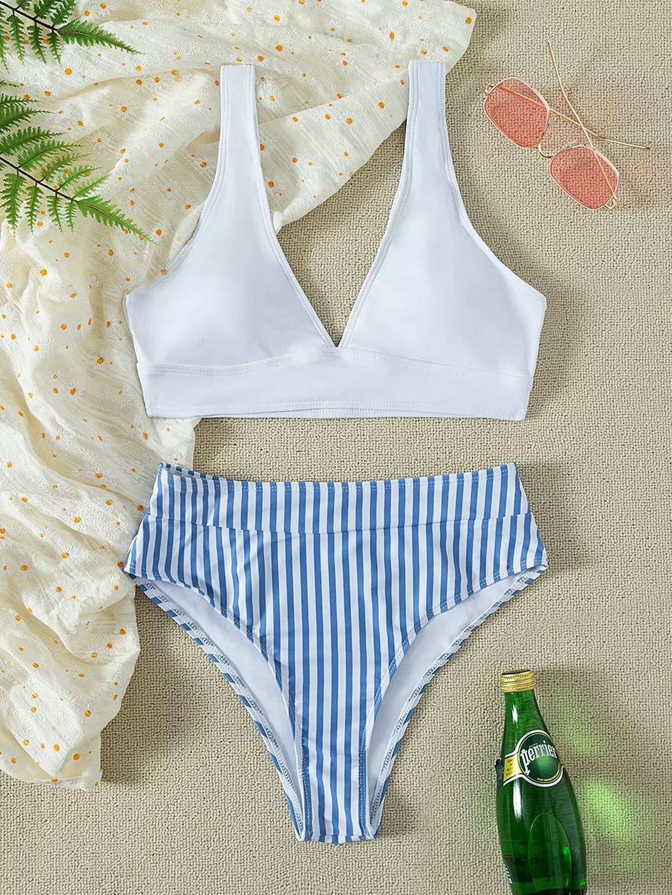 ملابس سباحة بيكيني برقبة على شكل حرف V مخطط