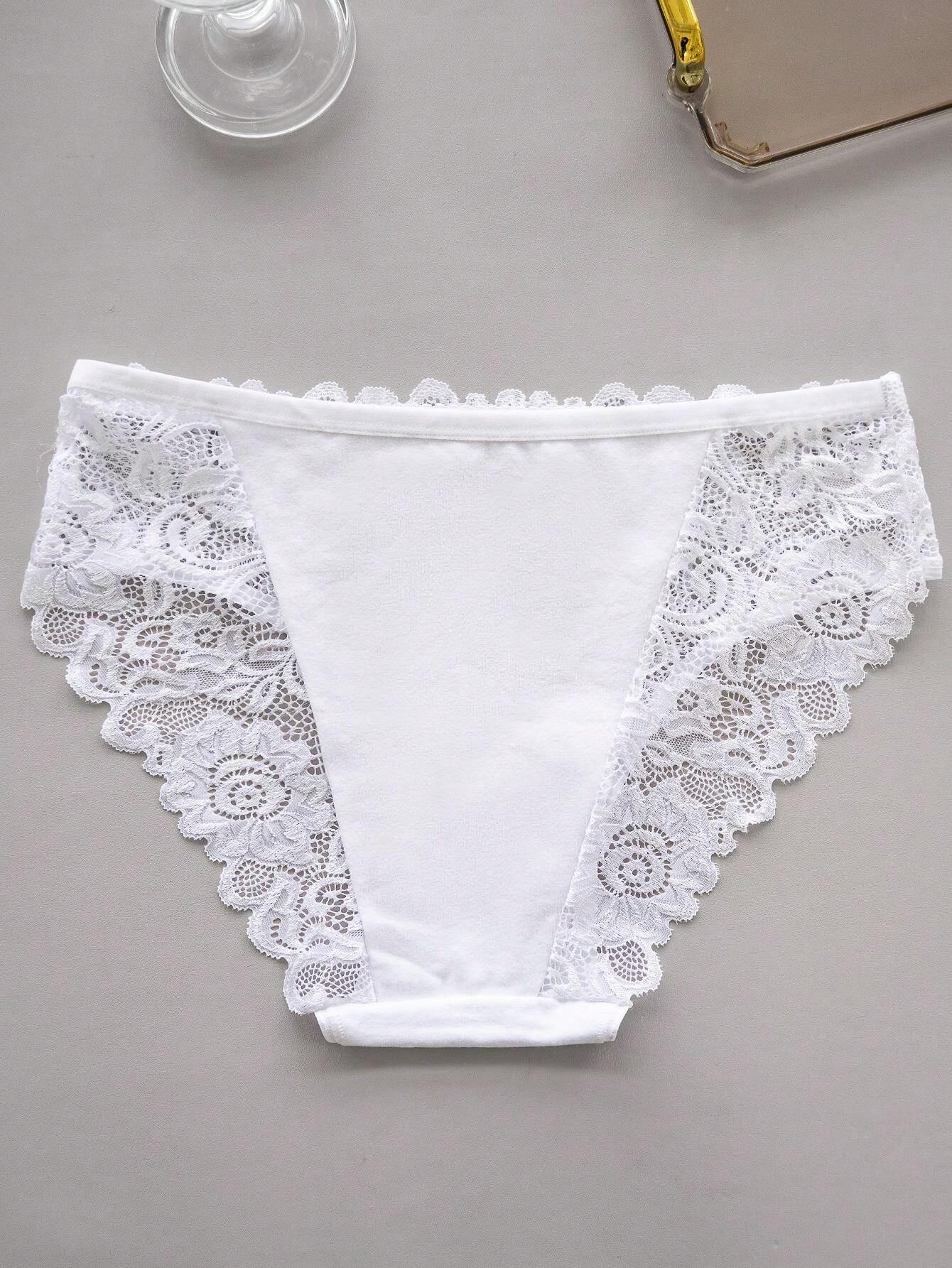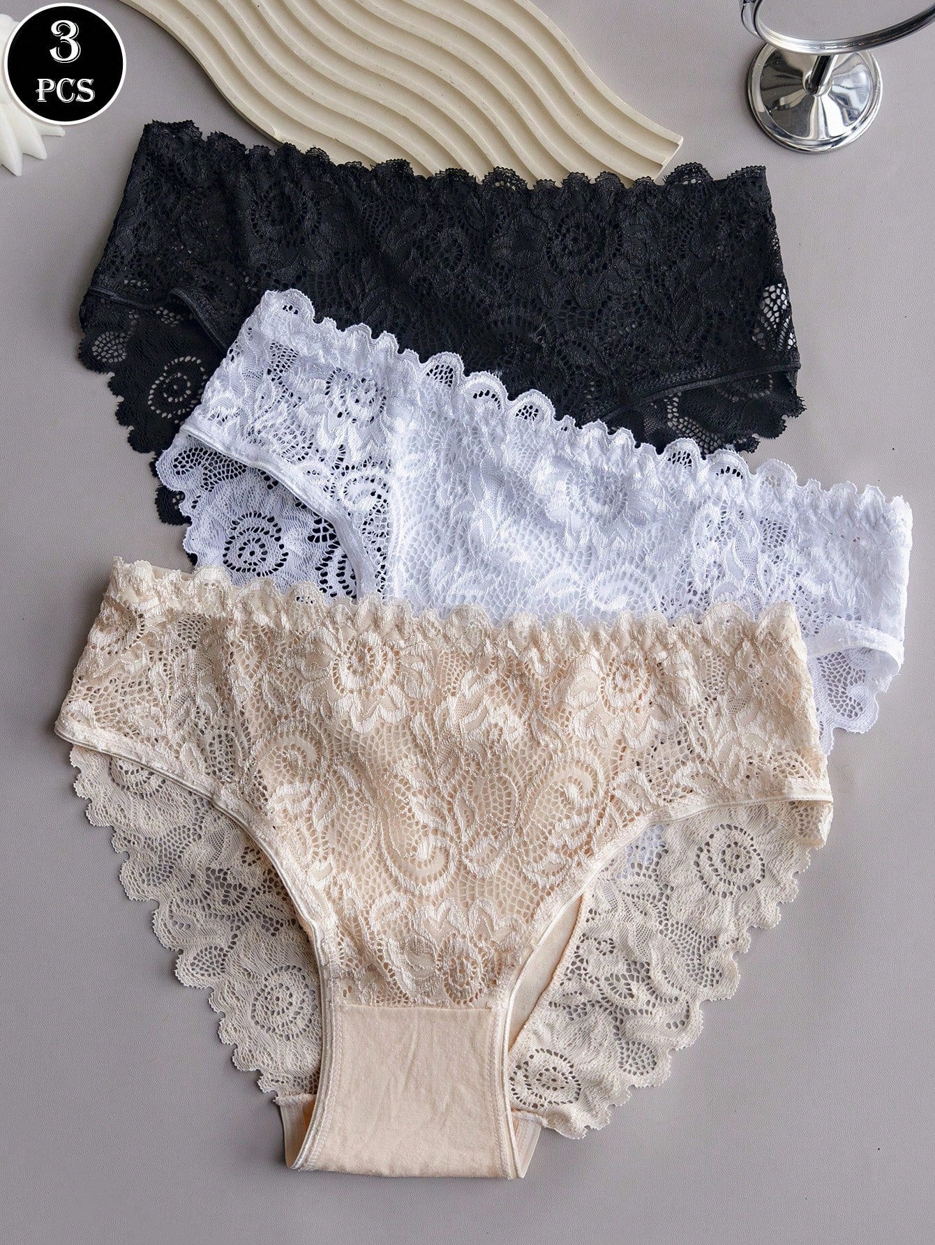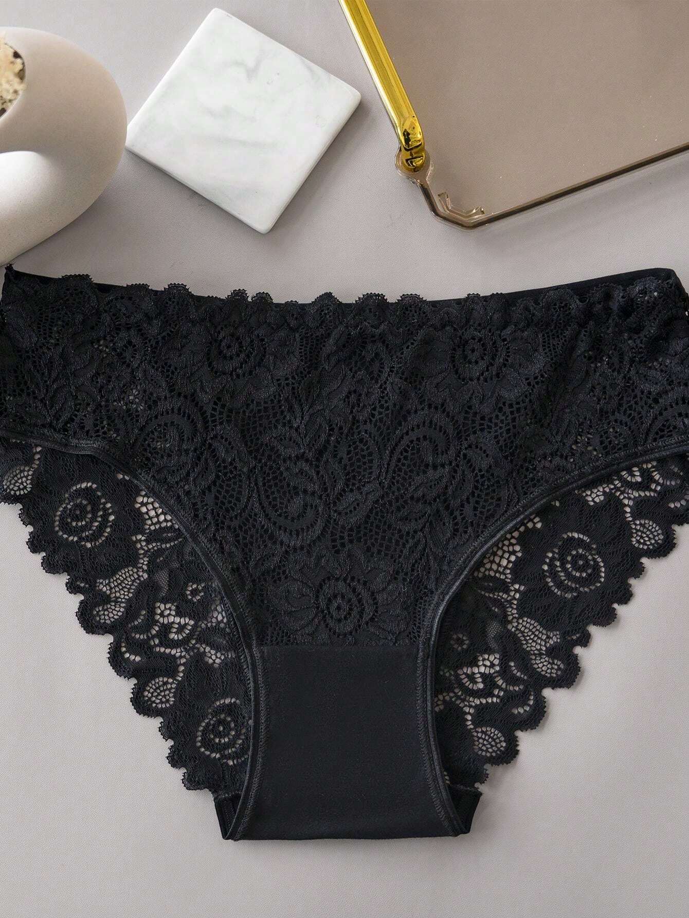 طقم سراويل داخلية مثيرة مكون من 3 قطع، مزين بالدانتيل الزهري المزخرف.
