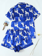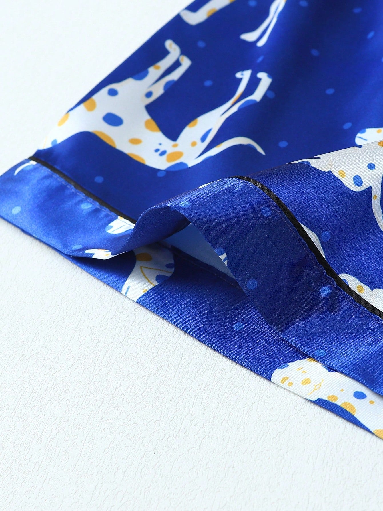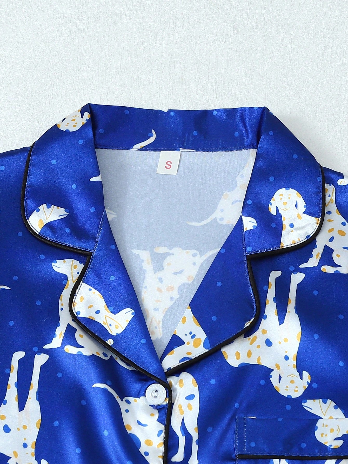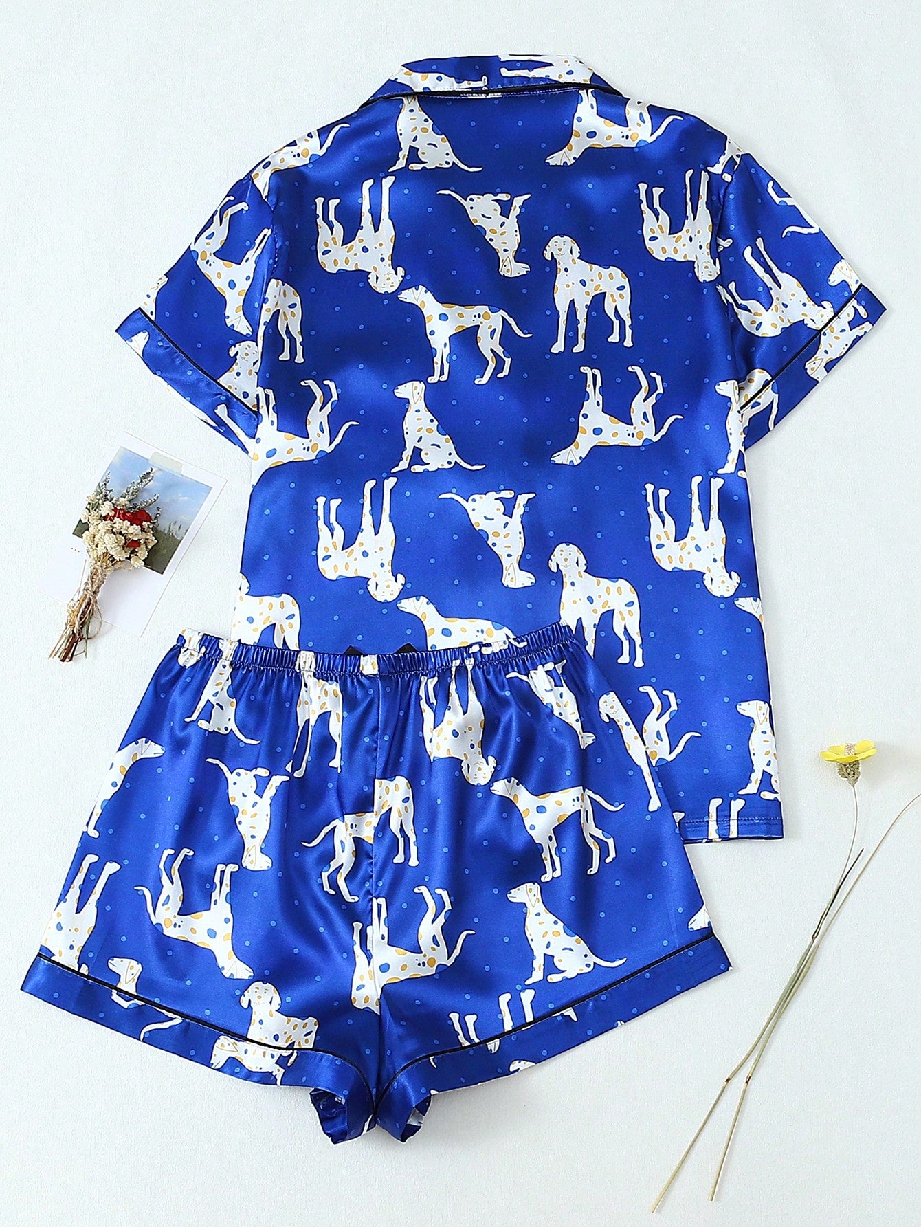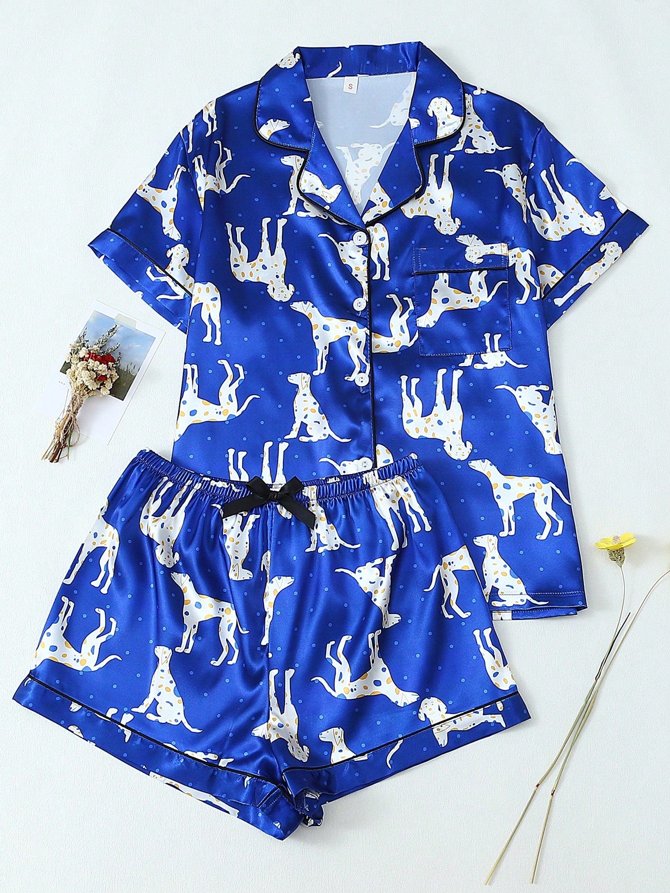 women 2pcs/Set Women Satin Polka Dot Dog Print Lapel Single-Breasted Short Sleeve Top And Bowknot Shorts Pajama Set