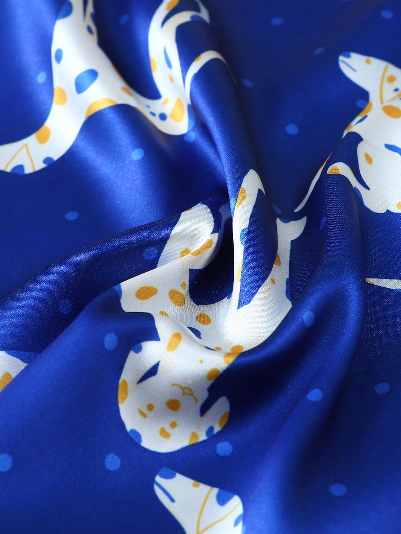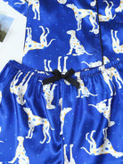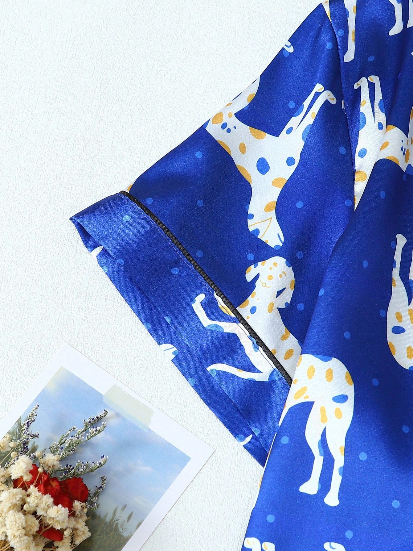 طقم بيجامة نسائي من قطعتين من الساتان بطبعة كلب منقط مع ياقة واحدة وأكمام قصيرة وشورت بعقدة فيونكة