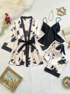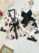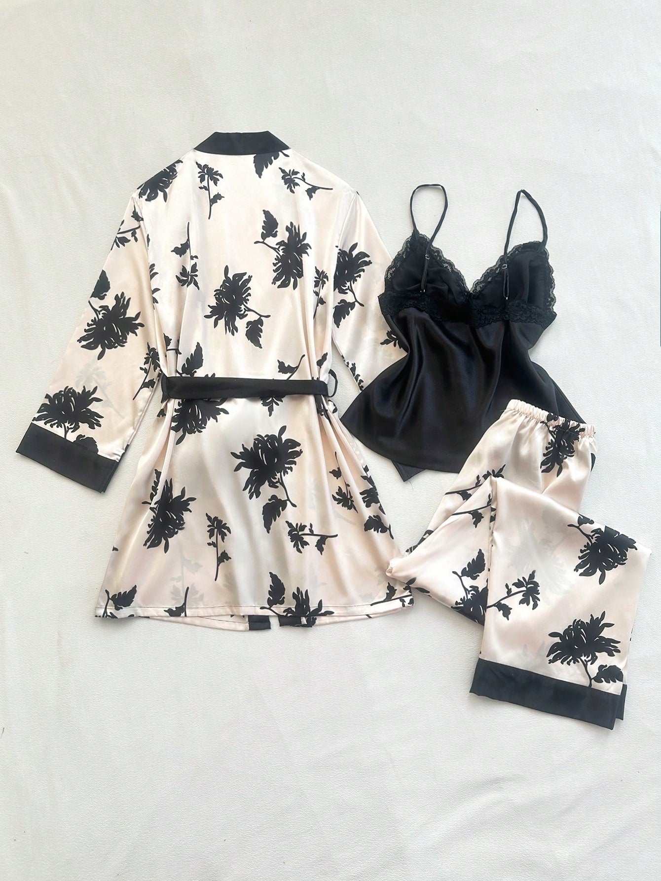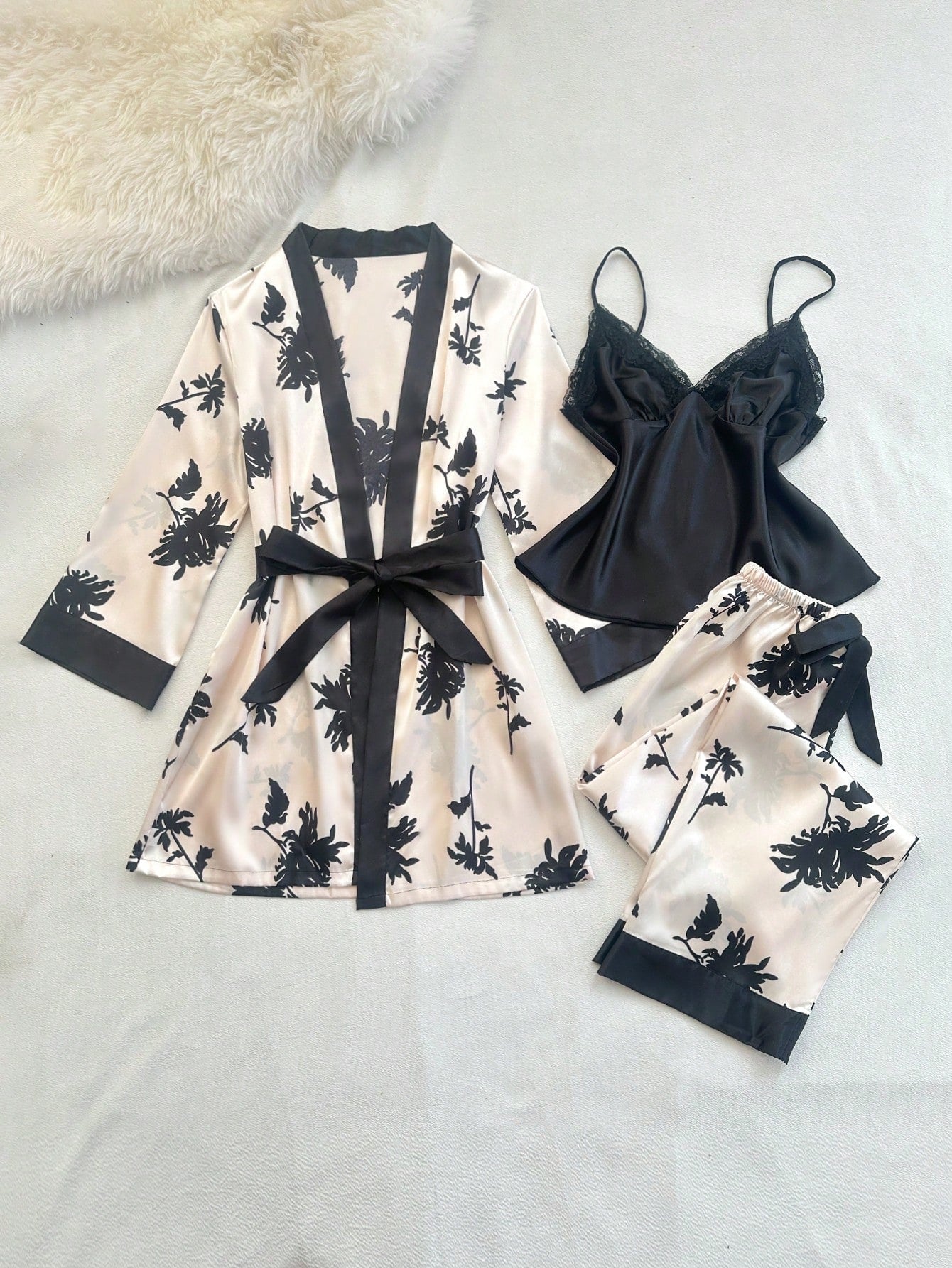 طقم بيجاما نسائي أنيق من الحرير الصناعي بنقشة زهور، مكون من 3 قطع