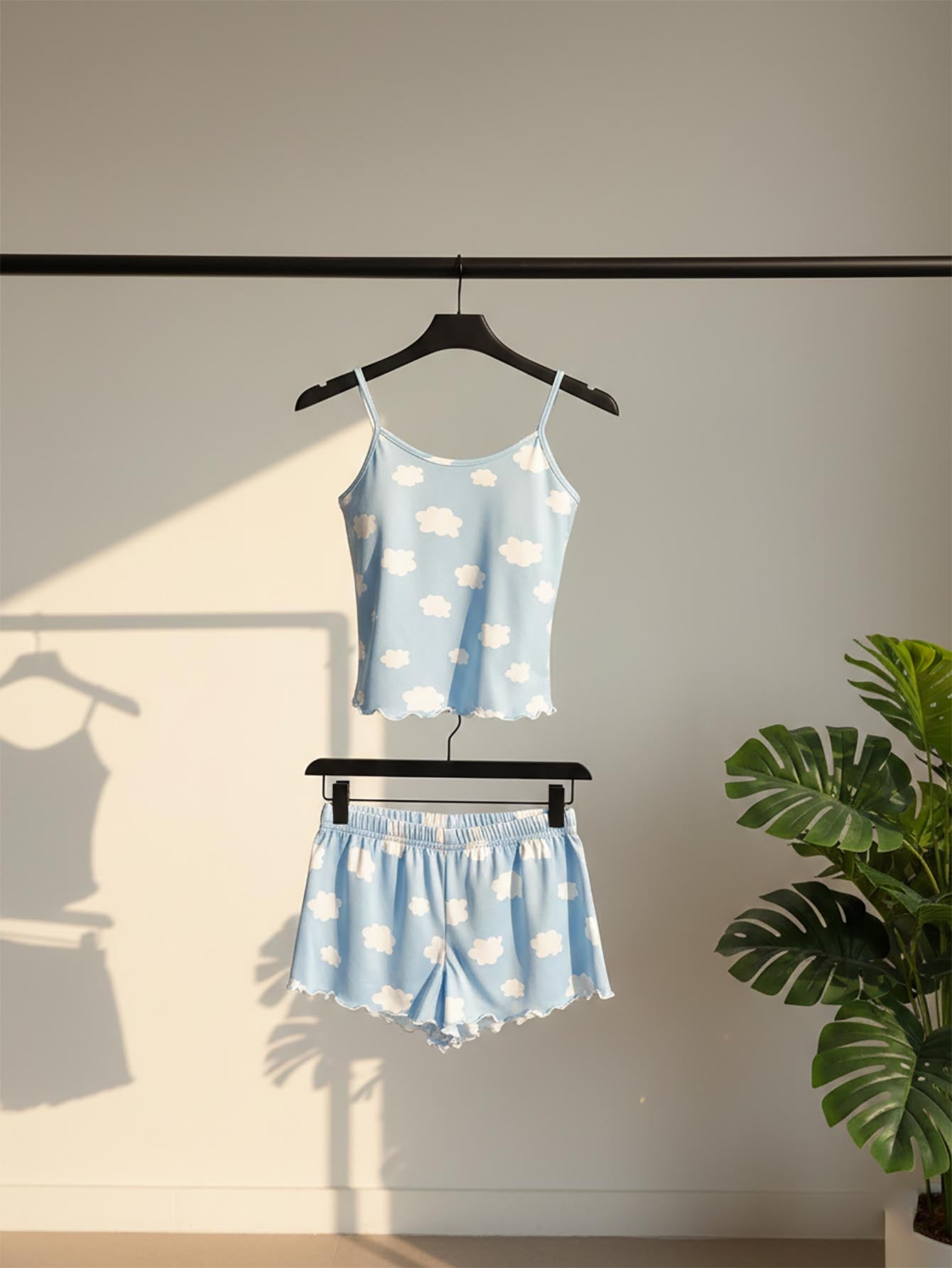طقم بيجاما نسائي مكون من قميص داخلي قصير وشورت بنقشة سماء زرقاء وسحب بيضاء