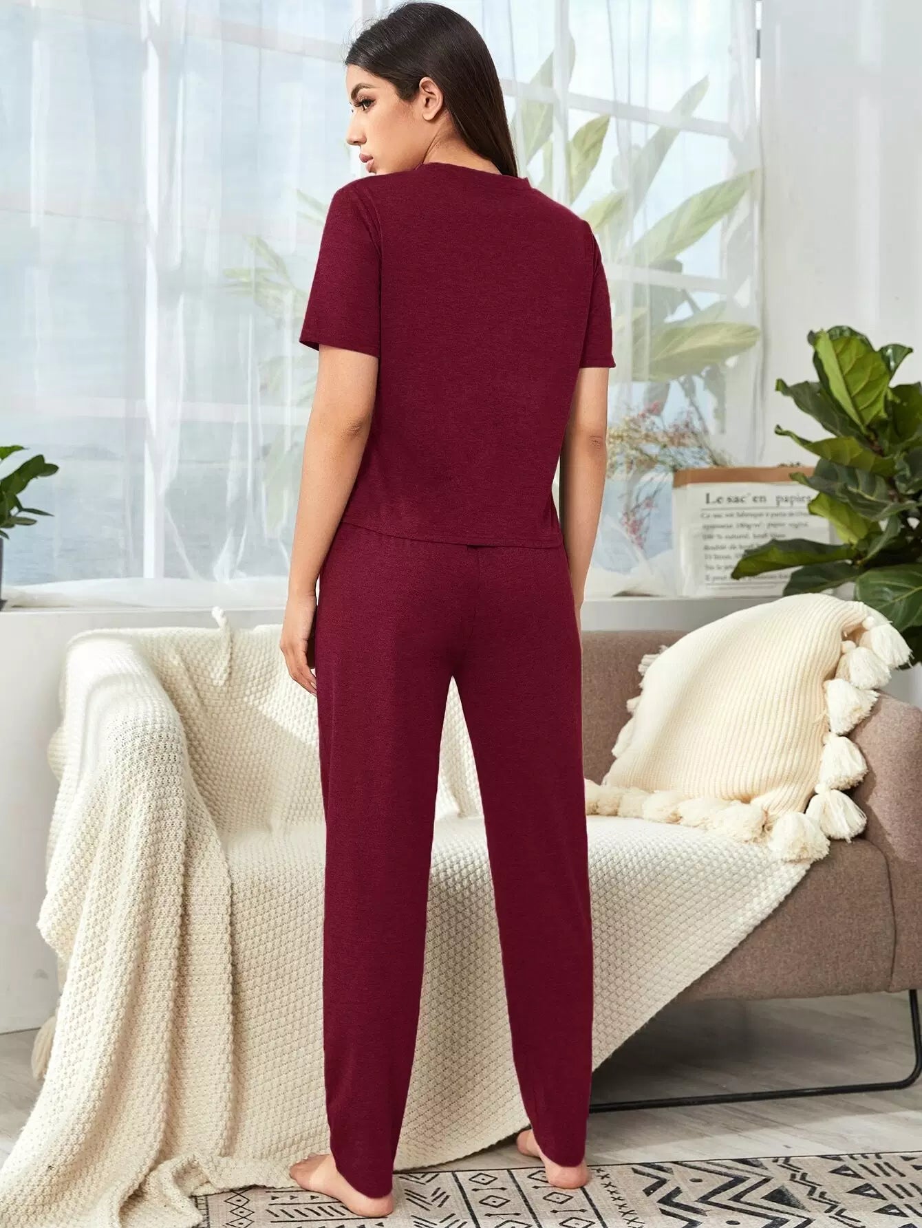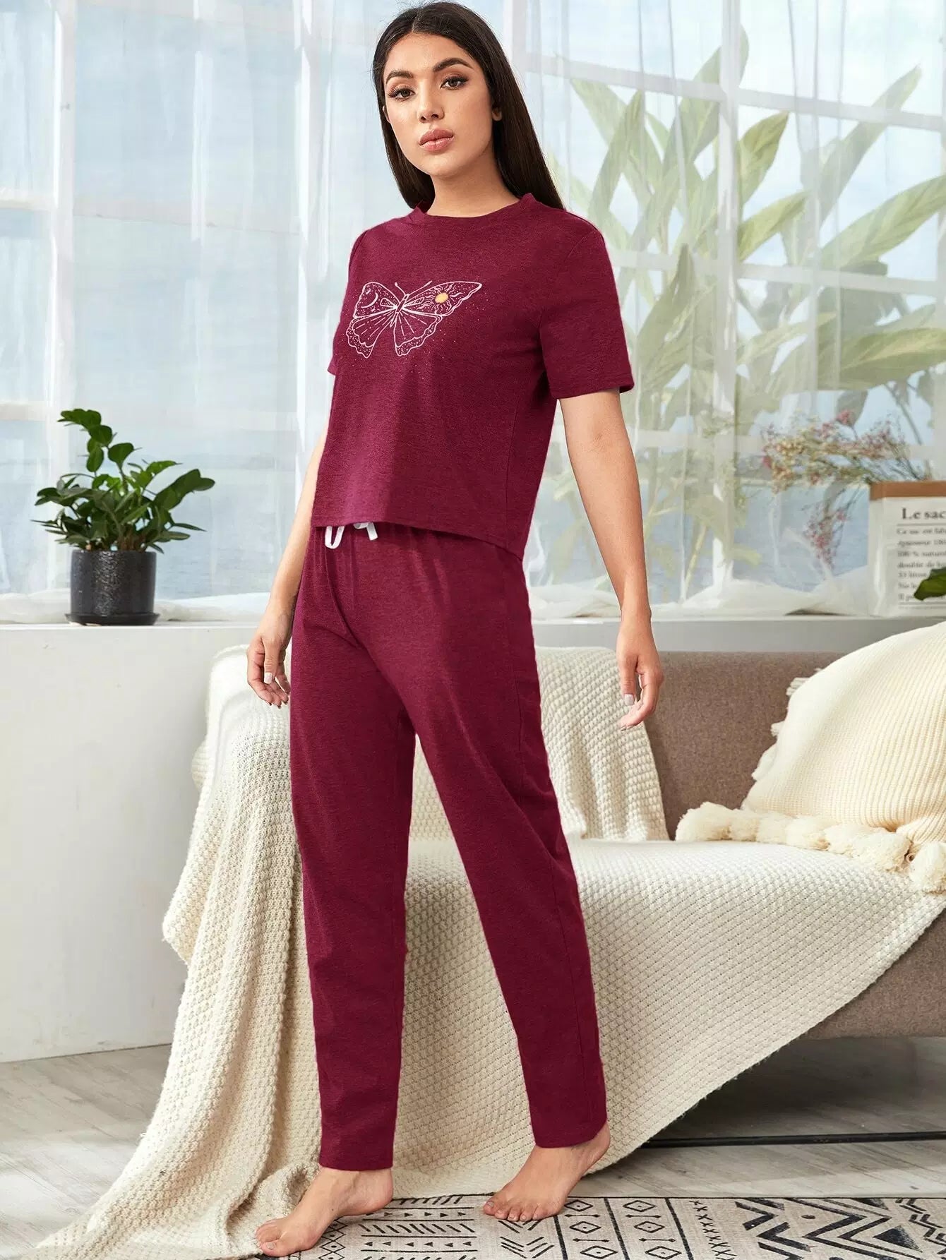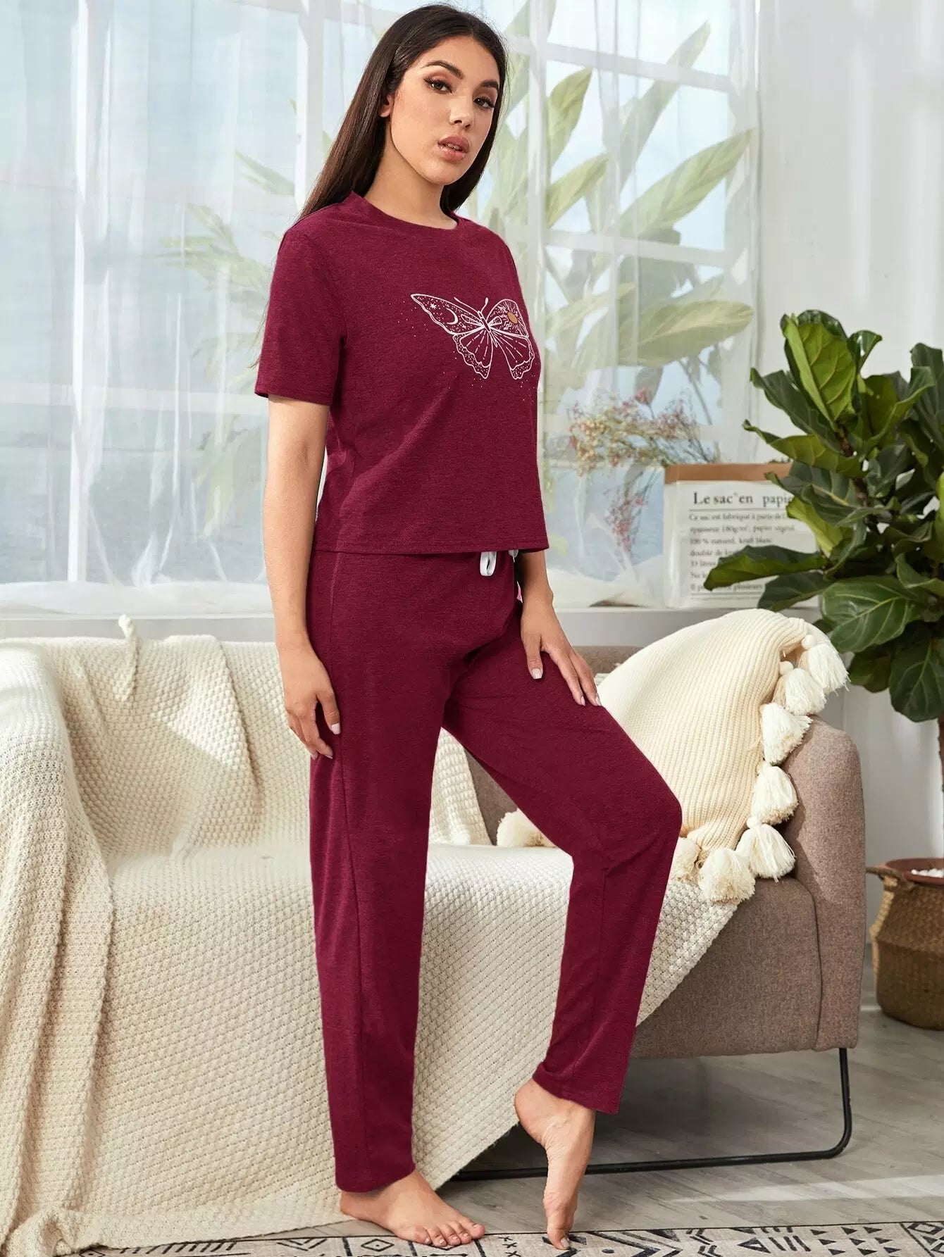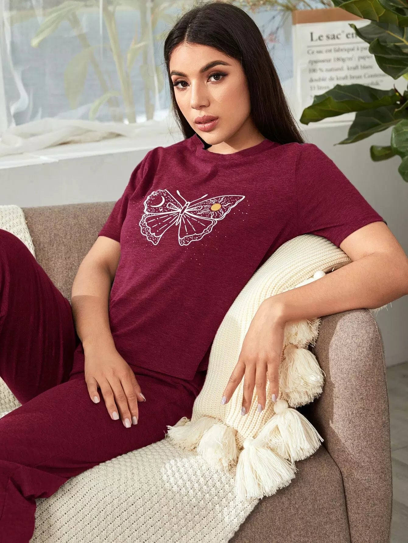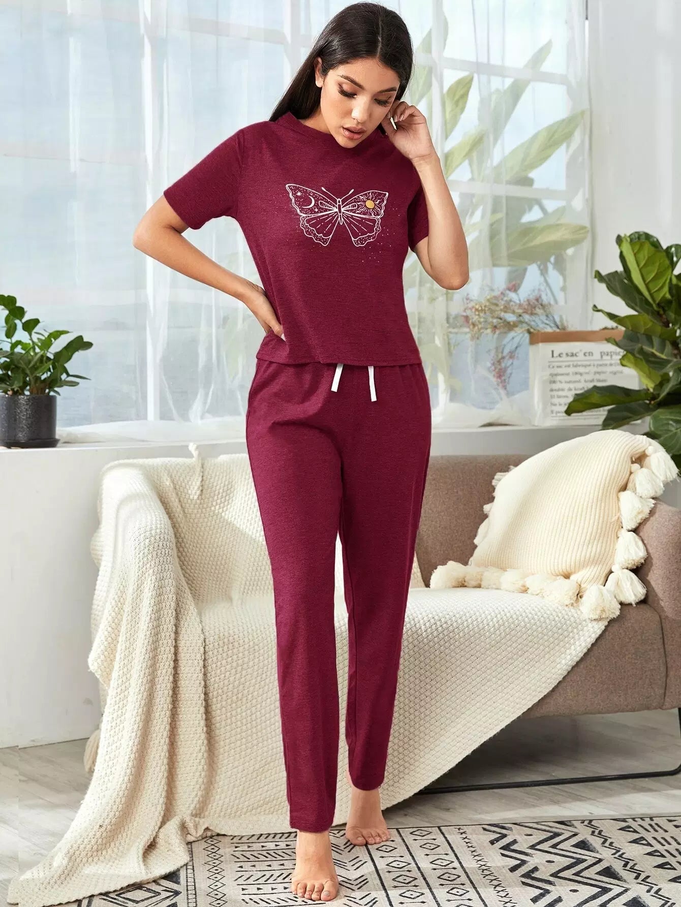 تي شيرت بطبعة فراشات مع بنطلون طقم استراحة مع بنطلون