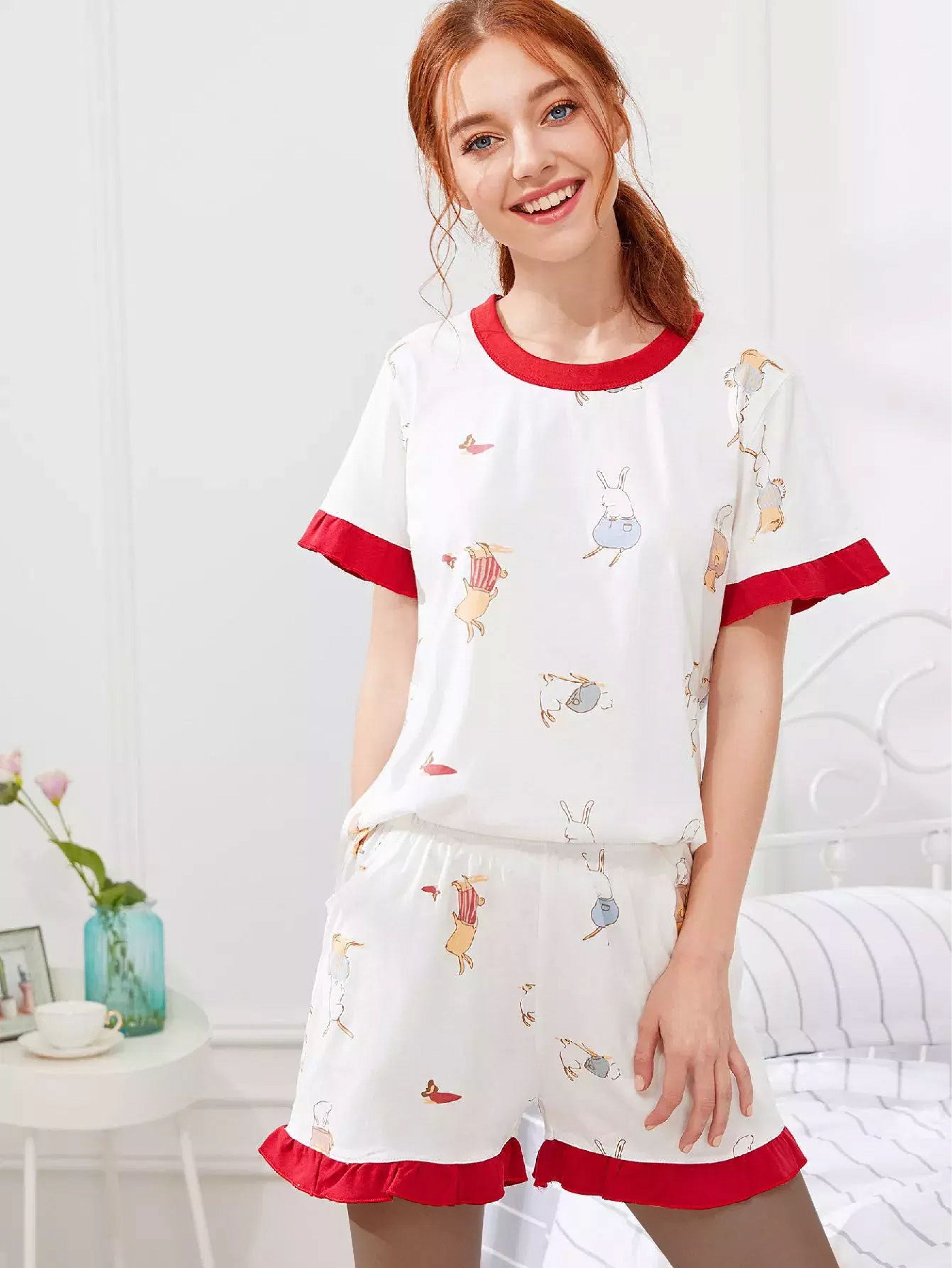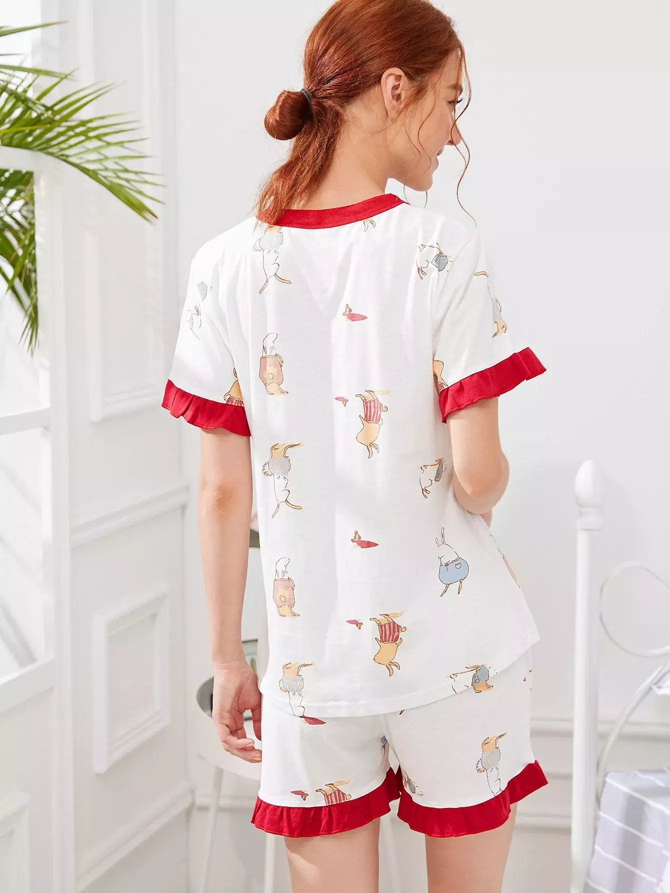 للنساء - طقم بيجامة مطبوع عليه رسوم كارتونية بأطراف متباينة