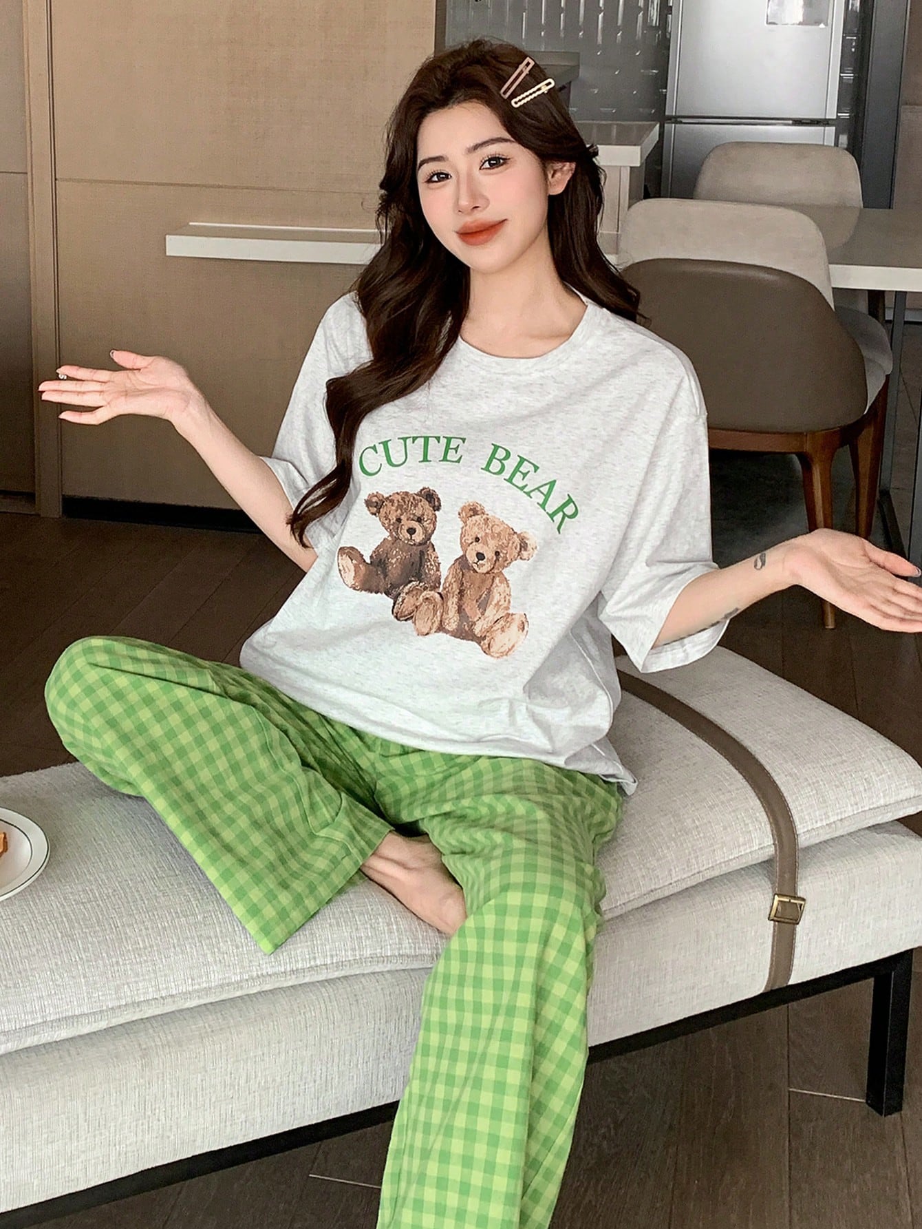 DAZY 2pcs Women Bear Printed Loose Short Sleeve Plaid Pants Pajama Set