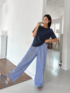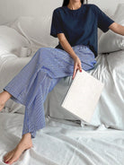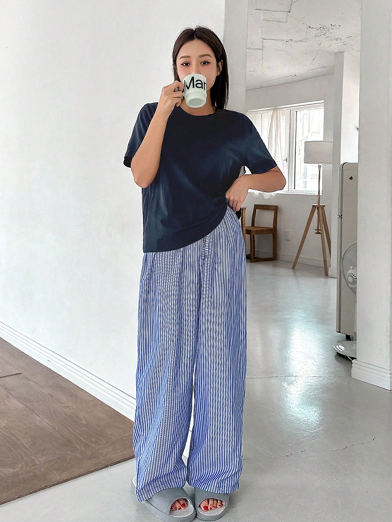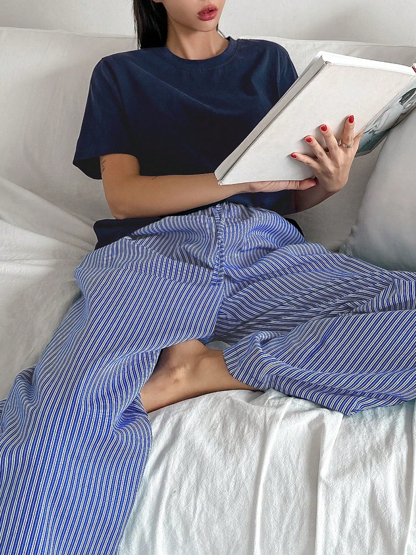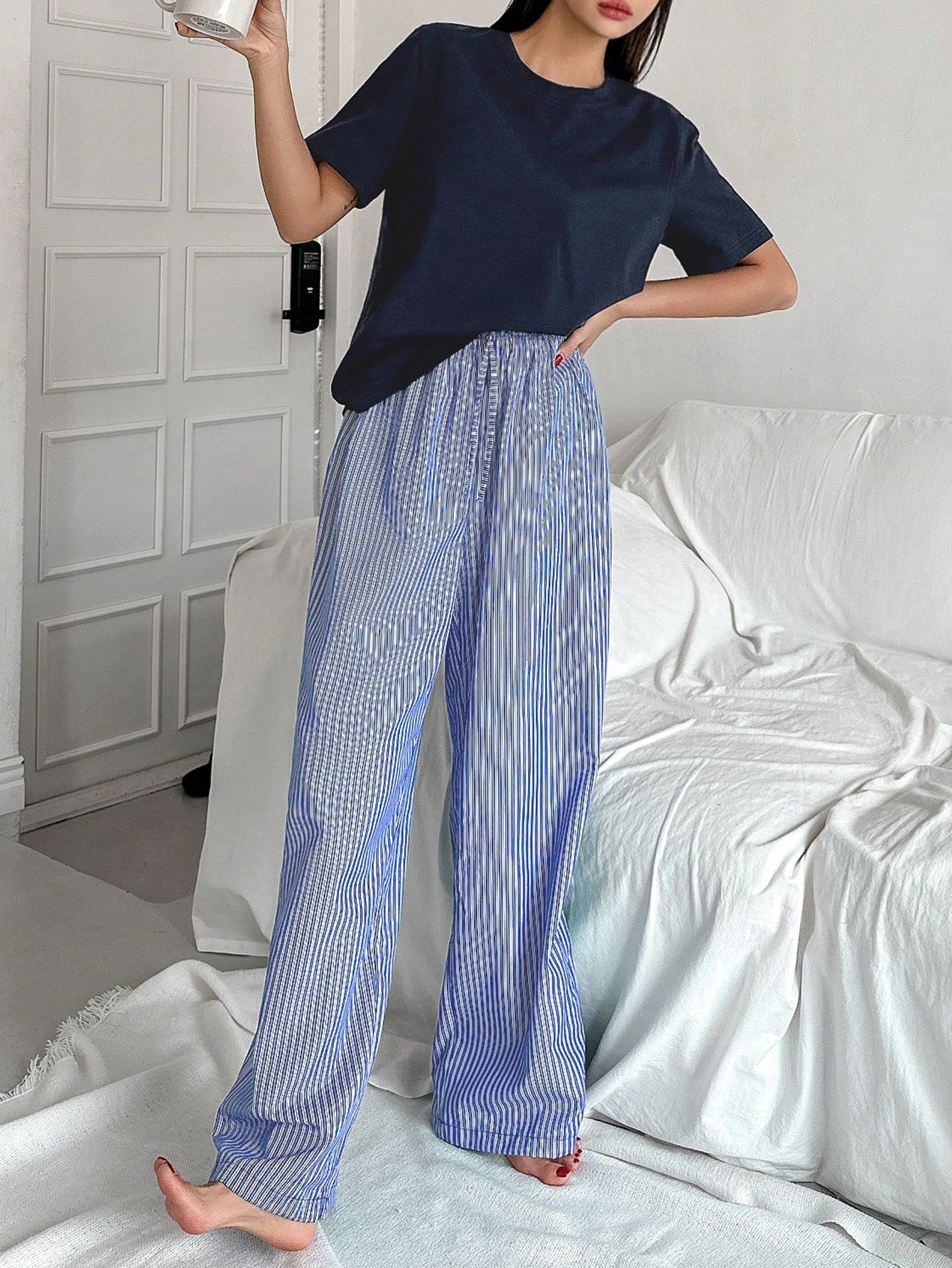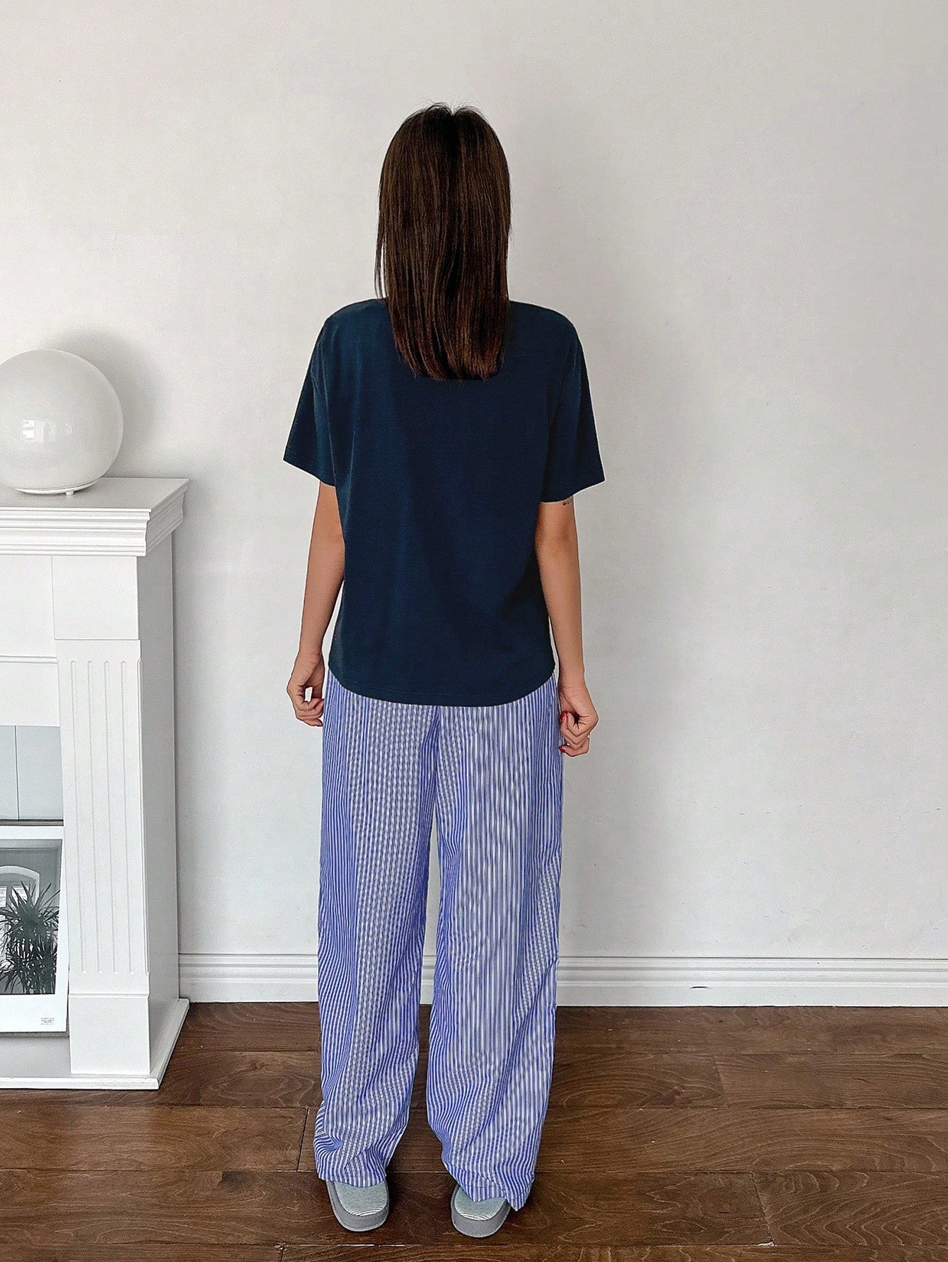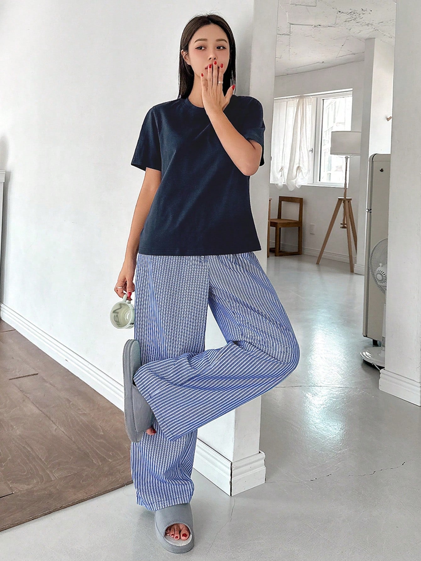 DAZY Minimalist T-Shirt Top + Striped Pajama Pants 2 Pieces Loungewear Set