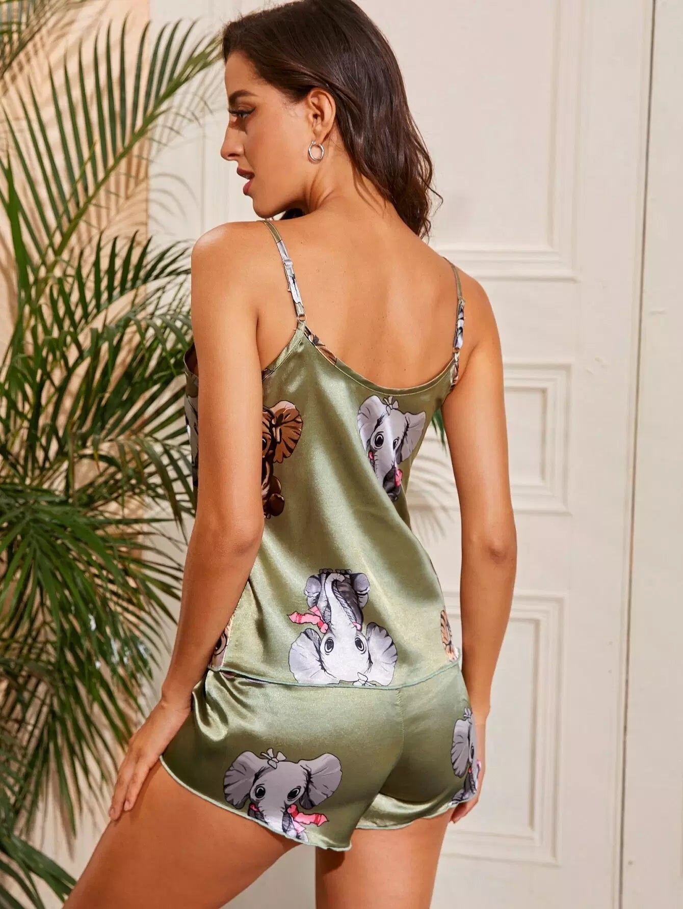 طقم بيجامة وبنطلون قصير من الساتان بطبعة فيلة