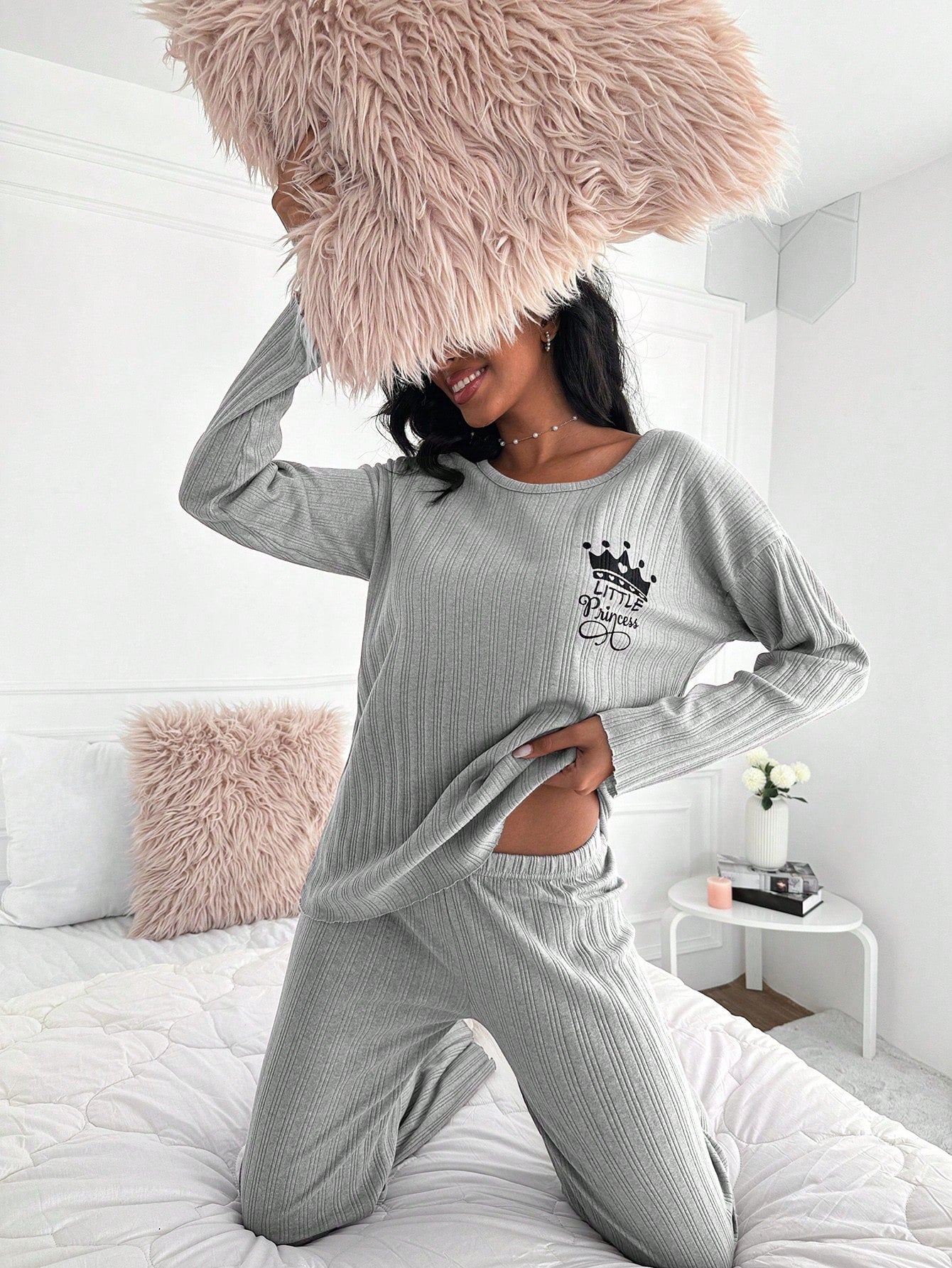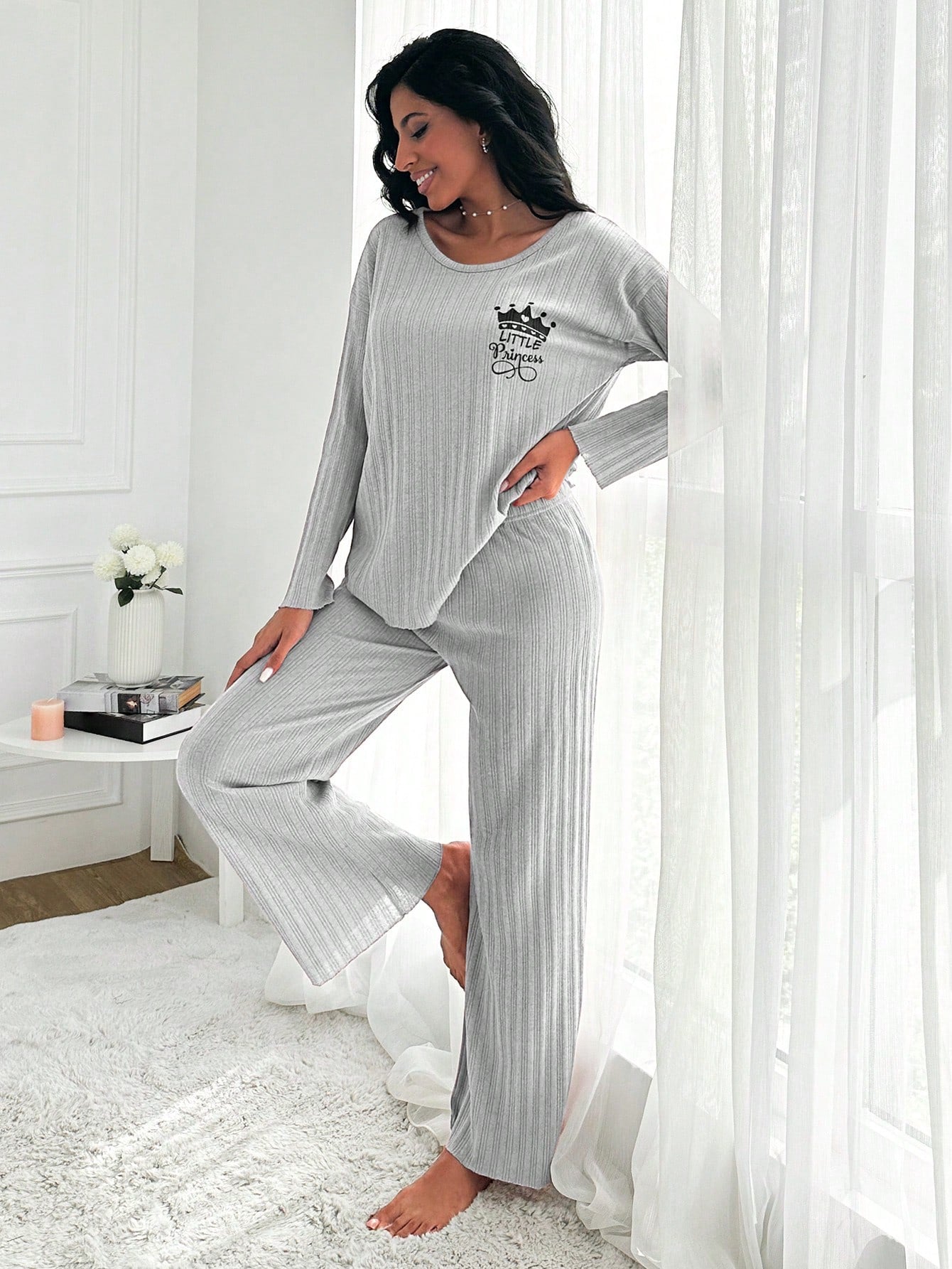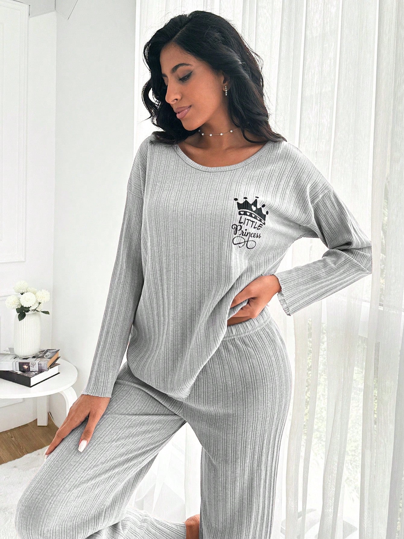 طقم ملابس رياضية نسائية من EURMUSE، مصنوع من القطن الخالص 100%، مزين بطبعة تاج وحروف، بياقة دائرية وأكتاف منسدلة، مكون من سويت شيرت وبنطال.
