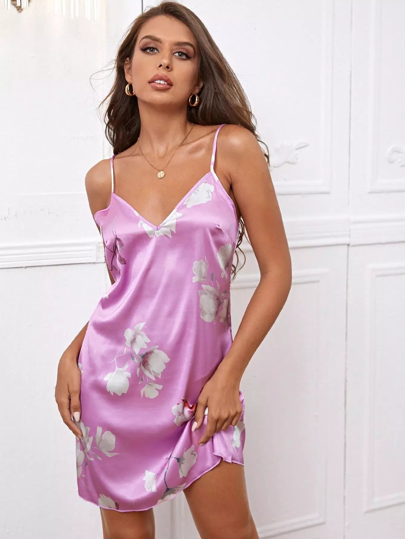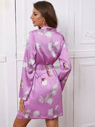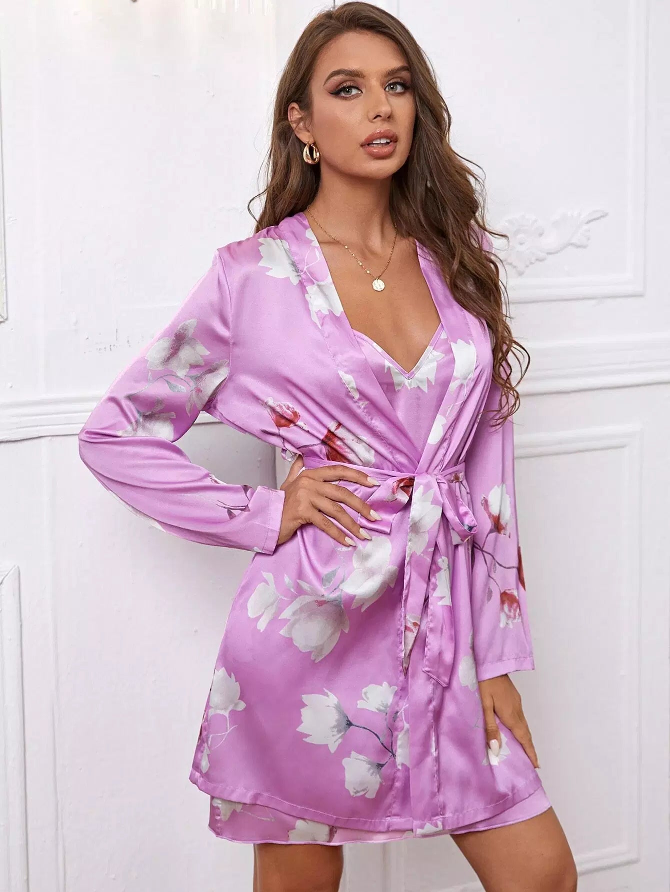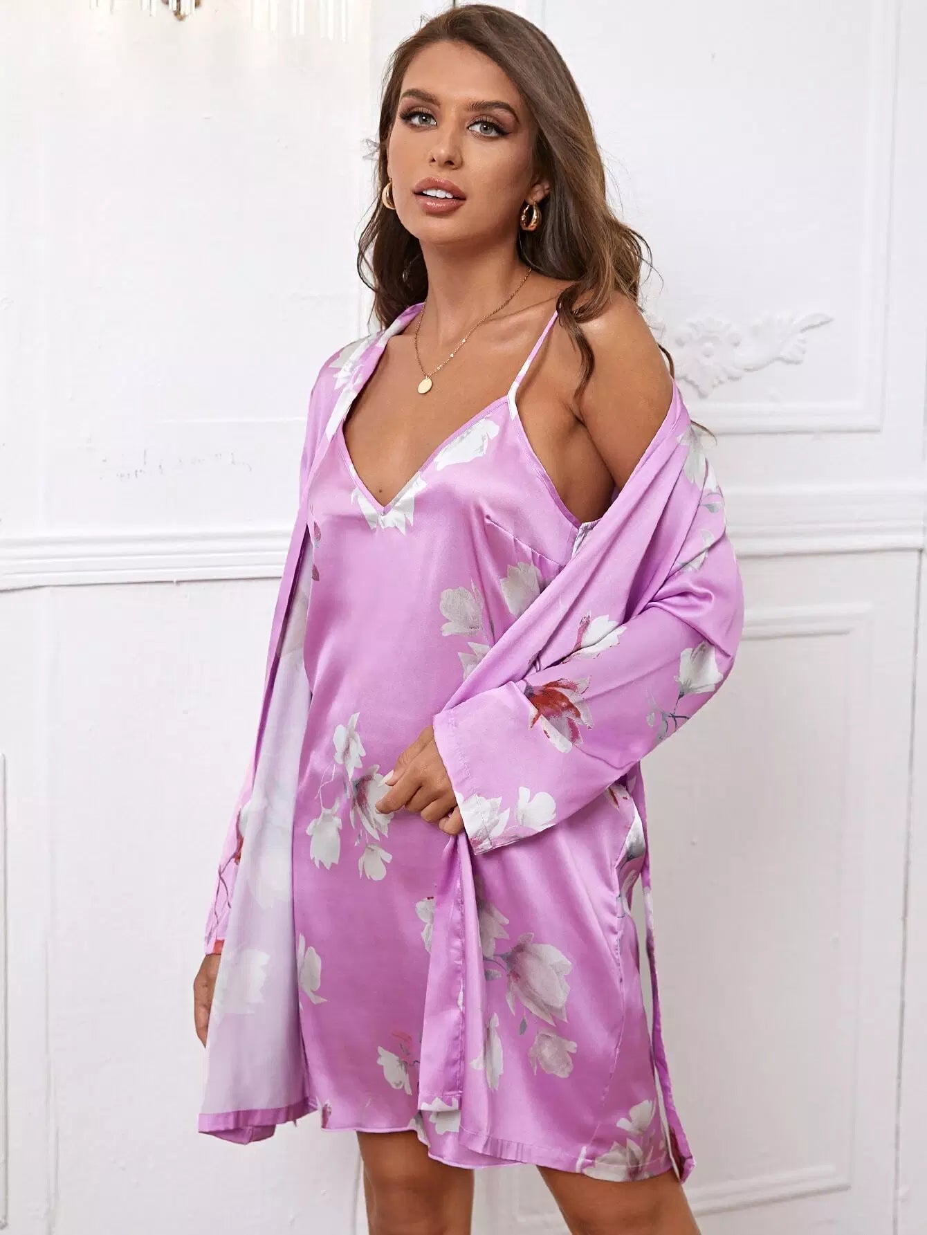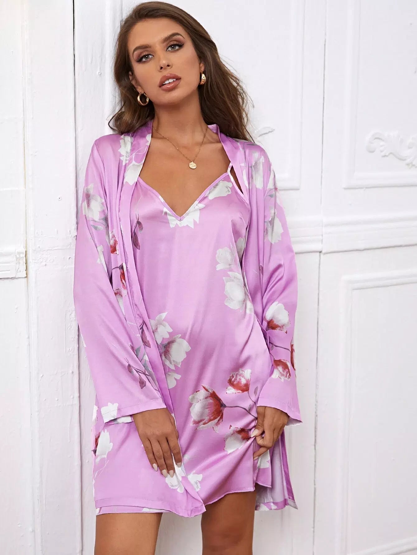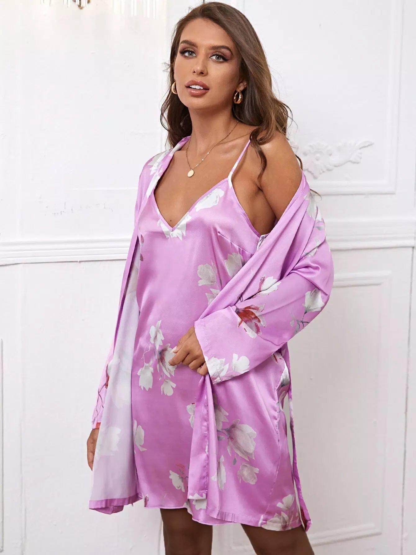 طقم نوم ساتان بطبعة زهور بدون حزام
