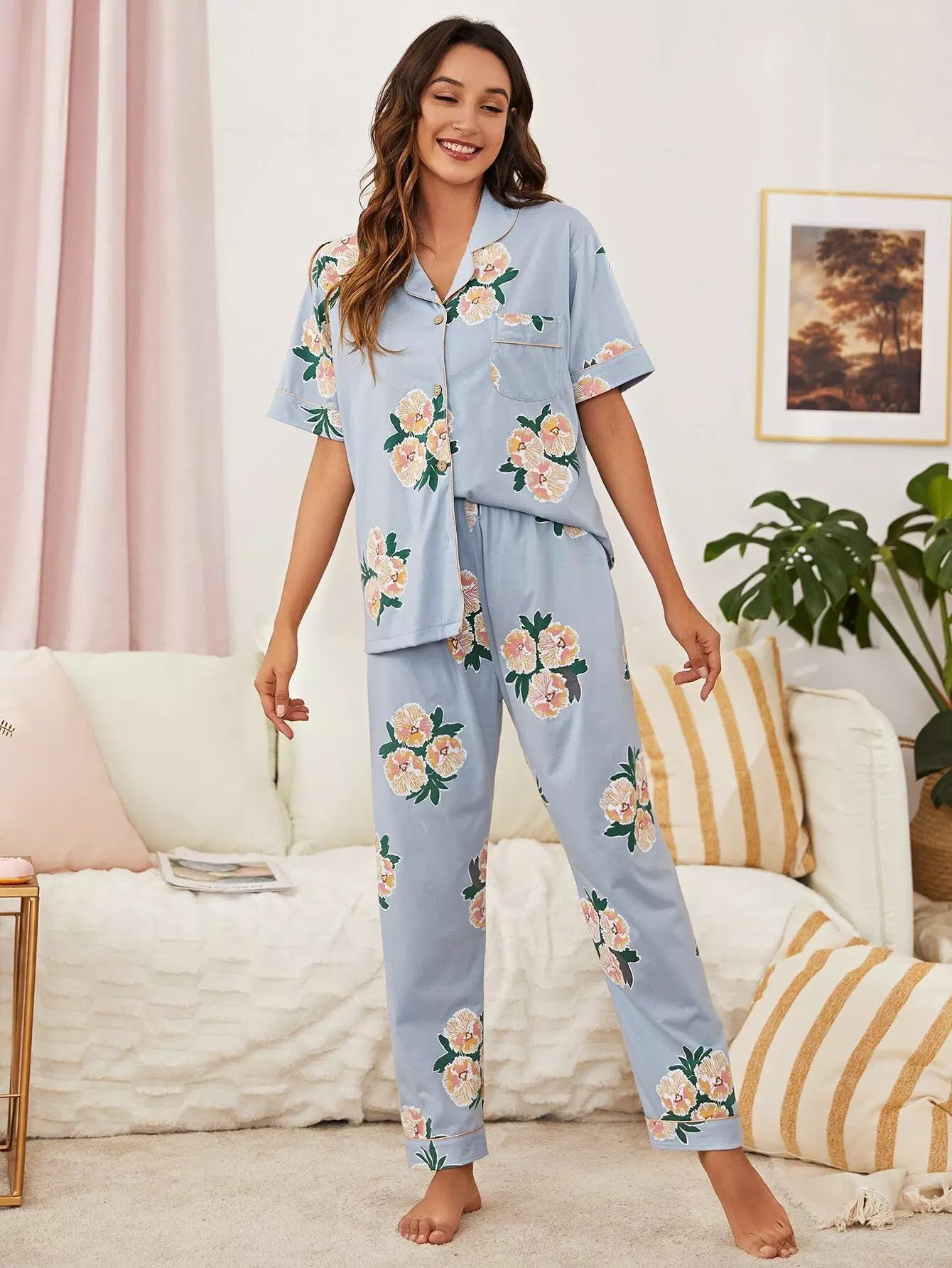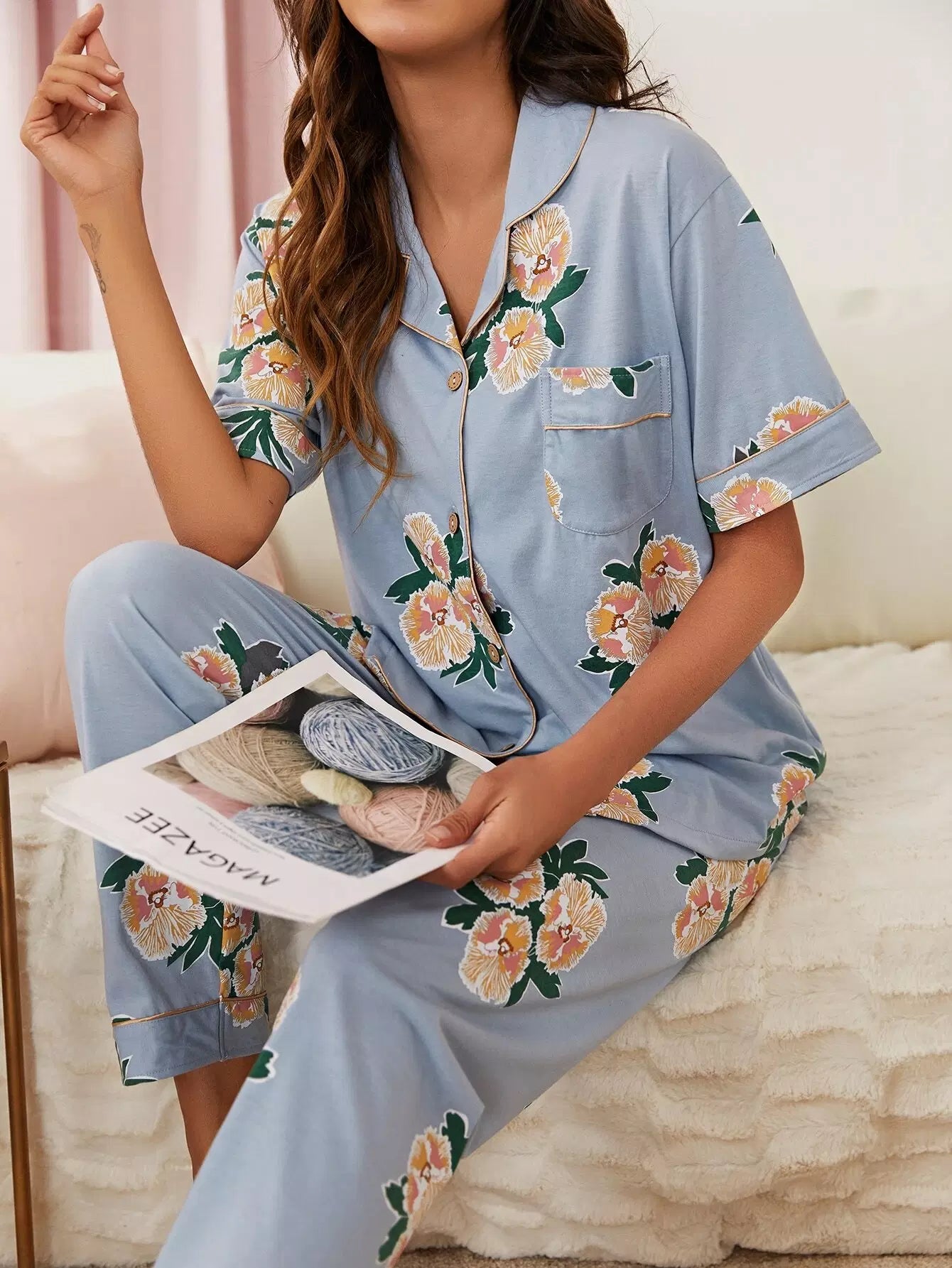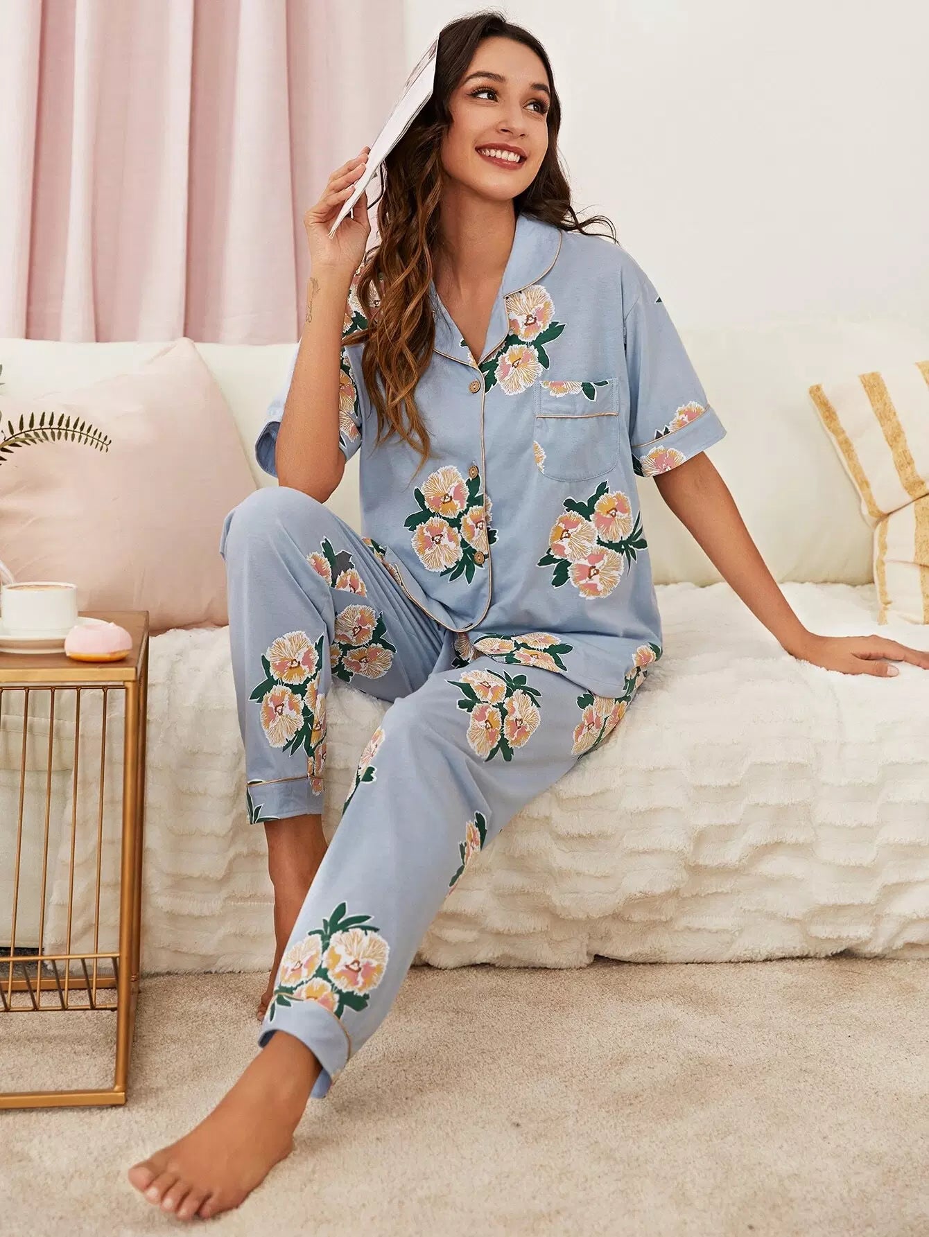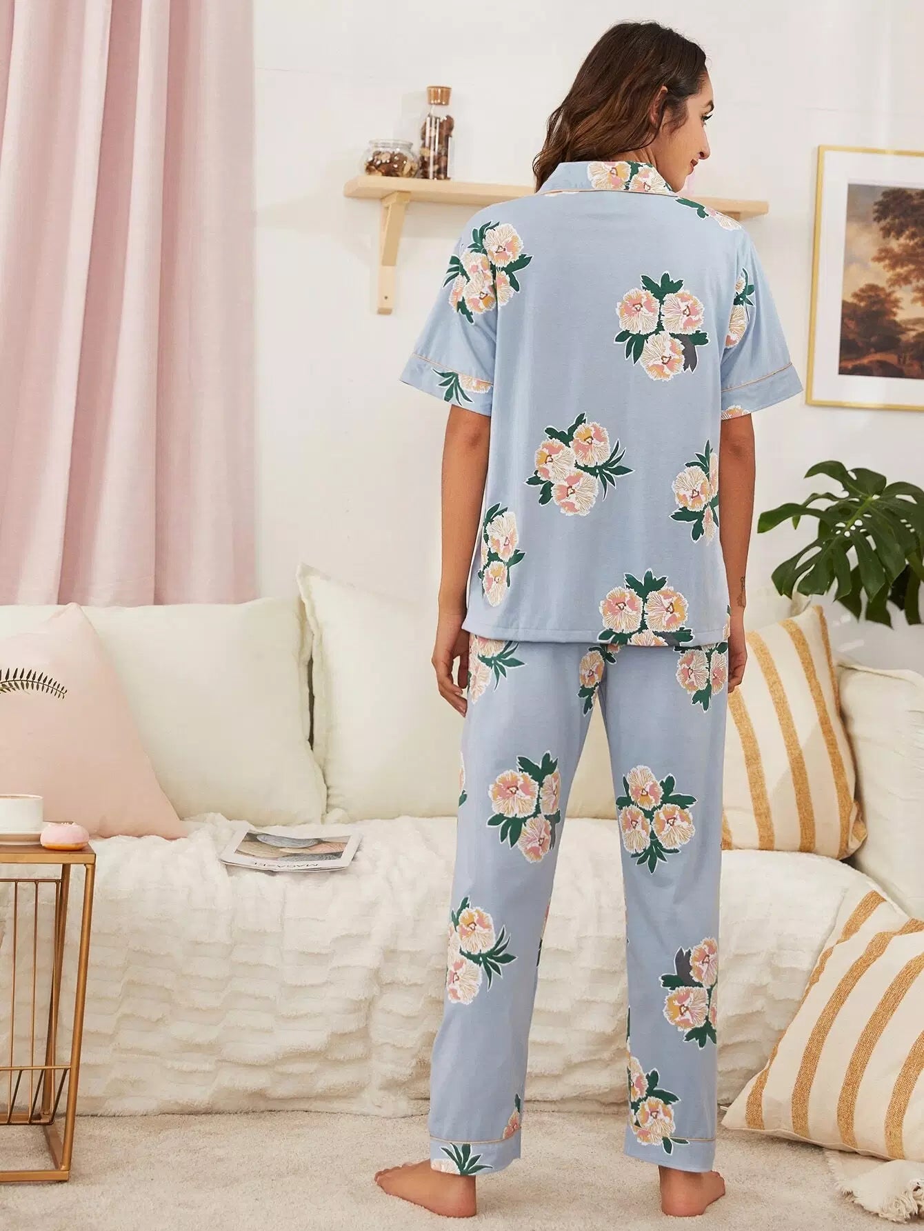 طقم بيجامة مطبوع عليه أزرار أمامية بأزرار مطبوعة بالزهور