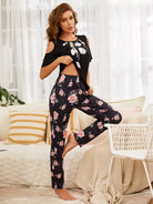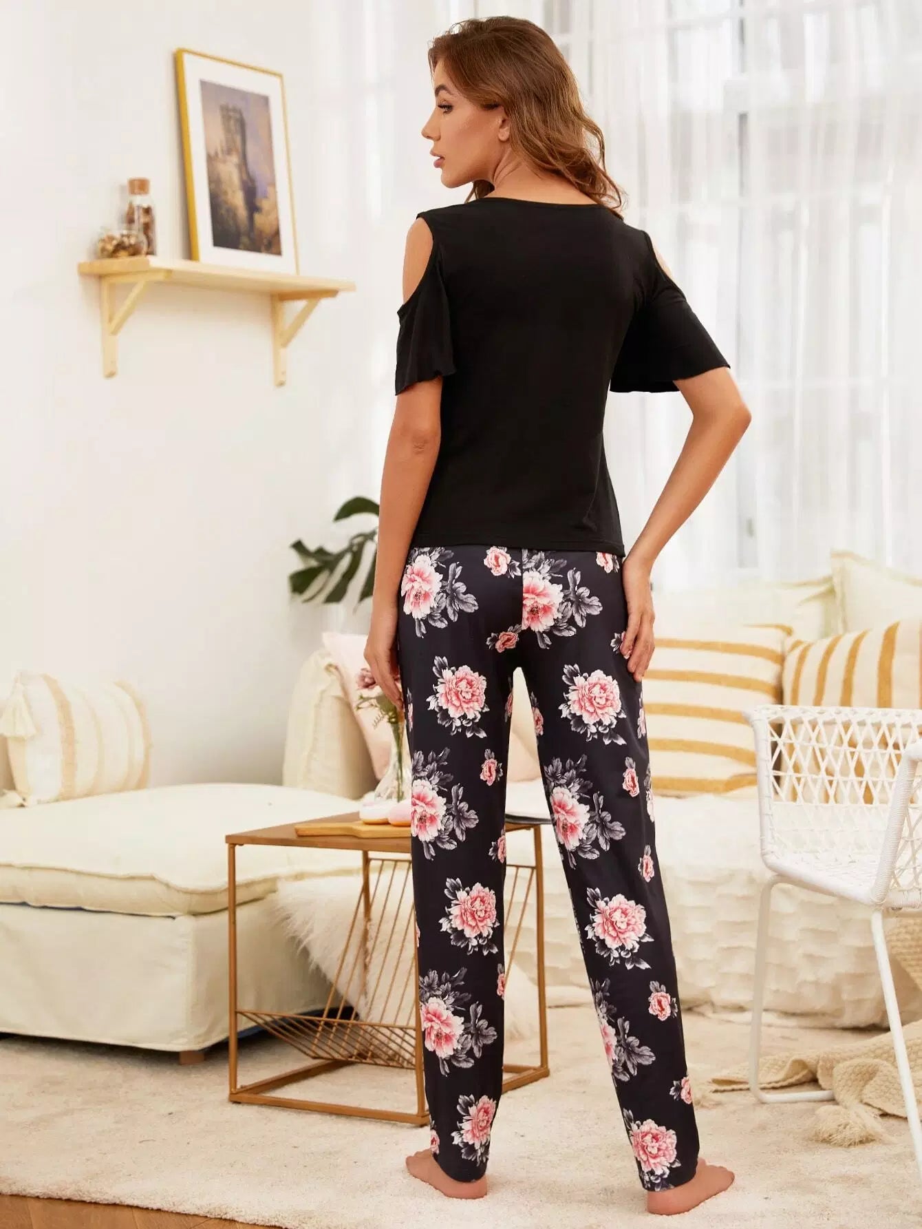 طقم بيجامة بأكتاف باردة مطبوع عليه زهور