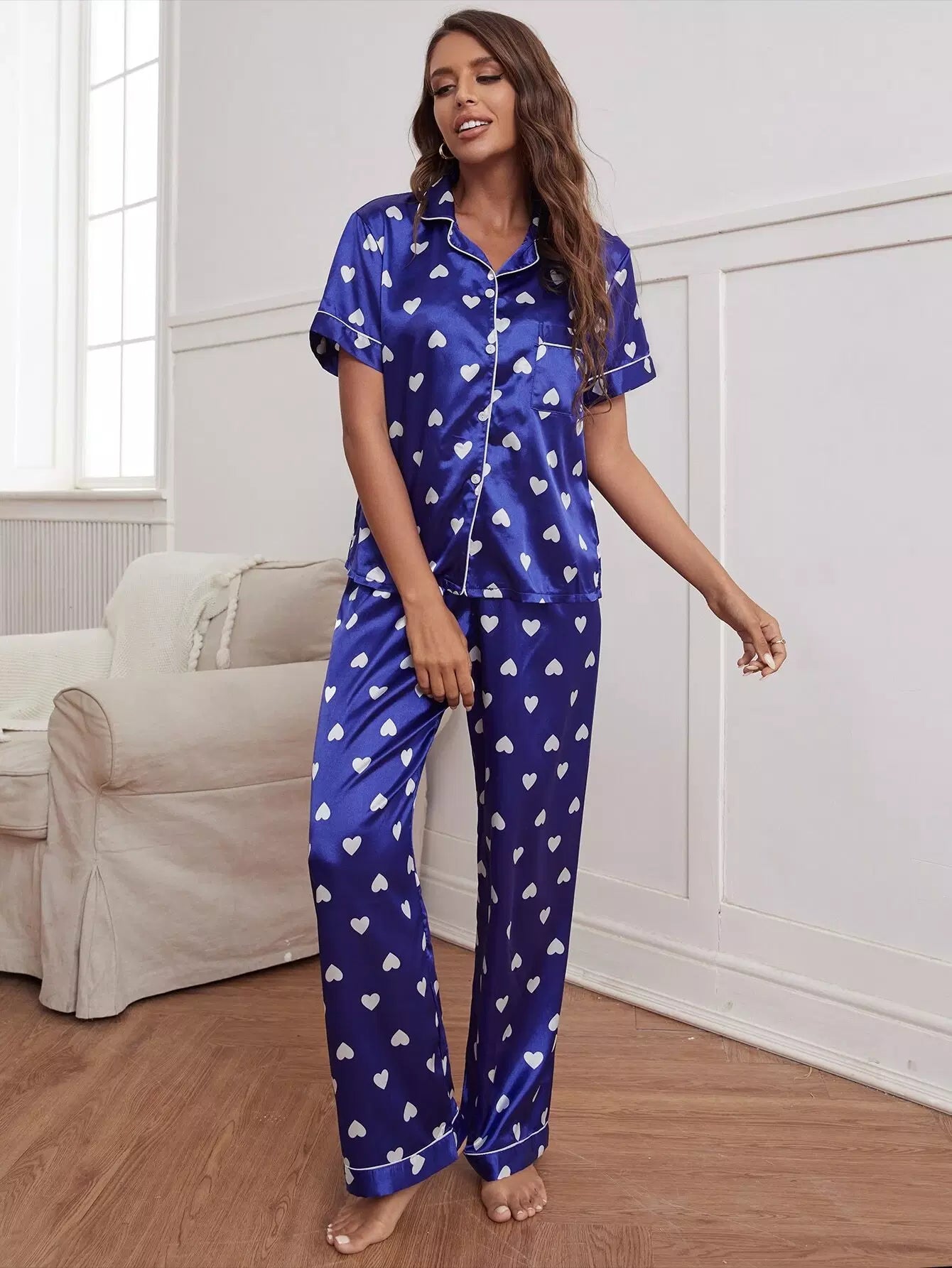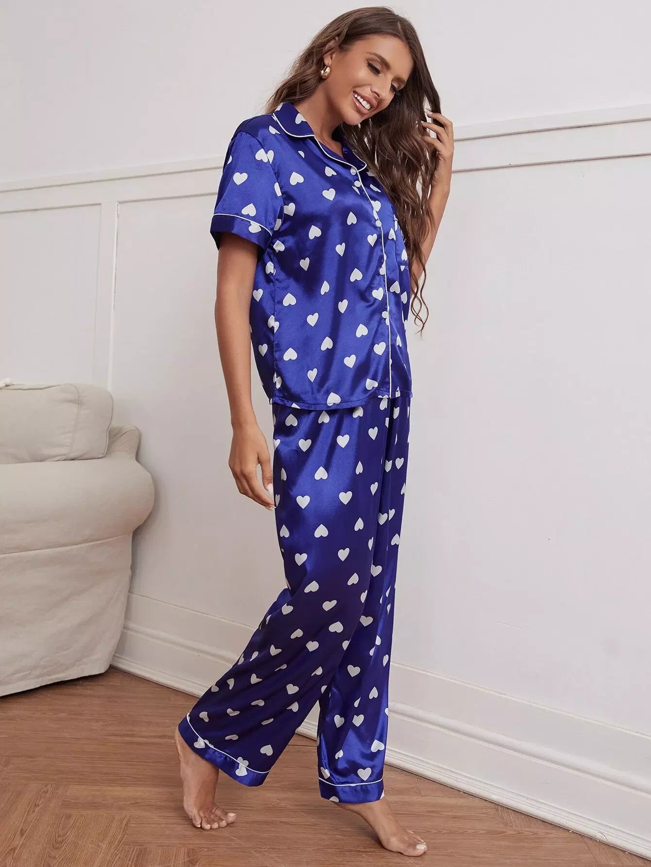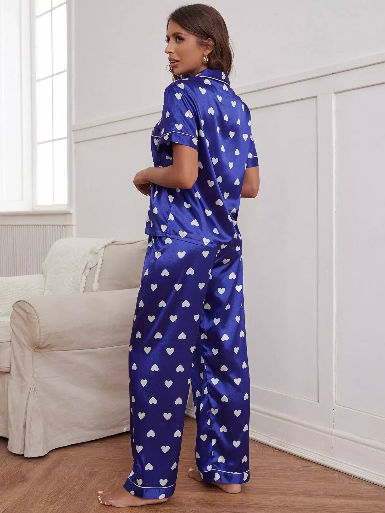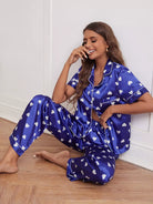 طقم بيجامة ساتان ساتان مطبوع عليه قلب مطبوع عليه قلب