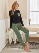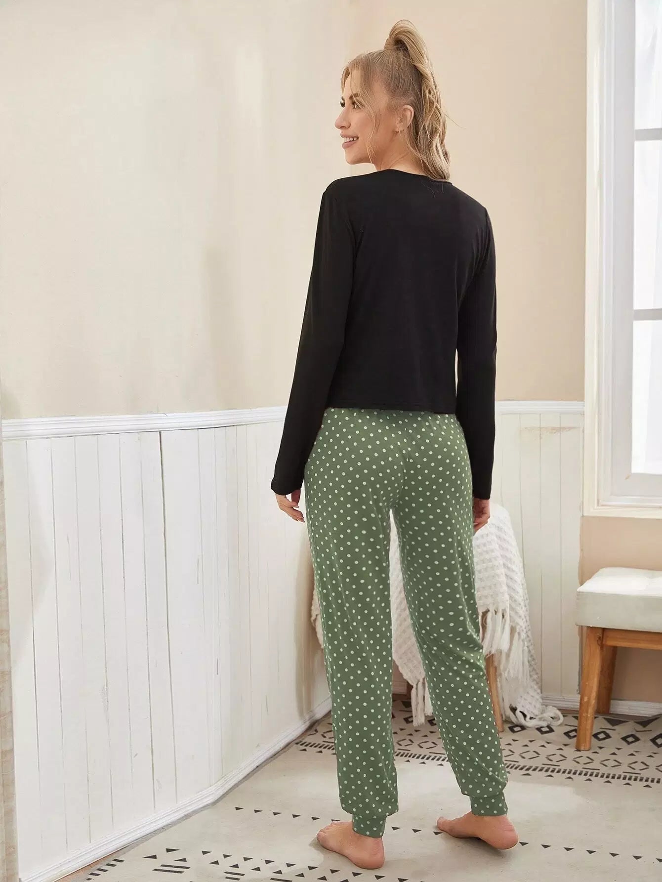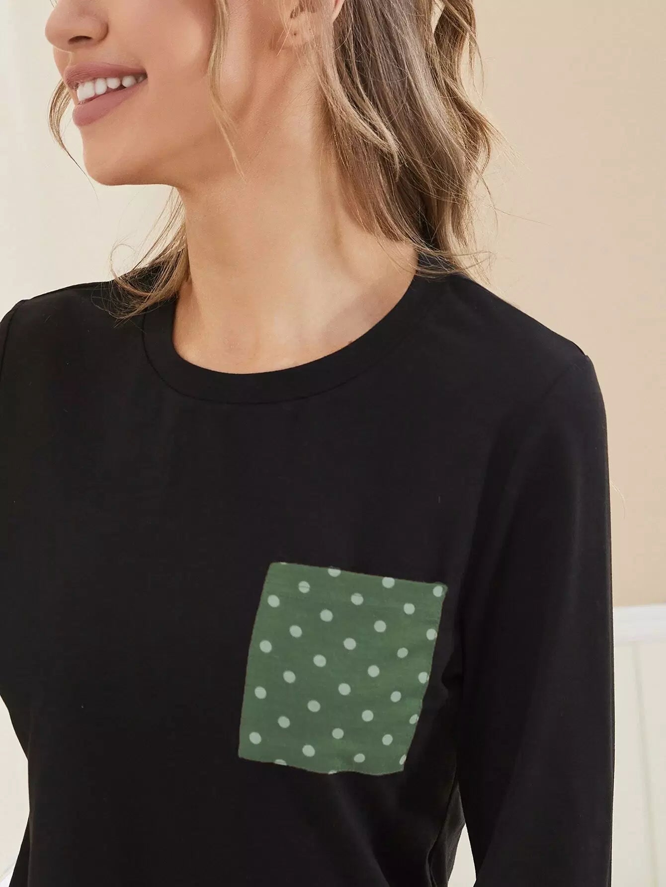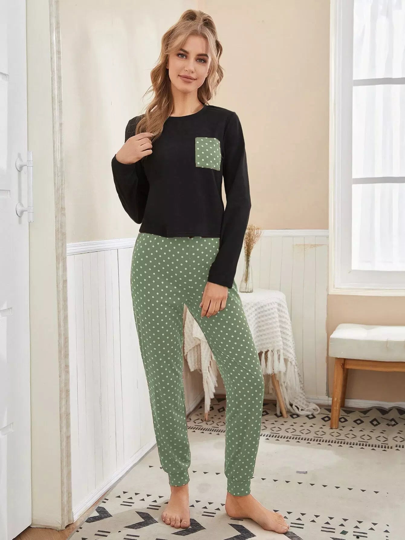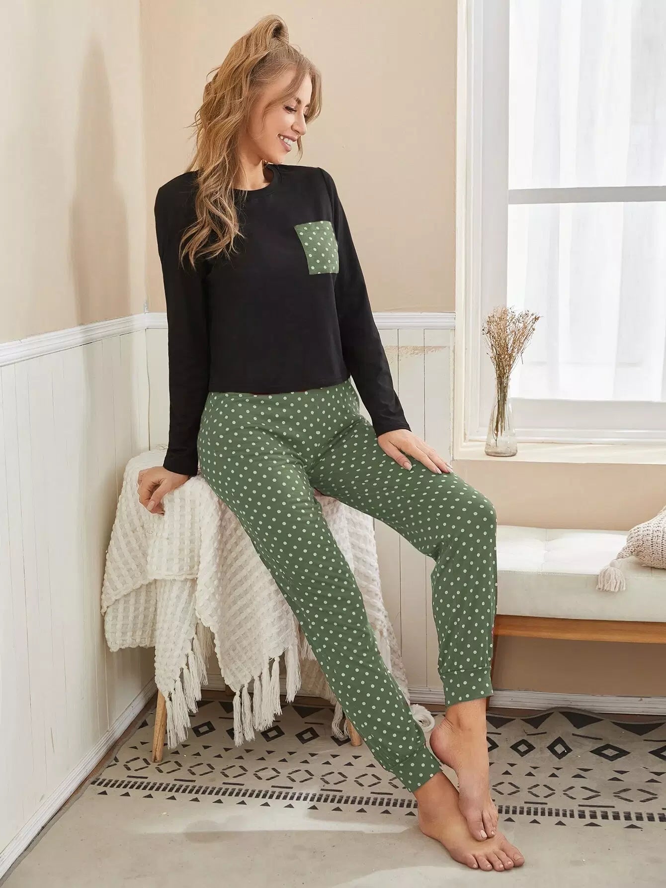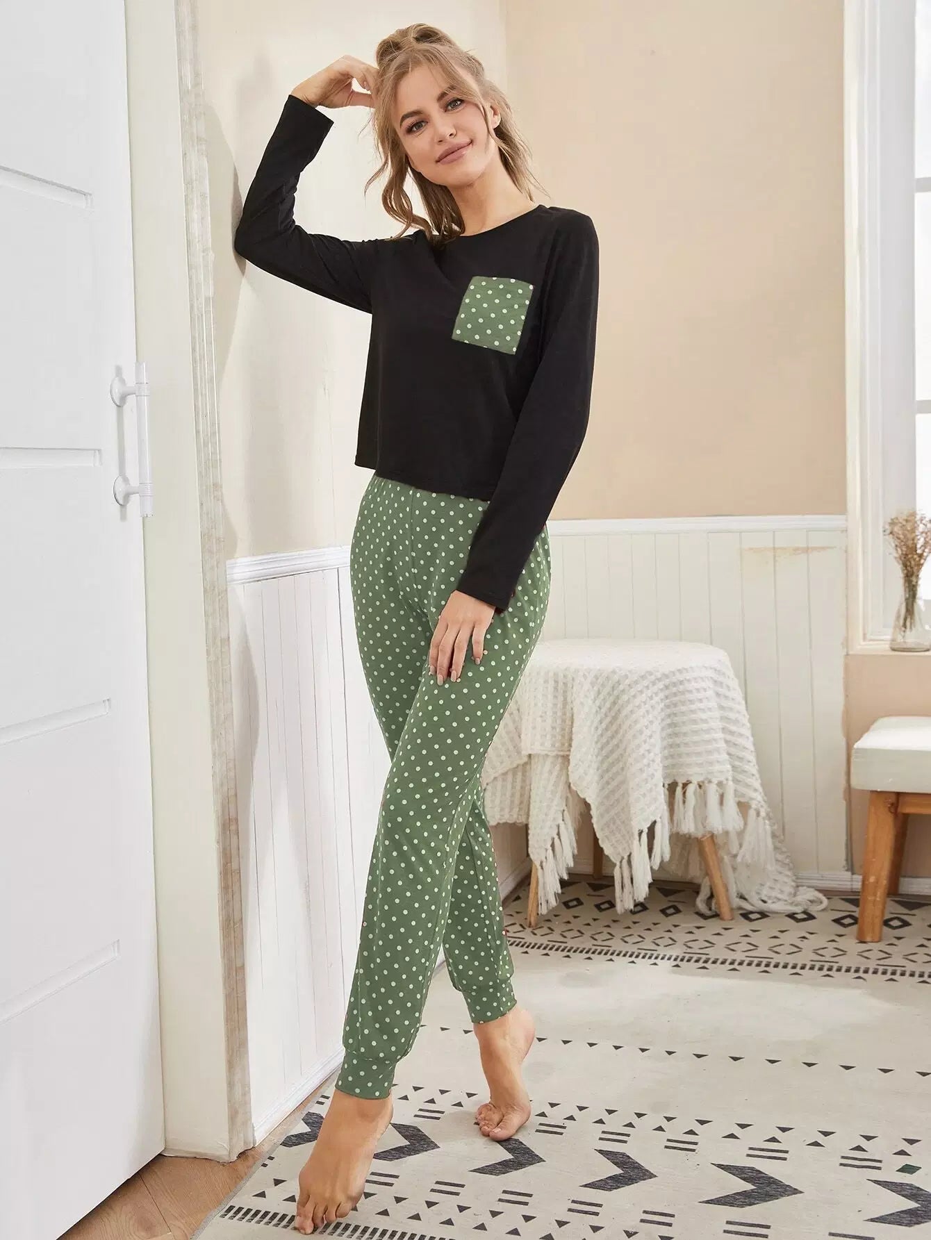 طقم بيجامة بجيب أمامي منقّط منقّط