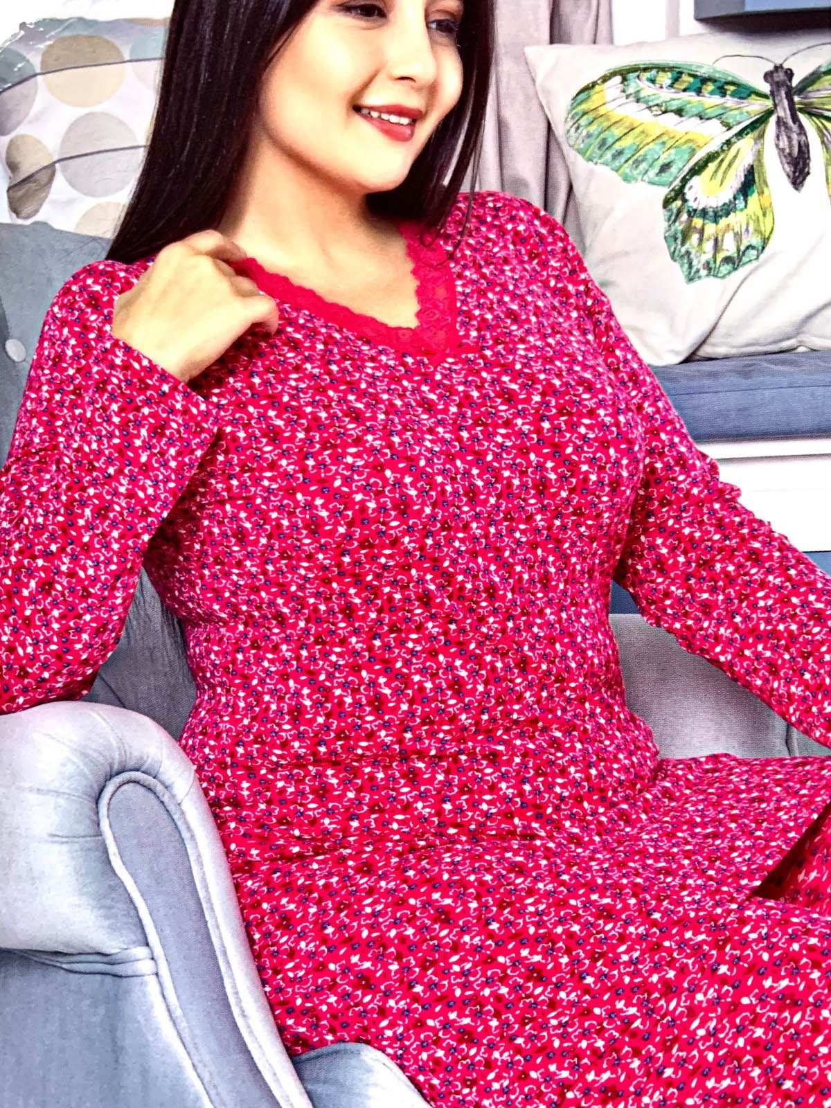 النساء - بيجامة حمراء مع طباعة زهور بيضاء وزرقاء