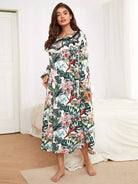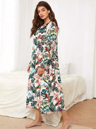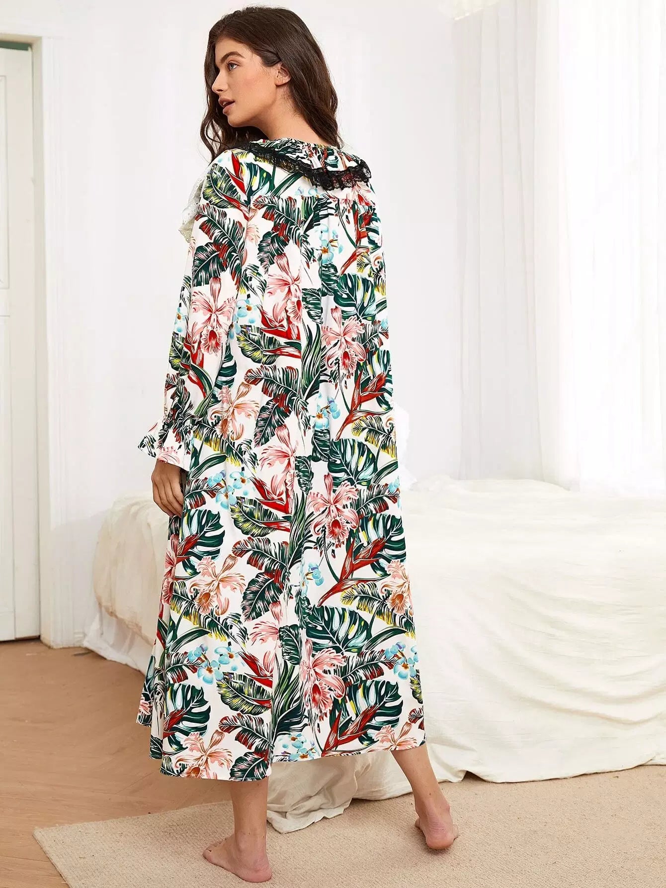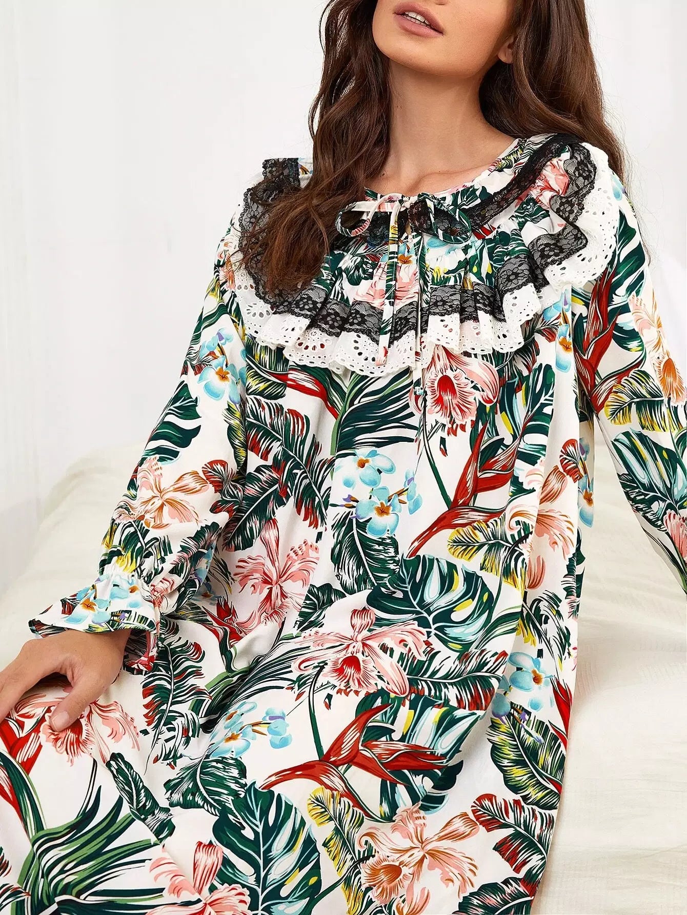 فستان نوم من الدانتيل بطبعة استوائية بربطة عنق بربطة عنق بلون مغاير