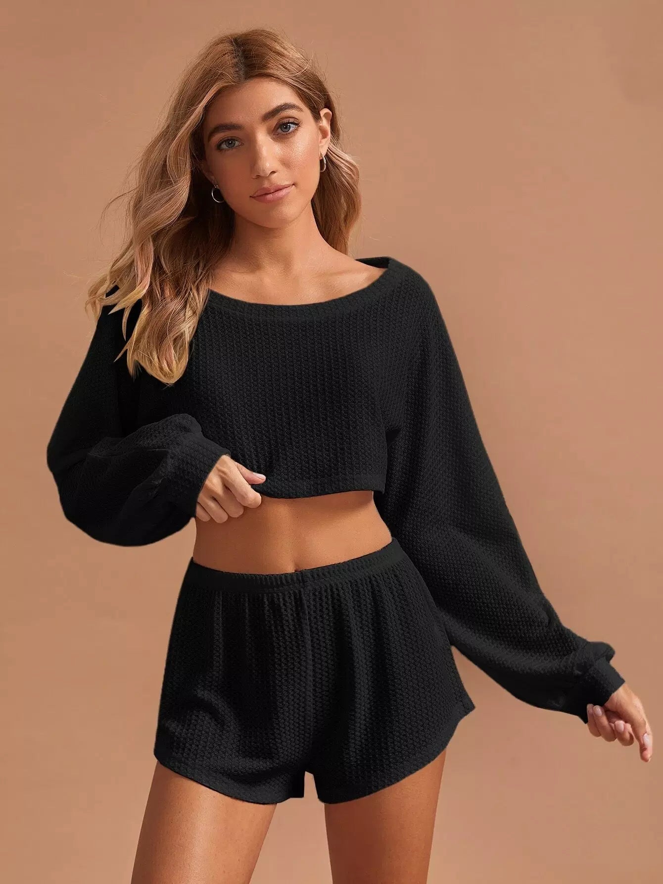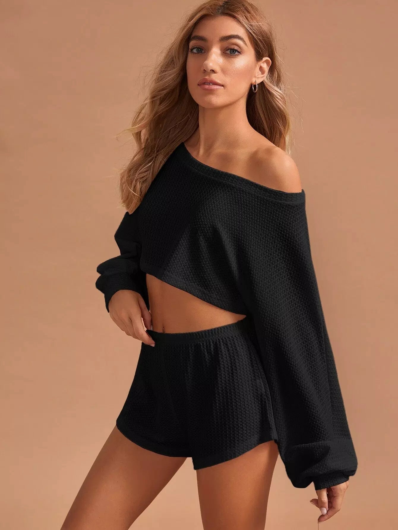 طقم تي شيرت قصير بياقة قارب محبوكة بفتحة رقبة على شكل وافل وشورت بيجامة