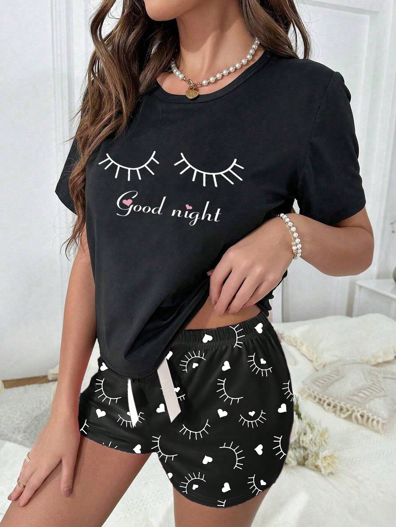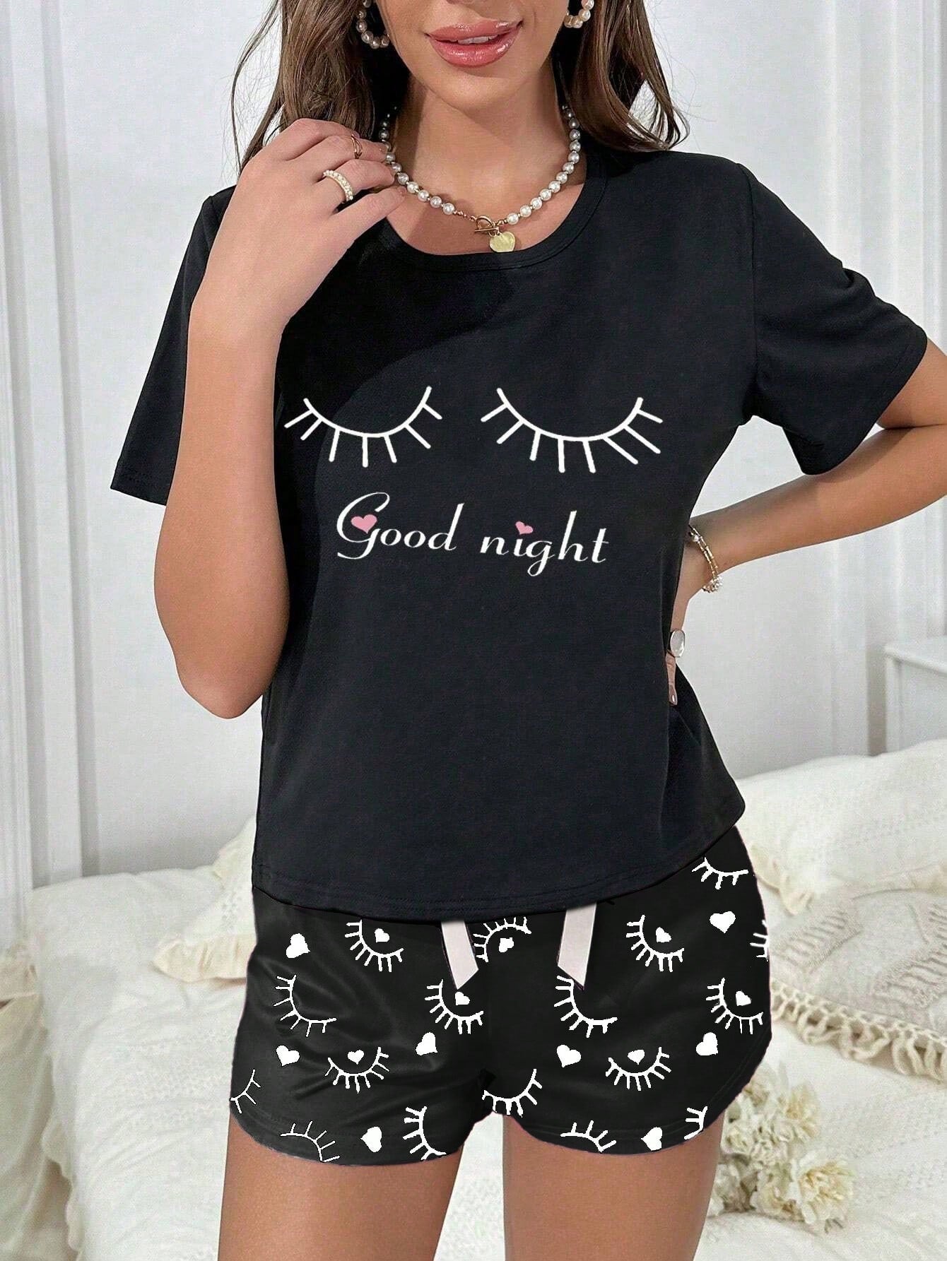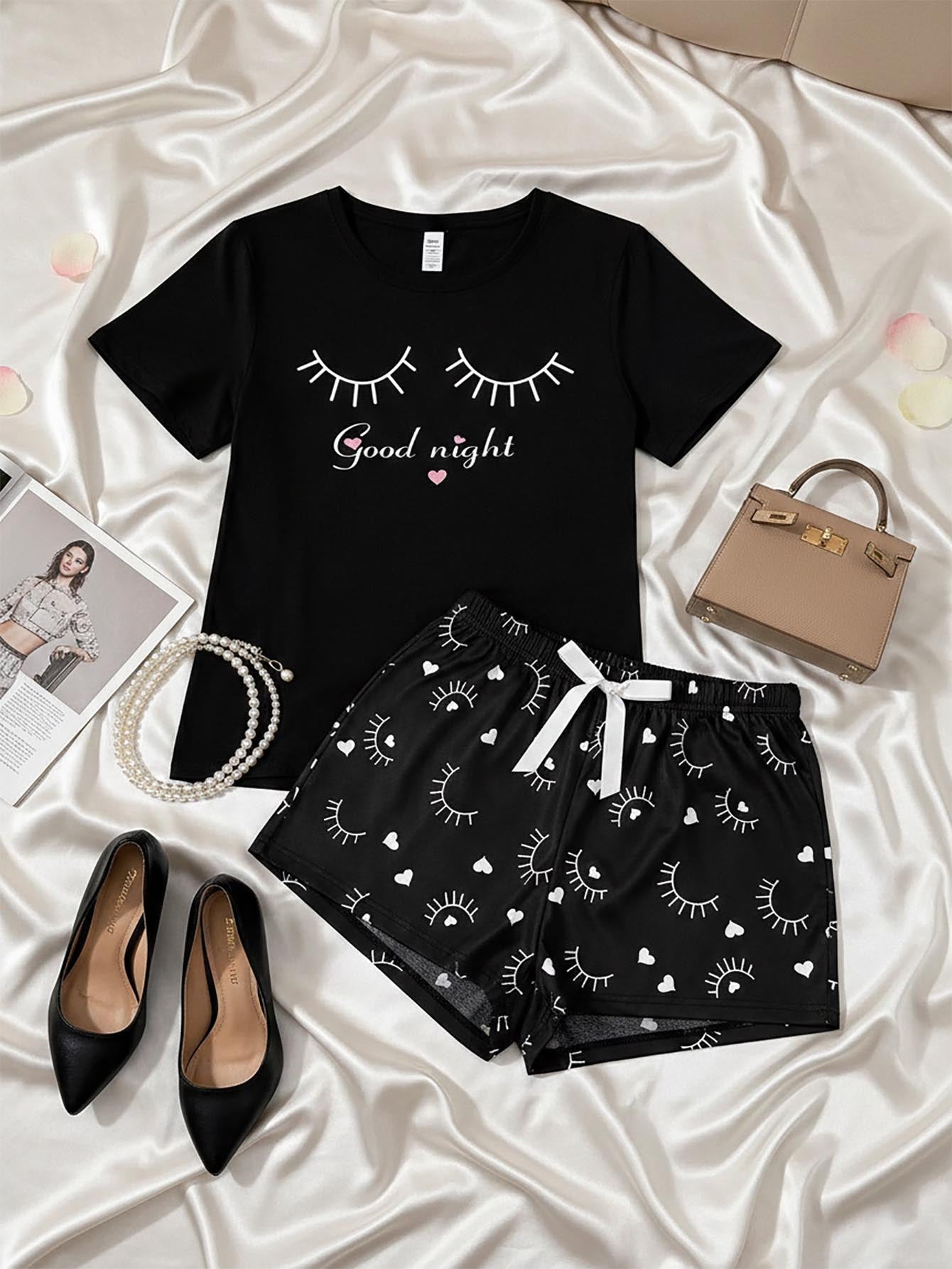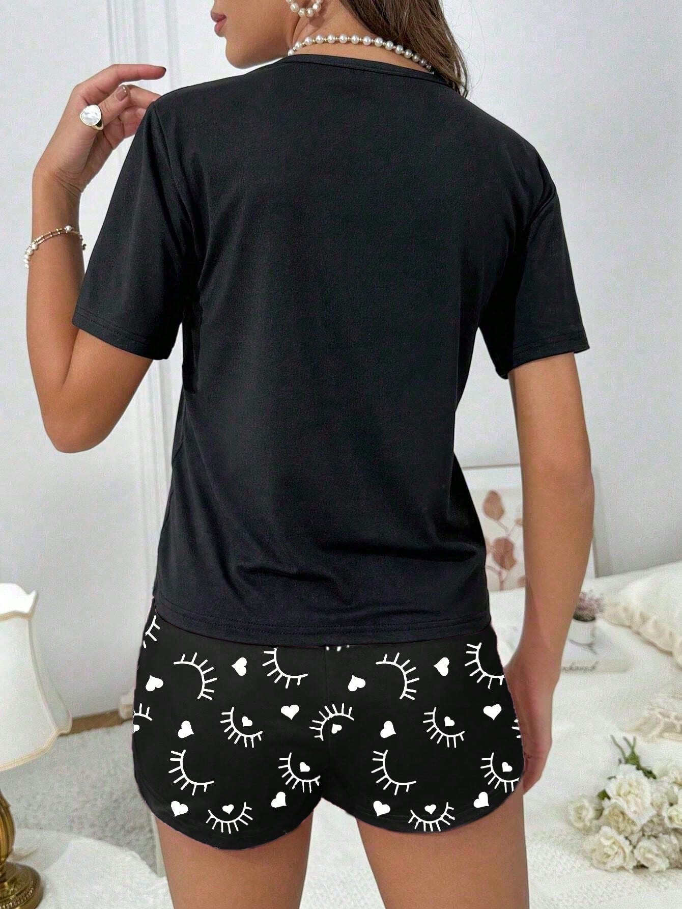 طقم بيجاما نسائي بأكمام قصيرة وشورت مطبوع عليه شعار