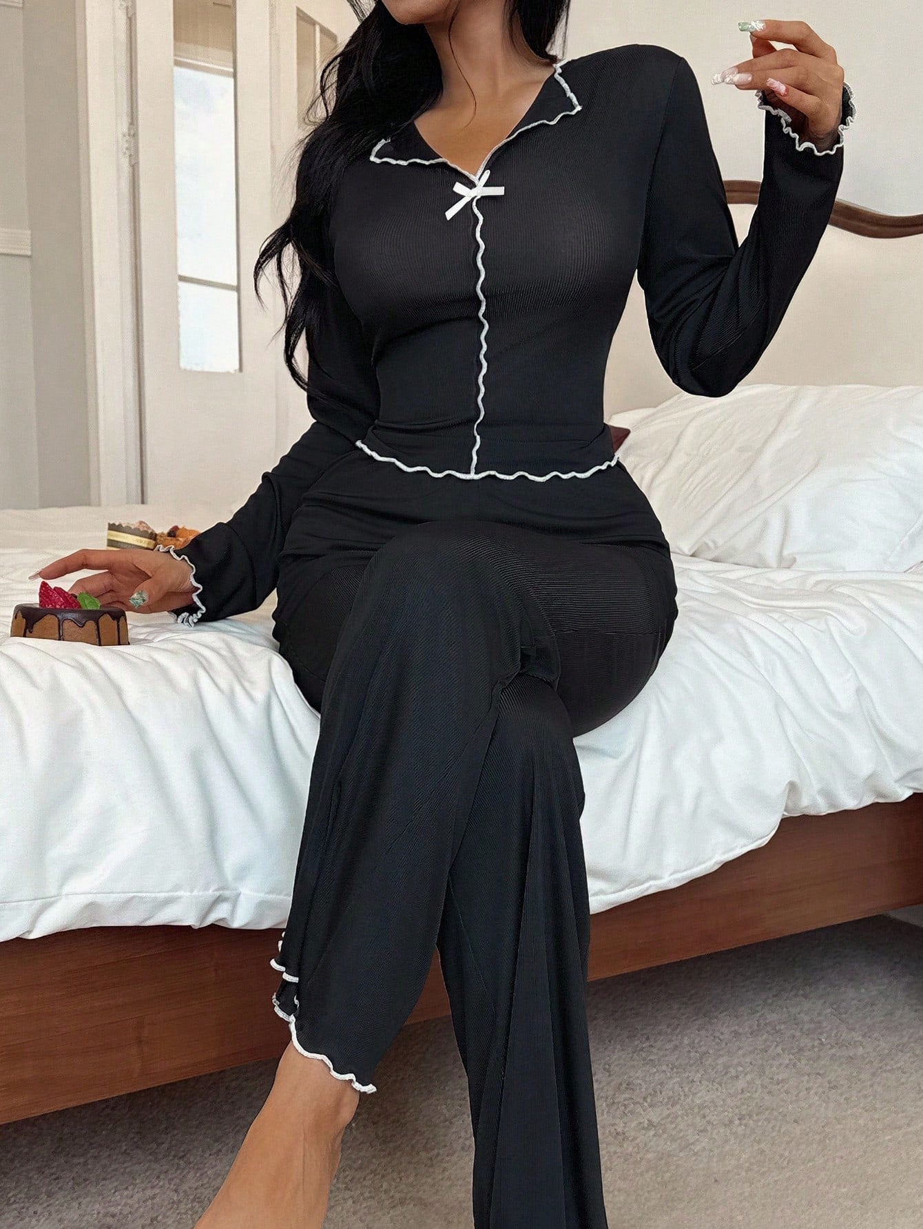 طقم بيجاما نسائي أسود وأبيض بتصميم ضيق وأكمام طويلة وبنطال