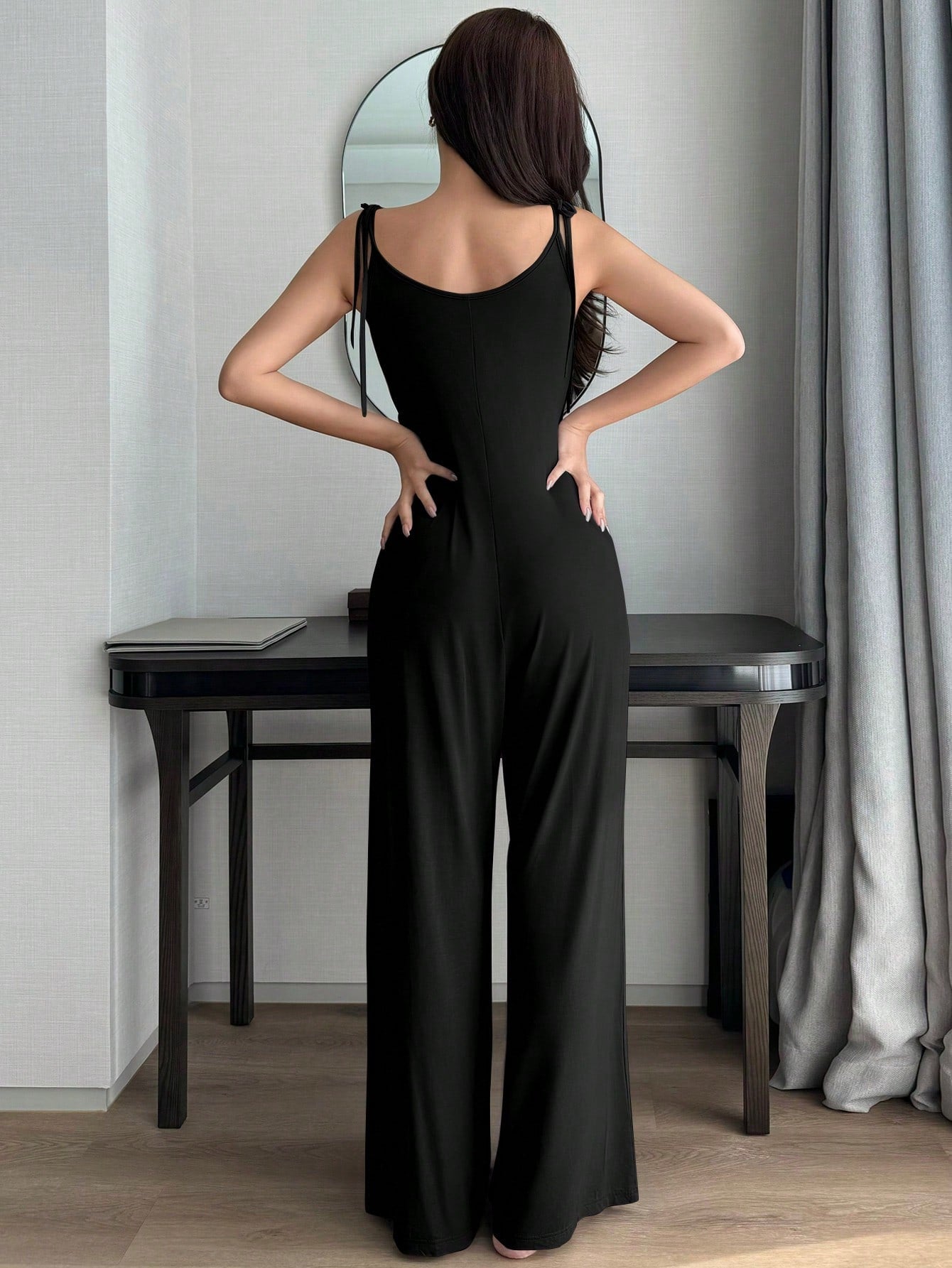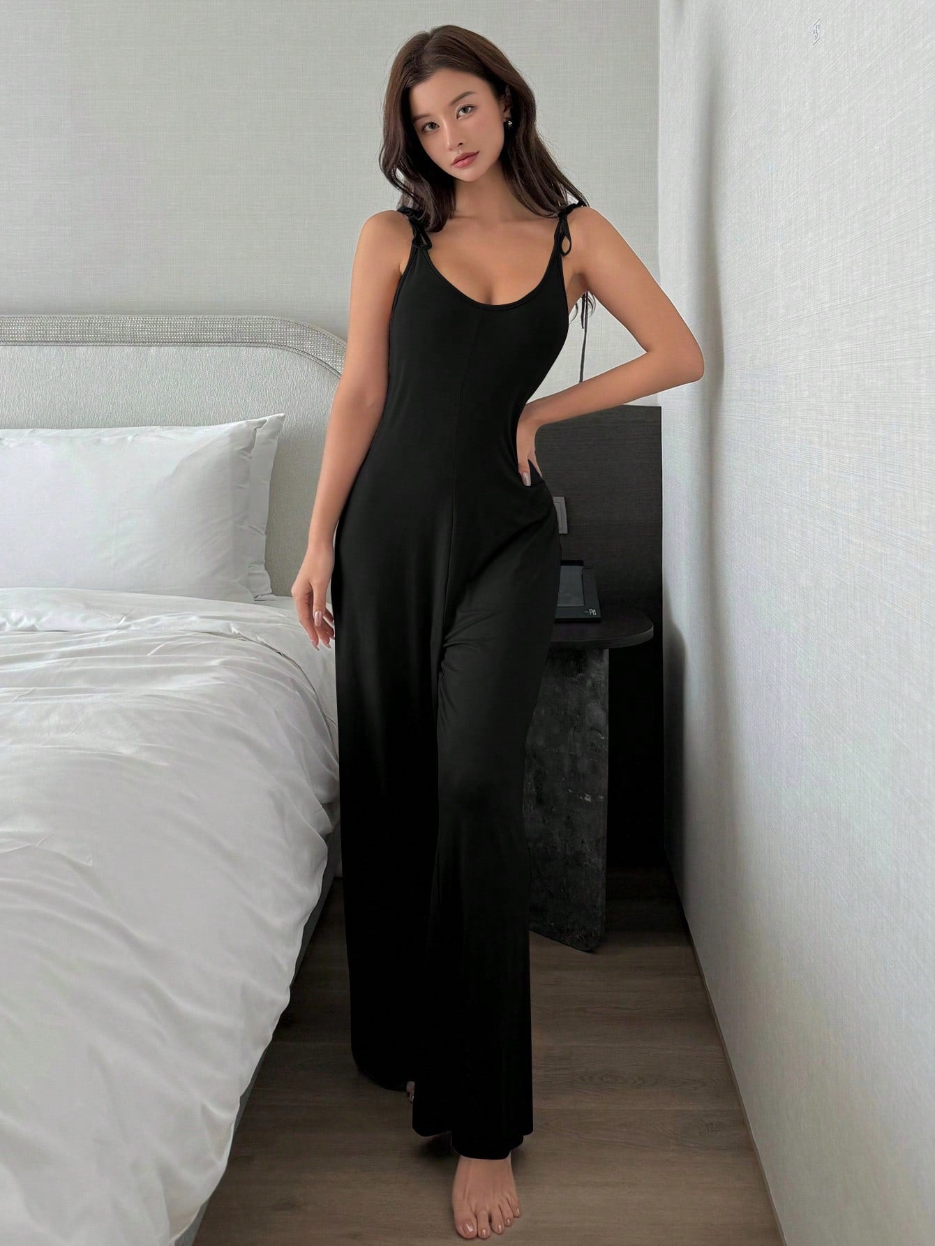 بدلة نوم سوداء محبوكة برباط من قطعة واحدة من DAZY، ملابس منزلية مريحة